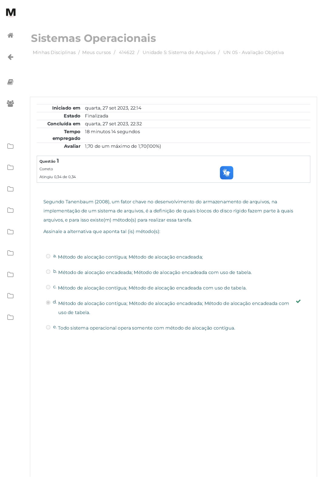 05/10/2023, 23:28 UN 05 - Avaliação Objetiva: Revisão da tentativa https://avap.multivix.edu.br/mod/quiz/review.php?attempt=3991420&cmid=1525165 1/5 Minhas Disciplinas / Meus cursos / 414622 / Unidade 5: Sistema de Arquivos / UN 05 - Avaliação Objetiva Sistemas Operacionais Iniciado em quarta, 27 set 2023, 22:14 Estado Finalizada Concluída em quarta, 27 set 2023, 22:32 Tempo empregado 18 minutos 14 segundos Avaliar 1,70 de um máximo de 1,70(100%) Questão 1 Correto Atingiu 0,34 de 0,34 Segundo Tanenbaum (2008), um fator chave no desenvolvimento do armazenamento de arquivos, na implementação de um sistema de arquivos, é a de�nição de quais blocos do disco rígido fazem parte à quais arquivos, e para isso existe(m) método(s) para realizar essa tarefa. Assinale a alternativa que aponta tal (is) método(s): a. Método de alocação contígua; Método de alocação encadeada; b. Método de alocação encadeada; Método de alocação encadeada com uso de tabela. c. Método de alocação contígua; Método de alocação encadeada com uso de tabela. d. Método de alocação contígua; Método de alocação encadeada; Método de alocação encadeada com uso de tabela. e. Todo sistema operacional opera somente com método de alocação contígua. https://avap.multivix.edu.br/my/ https://avap.multivix.edu.br/course/view.php?id=23730 https://avap.multivix.edu.br/course/view.php?id=23730§ion=6 https://avap.multivix.edu.br/mod/quiz/view.php?id=1525165 https://avap.multivix.edu.br/my/ https://avap.multivix.edu.br/course/view.php?id=23730 https://avap.multivix.edu.br/user/index.php?id=23730 https://avap.multivix.edu.br/course/view.php?id=23730§ion=1 https://avap.multivix.edu.br/course/view.php?id=23730§ion=2 https://avap.multivix.edu.br/course/view.php?id=23730§ion=3 https://avap.multivix.edu.br/course/view.php?id=23730§ion=4 https://avap.multivix.edu.br/course/view.php?id=23730§ion=5 https://avap.multivix.edu.br/course/view.php?id=23730§ion=6 https://avap.multivix.edu.br/course/view.php?id=23730§ion=7 https://avap.multivix.edu.br/course/view.php?id=23730§ion=8 https://avap.multivix.edu.br/course/view.php?id=23730§ion=9 https://avap.multivix.edu.br/course/view.php?id=23730§ion=10 https://avap.multivix.edu.br/ https://avap.multivix.edu.br/ https://avap.multivix.edu.br/ https://avap.multivix.edu.br/ https://avap.multivix.edu.br/ https://avap.multivix.edu.br/ 05/10/2023, 23:28 UN 05 - Avaliação Objetiva: Revisão da tentativa https://avap.multivix.edu.br/mod/quiz/review.php?attempt=3991420&cmid=1525165 2/5 Questão 2 Correto Atingiu 0,34 de 0,34 Analise as assertivas abaixo em relação às formas de estruturar arquivos em sistemas operacionais, e responda a alternativa correta: (1) Na estruturação por sequência de bytes apresenta-se de maneira não estruturada, onde o sistema operacional não conhece/impõe estrutura lógica para o arquivo. PORQUE (2) O arquivo é disposto com registros apresentando tamanhos �xos ou variáveis, onde cada registro tem um campo-chave, que servirá para ordenar os registros da cadeia. a. A primeira assertiva é falsa e a segunda é verdadeira. b. As duas assertivas são verdadeiras e a segunda não justi�ca a primeira. c. A primeira assertiva é verdadeira e a segunda é falsa. d. As duas assertivas são verdadeiras e a segunda justi�ca a primeira. e. A primeira e segunda assertivas são falsas. https://avap.multivix.edu.br/my/ https://avap.multivix.edu.br/course/view.php?id=23730 https://avap.multivix.edu.br/user/index.php?id=23730 https://avap.multivix.edu.br/course/view.php?id=23730§ion=1 https://avap.multivix.edu.br/course/view.php?id=23730§ion=2 https://avap.multivix.edu.br/course/view.php?id=23730§ion=3 https://avap.multivix.edu.br/course/view.php?id=23730§ion=4 https://avap.multivix.edu.br/course/view.php?id=23730§ion=5 https://avap.multivix.edu.br/course/view.php?id=23730§ion=6 https://avap.multivix.edu.br/course/view.php?id=23730§ion=7 https://avap.multivix.edu.br/course/view.php?id=23730§ion=8 https://avap.multivix.edu.br/course/view.php?id=23730§ion=9 https://avap.multivix.edu.br/course/view.php?id=23730§ion=10 https://avap.multivix.edu.br/ https://avap.multivix.edu.br/ https://avap.multivix.edu.br/ https://avap.multivix.edu.br/ https://avap.multivix.edu.br/ https://avap.multivix.edu.br/ 05/10/2023, 23:28 UN 05 - Avaliação Objetiva: Revisão da tentativa https://avap.multivix.edu.br/mod/quiz/review.php?attempt=3991420&cmid=1525165 3/5 Questão 3 Correto Atingiu 0,34 de 0,34 Em sistemas operacionais a extensão indica o tipo de informação do arquivo. No caso exempli�cado a extensão (.doc) faz referencia a um documento do editor de texto Microsoft Word. Analise as a�rmativas sobre extensões e nomeação de arquivos. I. O sistema operacional Windows opera compondo o nome em duas partes distintas, separadas por um ponto: nome.extensão II. Sistemas operacionais modernos aceitam nomes compostos por uma cadeia de caracteres e alguns permitem caracteres especiais (exemplo: $&@#). III. Os sistemas operacionais não adotam nomes únicos de cada arquivo em um caminho, por exemplo, em uma mesma pasta podem existir dois arquivos com mesmo nome. Assinale qual alternativa apresenta a(s) a�rmativa(s) verdadeira(s). a. II b. I e II e III c. II e III d. I e II e. I e III https://avap.multivix.edu.br/my/ https://avap.multivix.edu.br/course/view.php?id=23730 https://avap.multivix.edu.br/user/index.php?id=23730 https://avap.multivix.edu.br/course/view.php?id=23730§ion=1 https://avap.multivix.edu.br/course/view.php?id=23730§ion=2 https://avap.multivix.edu.br/course/view.php?id=23730§ion=3 https://avap.multivix.edu.br/course/view.php?id=23730§ion=4 https://avap.multivix.edu.br/course/view.php?id=23730§ion=5 https://avap.multivix.edu.br/course/view.php?id=23730§ion=6 https://avap.multivix.edu.br/course/view.php?id=23730§ion=7 https://avap.multivix.edu.br/course/view.php?id=23730§ion=8 https://avap.multivix.edu.br/course