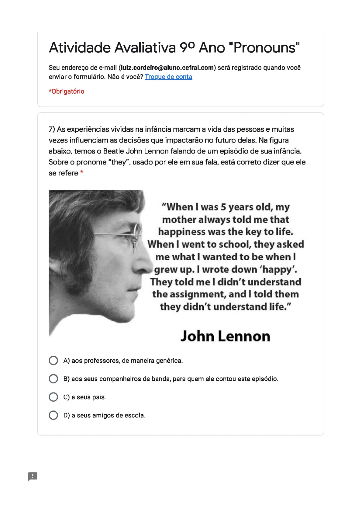 Atividade Avaliativa 9º Ano "Pronouns" https://docs.google.com/forms/d/e/1FAIpQLSfSKYgZ0wBhk3gSWsr... 1 of 7 16/12/2020 09:15 Atividade Avaliativa 9º Ano 11 Pronouns 11 Seu endereço de e-mail (luiz.cordeiro@aluno.cefrai.com) será registrado quando você enviar o formulário. Não é você? Trague de conta *Obrigatório 7) As experiências vividas na infância marcam a vida das pessoas e muitas vezes influenciam as decisões que impactarão no futuro delas. Na figura abaixo, temos o Beatle John Lennon falando de um episódio de sua infância. Sobre o pronome "they", usado por ele em sua fala, está correto dizer que ele se refere * "When 1 was 5 years old, my motber a lways told me that happiness was the key to life. When 1 went to school, they asked mie what 1 wanted to be when 1 .~._.. grew up. I wrote down 'happy'. They told me 1 didn't understand the assignment, and 1 told them1 they didn't understa nd life." John Lennon O A) aos professores, de maneira genérica. O B) aos seus companheiros de banda, para quem ele contou este episódio. O C) a seus pais. O D) a seus amigos de escola. gabri Realce Atividade Avaliativa 9º Ano "Pronouns" https://docs.google.com/forms/d/e/1FAIpQLSfSKYgZ0wBhk3gSWsr... 2 of 7 16/12/2020 09:15 5) Complete the text below with an object pronoun. * Janice is going to a party on Saturday. A friend invited 1. ___ to a party but she don't have appropriate clothes. She is at the mall to buy 2. __ . Look what she got: She got her jacket from a boutique. 1 got 3. __ on Edgeware Rd. 1 like 4. __ very much. She got the white shirt underneath from a boutique, too. She got 5. ___ at Modeste. She got her pants from Garb. She loves 6. ___ . They are comfortable. O 1. him 2. it 3. them 4. it 5. it 6. them O 1. her 2. them 3. it 4. it 5. it 6. them O 1. it 2. them 3. her 4. it 5. it 6. them O 1. her 2. him 3. it 4. it 5. it 6. her 8) Na frase "Women now become doctors at nearly the sarne rate as men, but they become physicians, not surgeons", o pronome they refere-se a: * o a) doctors. o b) physicians. o e) surgeons. o d) men. o e) women. / / gabri Realce gabri Realce Atividade Avaliativa 9º Ano "Pronouns" https://docs.google.com/forms/d/e/1FAIpQLSfSKYgZ0wBhk3gSWsr... 3 of 7 16/12/2020 09:15 9} The pronoun IT in the sentence "When we eat something with sugar in it,particularly refined sugar, enzymes in the saliva in the mouth begin to work immediately to change that sugar into a type of carbohydrate" refers to the word: * O a) saliva. O b) sugar. O e) mouth. O d) something. O e) refined sugar. 2} Read this job description and complete with the respective possessive adjective and subject pronoun. * "Social workers help people overcome problems and make __ lives better. __ work with people who are homeless, sick, or having family problems." o A) they/ their. o B) his / He. o C) our / We. o D) their / they. I gabri Realce gabri Realce Atividade Avaliativa 9º Ano "Pronouns" https://docs.google.com/forms/d/e/1FAIpQLSfSKYgZ0wBhk3gSWsr... 4 of 7 16/12/2020 09:15 4) The slogan of this advertisement says that, when you travei, the most important thing to do is to * o A} take a digital camera. o B} go on a city tour. o C} buy a postcard. o D} enjoy yourself. When yon travei, there' s nothlng more importaot than yonrself. TBWA, Buenos Aires, Argentina Juan cruz~ Guil lermo~, João Oliveira, Lucila~ Available at: http://adsoflhewor1d.c omlme<f alprintlmedic us _ selfie _ 3 Acc essed on: June 5, 2016. gabri Realce Atividade Avaliativa 9º Ano "Pronouns" https://docs.google.com/forms/d/e/1FAIpQLSfSKYgZ0wBhk3gSWsr... 5 of 7 16/12/2020 09:15 3) The slogan "Run from yourself" in this advertisement about good health tells the reader to * Run from yourself. Sérgio ~. Junior Parra Cia 1 nterativa, São José elo Rio Preto, ~ Available at: htlp:lladsoftlleworlcl_comlmeclia/printJcorpore _ run _ lrom _yourself Accessed on: June 5, 2016. O A} practice running every day after breakfast. O B} control his/her own unhealthy eating desires. O C} exercise after every time he/she eats something. O D} run inside his/her house in order to exercise. Nome * Sua resposta gabri Realce Atividade Avaliativa 9º Ano "Pronouns" https://docs.google.com/forms/d/e/1FAIpQLSfSKYgZ0wBhk3gSWsr... 6 of 7 16/12/2020 09:15 6} Look at the picture below. This is Mark's grandfather. Fill in the blanks with the words in the box. There are two extra items. (these his his this he your he her} * Read the dialogue and fill in the blanks with the words from the box. A - 1. is my grandfather. B - Really? What's 2. name? A - 3. ____ name is Joseph. B - What is his nationality? A - 4. _____ is Spanish. B - How old is 5. ____ grand father? A - 6. is eighty-five years old. O A} his, this, he, his, he, your O B} this, his, his, he, your, he O C} he, your, this, these, his, his O D} your, these, your, his, he, this 10} Selecione a opção correta que completa a frase a seguir: " ____ work in the field of engineering. O a) She Ü b} They O c}He O d}Them O e) lt / gabri Realce gabri Realce Atividade Avaliativa 9º Ano "Pronouns" https://docs.google.com/forms/d/e/1FAIpQLSfSKYgZ0wBhk3gSWsr... 7 of 7 16/12/2020 09:15 1} Replace the underlined nouns with subject or object pronouns. * My fav orite subject is history_ 1 really li ke history_ 1 usually sit with Abby _ She 's my best friend_ The teacher often asks Abby to read in class_ Then Abby and 1 have French with Mr_ ~ Abby really li kes Mr_ Coubert, ao.d she laves French too _ Abby can speak French really well ! Sometimes, ~ helps me with French. ln PE, Abby and 1 sometimes play tenni s with ®L friends Thomas and Herbert Thomas and Herbert don't li ke ~ tennis with Abbey and me, but we li ke play ing with Thomas and ~ we usually win ! We're really good at olaviog tennis ! CllCK Mll.auioe. GB page 10, .s@lwnb.:c 1 ~, 2013. ~twJ astlç. Q A} it - her - we - him - she - it - we - they - us - them - it Q B} it - she - we - him - she - it - us - they - us - them - it Q C} it - her - we - 