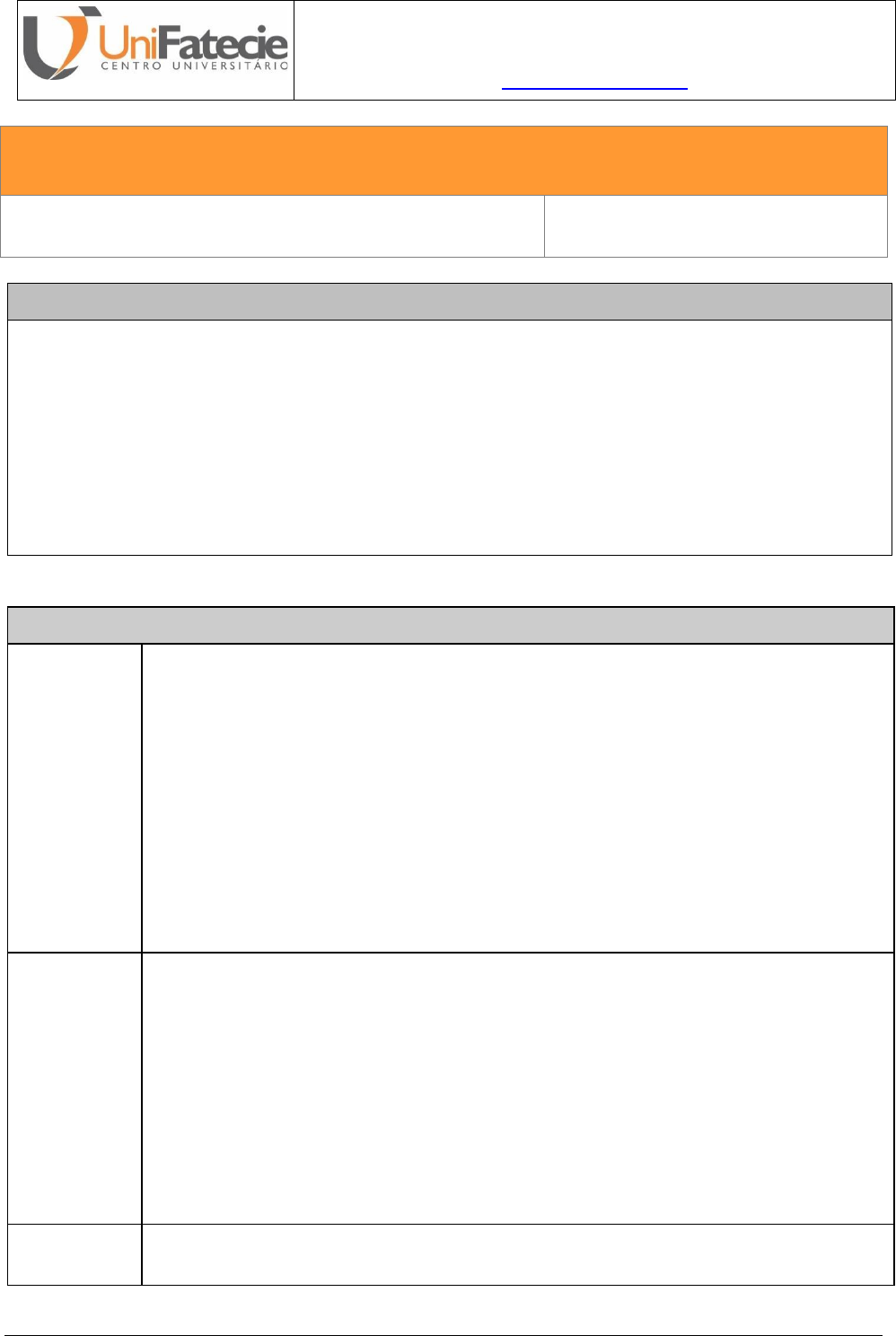 Rua Getúlio Vargas Nº. 333 – Centro – Paranavaí – Paraná – CEP 87.709-000 www.fatecie.com CENTRO UNIVERSITÁRIO UNIFATECIE NÚCLEO DE EDUCAÇÃO A DISTÂNCIA www.unifatecie.edu.br PLANO DE ENSINO GRADUAÇÃO EAD DISCIPLINA: FUNDAMENTOS DA ADMINISTRAÇÃO. C/H: 100h 1) EMENTA DA DISCIPLINA: Apresenta a teoria Geral da Administração e suas principais abordagens sobre as organizações; como está estruturada a organização, modelos participativos; Enfoque sistêmico; Aprendizagem organizacional; Organização qualificante e modelo da competência; Cultura organizacional; Poder nas organizações. 2) PROGRAMA E CRONOGRAMA DE REALIZAÇÃO DA DISCIPLINA: Unidade I TÍTULO DA UNIDADE: INTRODUÇÃO À TEORIA DA ADMINISTRAÇÃO • Conceitos e princípios da administração. • Funções e níveis da administração. • Aspectos importantes da administração. • Habilidades exigidas dos administradores. Unidade II TÍTULO DA UNIDADE: ESCOLAS DA ADMINISTRAÇÃO • A evolução do pensamento administrativo. • As etapas da evolução do pensamento administrativo. • A importância do pensamento administrativo. Rua Getúlio Vargas Nº. 333 – Centro – Paranavaí – Paraná – CEP 87.709-000 www.fatecie.com Unidade III TÍTULO DA UNIDADE: FUNÇÕES ADMINISTRATIVAS • Funções administrativas. • Processo administrativo. • Níveis administrativos e suas funções. Unidade IV TÍTULO DA UNIDADE: QUALIDADE NAS ORGANIZAÇÕES • Organizações como sistemas. • As organizações como sistemas (abertos e fechados). • Qualidade como elemento transformador (14 princípios de Deming, Ciclo PDCA) 3) METODOLOGIA DE TRABALHO DO PROFESSOR NA DISCIPLINA: ● Os conteúdos ficarão disponíveis no sistema Moodle (sob demanda) e por tempo determinado, de acordo com a oferta da disciplina. ● O aluno terá acesso uma apostila de desenvolvida pelo professor formador para estudo prévio dos conteúdos. Contará também com os livros da Bibliografia Básica e com artigos, periódicos e demais referências digitais, que somados aos demais recursos disponíveis (atividades e fórum), visam possibilitar o auto-estudo. ● Ao final de cada aula será solicitado ao aluno que resolva as atividades de estudo propostas como forma de avaliação e retenção de conhecimento. A modalidade à distância, sob a forma de auto-aprendizagem, compreende a leitura, análise crítica e compreensiva dos textos, sendo este um pré-requisito fundamental para o aprendizado do acadêmico. 4) AVALIAÇÃO E CRITÉRIO DE AVALIAÇÃO DA DISCIPLINA: 5) BIBLIOGRAFIA BÁSICA DA DISCIPLINA: CHIAVENATO, Idalberto. Teoria geral da administração: abordagens prescritas e normativas. 7 ed. Barueri, SP: Manole, 2014. Disponível em: https://bv4.digitalpages.com.br. Acesso em: 17 abr. 2021. Rua Getúlio Vargas Nº. 333 – Centro – Paranavaí – Paraná – CEP 87.709-000 www.fatecie.com COLTRE, Sandra Mara. Fundamentos de administração: um olhar transversal. Curitiba: InterSaberes, 2014. Disponível em: https://bv4.digitalpages.com.br. Acesso em: 17 abr. 2021. ANDREOLI, Taís Pasquoto: ROSSINI, Fernando. Organização, sistemas e métodos. Curitiba: InterSaberes, 2015. Disponível em: https://bv4.digitalpages.com.br. Acesso em: 17 abr. 2021. ROBBINS, Stephen. Comportamento organizacional. 11 ed. São Paulo: Pearson Prentice Hall, 2005. Disponível em: https://bv4.digitalpages.com.br. Acesso em: 17 abr. 2021. CRUZ, Eduardo Picanço; BARRETO, Cesar Ramos: FONTANILAS, Carlos Navarro. O processo decisório nas organizações. Curitiba: InterSaberes, 2014. Disponível em: https://bv4.digitalpages.com.br. Acesso em: 17 abr. 2021. CERTO, Samuel C. et al. Administração estratégica e implantação da estratégica. São Paulo: Pearson Education do Brasil, 2005. Disponível em: https://bv4.digitalpages.com.br. Acesso em: 17 abr. 2021. SELMA, Jim. Liderança. São Paulo: Pearson Prentice Hall, 2010. Disponível em: https://bv4.digitalpages.com.br. Acesso em: 17 abr. 2021. FARIA, José Henrique de. Autogestão, economia solidária e organização coletivista de produção associada: em direção ao rigor conceitual. Cad. EBAPE. BR, v. 15, n 3, Artigo 5, Rio de Janeiro, Jul./Set. 2017. Disponível em: http://www.scielo.br/pdf/cebape/v15n3/1679- 3951-cebape-15-03-00629.pdf. Acesso em: 17 abr. 2021. Aprovado em Reunião do Colegiado de Curso em: Paranavaí-PR, ______/____/___ Carimbo e Assinatura do Coordenador