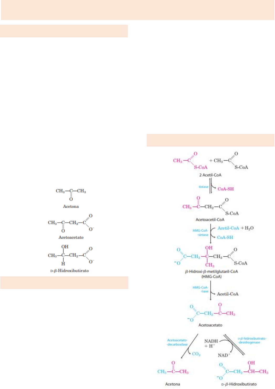 As imagens utilizadas são para fins educativos, sem intenção de infringir direitos autorais. @ana_dinizmed Em humanos, o acetil-CoA formado no fígado durante a oxidação dos ácidos graxos pode entrar no ciclo do ácido cítrico ou sofrer conversão a corpos cetônicos: acetona, acetoacetato e D-b-hidroxibutirato, para exportação a outros tecidos. O termo “corpos” é ocasionalmente aplicado a partículas insolúveis, mas esses compostos são solúveis no sangue e na urina A acetona, produzida em menor quantidade do que os outros corpos cetônicos, é exalada. O acetoacetato e o D-b-hidroxibutirato são transportados pelo sangue para outros tecidos que não o fígado (tecidos extra-hepáticos), onde são convertidos a acetil-CoA e oxidados no ciclo do ácido cítrico, fornecendo muito da energia necessária para tecidos como o músculo esquelético e cardíaco e o córtex renal. O cérebro, que usa preferencialmente glicose como combustível, pode se adaptar ao uso de acetoacetato ou D-b-hidroxibutirato em condições de jejum prolongado, quando a glicose não está disponível. A produção e exportação dos corpos cetônicos do fígado para tecidos extra-hepáticos permite a oxidação contínua de ácidos graxos no fígado quando acetil-CoA não está sendo oxidada no ciclo do ácido cítrico. A primeira etapa na formação de acetoacetato, que ocorre no fígado é a condensação enzimática de duas moléculas de acetil-CoA, catalisada pela tiolase (essa reação é o inverso da última etapa da b-oxidação). O acetoacetil-CoA então se condensa com acetil-Coa formando b-hidroxi-b-metilglutaril- CoA (HMG-CoA), clivado a acetoacetato livre e acetil-Coa. O acetoacetato é reversivelmente reduzido pela D-b-hidroxibutirato-desidrogenase, uma enzima mitocondrial, a D-b- -hidroxibutirato. Essa enzima é específica para o estereoisômero D (ela não atua sobre L-b- hidroxiacil-CoAs e não deve ser confundida com a L-b-hidroxiacil-CoA-desidrogenase da via de b-oxidação). Em pessoas saudáveis, a acetona é formada em quantidade muito pequena a partir de acetoacetato, que é facilmente descarboxilado espontaneamente ou pela ação da acetoacetato-descarboxilase. Como pessoas com diabetes não tratado produzem grandes quantidades de acetoacetato, seu sangue contém quantidades significativas de acetona, que é tóxica. A acetona é volátil e provoca um odor característico ao hálito, que algumas vezes é útil no diagnóstico da diabetes. Corpos Cetônicos Corpos Cetônicos Exportação de Corpos Cetônicos Formação de Corpos Cetônicos As imagens utilizadas são para fins educativos, sem intenção de infringir direitos autorais. @ana_dinizmed Em tecidos extra-hepáticos, o D-b- hidroxibutirato é oxidado a acetoacetato pela D-b-hidroxibutirato-desidrogenase O acetoacetato é ativado ao seu éster de coenzima A pela transferência da CoA do succinil-CoA, intermediário do ciclo do ácido cítrico, em uma reação catalisada pela b- cetoacil-CoA-transferase, também chamada tioforase. O acetoacetil-CoA é então clivado pela tiolase gerando dois acetil-CoAs, que entram no ciclo do ácido cítrico. Assim, os corpos cetônicos são usados como combustível em todos os tecidos, exceto o fígado, que carece de tioforase. O fígado é um produtor de corpos cetônicos para os outros tecidos, mas não um consumidor. A produção e exportação dos corpos cetônicos pelo fígado permite a oxidação contínua de ácidos graxos com mínima oxidação de acetil- CoA. Quando os intermediários do ciclo do ácido cítrico são desviados para a síntese de glicose pela gliconeogênese, por exemplo, a oxidação dos intermediários do ciclo desacelera – bem como a oxidação de acetil-CoA. Além disso, o fígado contém apenas uma quantidade limitada de coenzima A, e quando a maior parte está comprometida com acetil- CoA, a b-oxidação desacelera esperando por coenzima livre. A produção e a exportação de corpos cetônicos liberam a coenzima A, permitindo a contínua oxidação dos ácidos graxos. Jejum e diabetes melito não tratado leva à superprodução de corpos cetônicos, com vários problemas médicos associados. Durante o jejum, a gliconeogênese consome os intermediários do ciclo do ácido cítrico, desviando acetil-CoA para a produção de corpos cetônicos. No diabetes não tratado, quando o nível de insulina é insuficiente, os tecidos extra- hepáticos não podem captar a glicose do sangue de maneira eficiente, para combustível ou para conservação como gordura. Nessas condições, os níveis de malonil-CoA (o material de início para a síntese de ácidos graxos) caem, a inibição da carnitina- aciltransferase I é aliviada, e os ácidos graxos entram na mitocôndria para ser degradado a acetil-CoA (que não pode passar pelo ciclo do ácido cítrico, já que os intermediários do ciclo foram drenados para uso como substrato na gliconeogênese). O acúmulo resultante de acetil-CoA acelera a formação de corpos cetônicos além da capacidade de oxidação dos tecidos extra- hepáticos. O aumento dos níveis sanguíneos de acetoacetato e D-b-hidroxibutirato diminui o pH do sangue, causando a condição chamada cetose. Indivíduos em dietas hipocalóricas, utilizando as gorduras armazenadas no tecido adiposo como sua principal fonte de energia, também têm níveis elevados de corpos cetônicos no sangue e na urina. Esses níveis devem ser monitorados para evitar os riscos da acidose e da cetose (cetoacidose) como acidose. A acidose extrema pode levar ao coma e em alguns casos à morte. Os corpos cetônicos no sangue e na urina de indivíduos com diabetes não tratado pode alcançar níveis extraordinários. Produção excessiva de Corpos Cetônicos