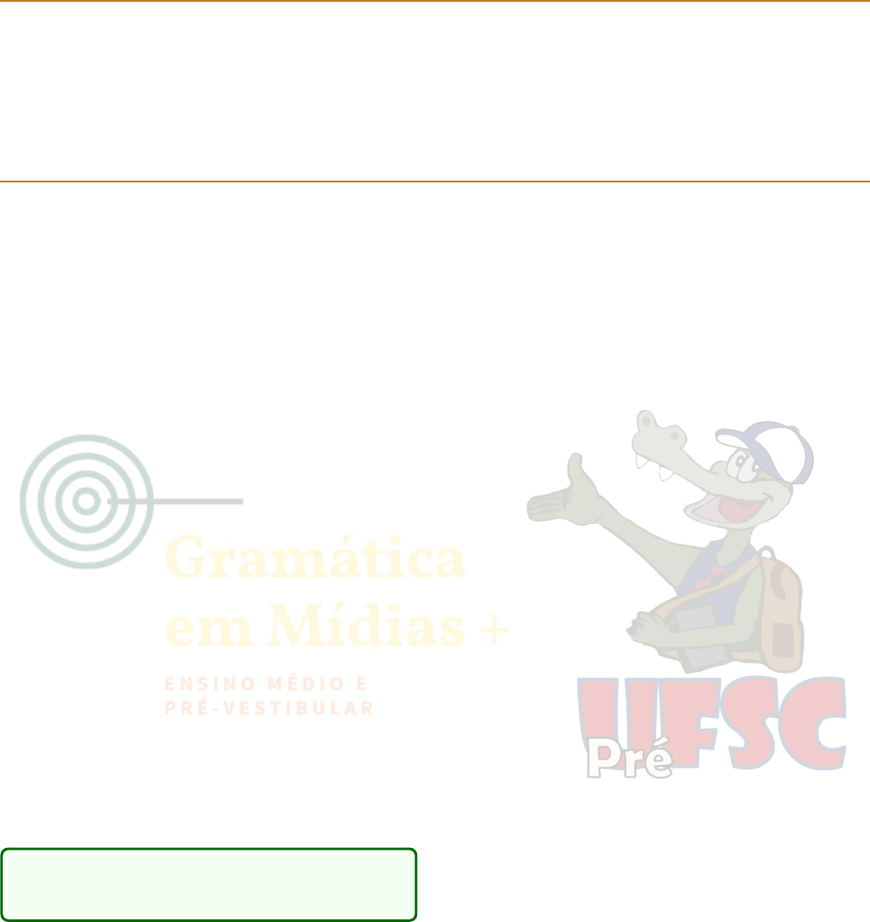 Leitura e Produção Textual Redação e Gramática + O lá estudante! Tudo bem? A maioria dosvestibulares, não só da nossa região, comotambém de outros lugares, tem como uma das competências a temida redação. E essa tem um peso considerável para que você possa ingressar em seu tão sonhado curso. Mas calma! Estamos aqui para ajudar! Este material foi produzido com muita dedicação pelos acadêmicos do curso de Le- tras da UNIVILLE. Assim, você poderá usufruir com calma e tranquilidade todos os capítulos. Iremos apresentar a forma como algumas Universidades cobram seus vestibulares e, principalmente, as re- dações. Caminharemos por temas como semântica, sintaxe, concordâncias - e pode relaxar, porque em- bora os nomes assustem, não são assuntos compli- cados. Daremos dicas de como se preparar antes e durante as redações, com maneiras com as quais você poderá vencer o bloqueio criativo. Teremos exercícios bastante elucidativos para treinar desde cedo e trabalhar a escrita. Traremos, ainda, exem- plos comentados de redações nota mil do ENEM para compreender melhor como é esta dinâmica. Lembre-se, sempre: escrever exige treino! “Escrever é ter a companhia do outro de nós que escreve” (Vergílio Ferreira). 1 Regras dos vestibulares Nesta seção abordaremos as regras presentes nos editais da UFSC, UDESC, ACAFE e ENEM para que você fique atento aos itens que são cobrados nestas provas. 1.1 UFSC: Universidade Federal de Santa Catarina Segundo o Edital no 014/2019 de 10/09/2019 da Comissão Permanente do Vestibular (COPERVE) da UFSC 2019: 1. A redação terá pontuação na escala de 0,00 (zero vírgula zero zero) a 10,00 (dez vírgula zero zero) pontos e será avaliada considerando o conteúdo e a expressão escrita quanto à/ao: (a) adequação à proposta - tema e gênero (0,00 a 2,50 pontos); (b) emprego da modalidade escrita na variedade padrão (0,00 a 2,50 pontos); (c) coerência e coesão (0,00 a 2,50 pontos); (d) nível de informatividade e de argumentação ou narratividade, de acordo com a proposta (0,00 a 2,50 pontos). 1.1. Somente serão avaliadas as redações transcri- tas de forma legível no espaço das 30 linhas delimitadas na folha oficial de redação, con- forme especificações: – Para transcrever as respostas para o cartão-resposta e para as folhas oficiais de redação e de resposta das questões discursivas, o candidato deverá utilizar caneta esferográfica, fabricada em ma- terial transparente, de tinta preta (pre- ferencialmente) ou azul. Texto escrito no verso da folha oficial de redação não será avaliado. 1.1.1. Caso o candidato escreva sua redação em letra de forma, deverá distinguir claramente as letras maiúsculas das minúsculas. 1.2. A redação deverá ser resultado da produção e da criatividade do candidato. 1.3. Será atribuído zero à redação: i. com fuga total ao tema; Leitura e Produção Textual: Redação e Gramática+ ii. resultante de plágio; iii. escrita em versos; iv. com identificação do candidato. 1.2 UDESC: Universidade do Estado de Santa Catarina De acordo com o blog Oficina da Palavra 2019: 1. Os critérios de avaliação da Prova de Redação incluem: – Adequação à proposta: 0,0 a 10,0; – Domínio da modalidade escrita formal da língua portuguesa/coerência e coesão 0,0 a 10,0; – Estilo e expressividade 0,0 a 10,0. 2. Deverá demonstrar as seguintes habilidades: – Fluência, clareza, coerência e coesão linguís- tica; – Ideias organizadas, em sequência lógica e coerentes; – Argumentos encadeados de forma coesa; – Relação entre os termos da oração e entre as orações no período; – Paragrafação correta; – Respeito às normas gramaticais e ortográficas em vigor; pontuação adequada; – Aplicação de conceitos das várias áreas de conhecimento para desenvolver o tema dentro dos limites estruturais do texto. 3. Zera a redação: (a) Escrita a lápis ou lapiseira; (b) Redação entregue em folha de rascunho; (c) Redação abaixo de 20 linhas e acima de 30 linhas; (d) Escrita fora do padrão dissertativo- argumentativo; (e) Fuga total do tema; (f) Plágio; (g) Nome, assinatura, rubrica ou apelido na re- dação identificando-se. Observação: Não é preciso fazer uma intervenção, toda- via é necessário apresentar que demonstrou entender o que o tema propôs, ou seja, apresentar domínio. 1.3 ACAFE: Associação Catarinense das Fundações Educacionais Segundo o Edital no 2/2019/ACAFE de 05/09/2019 2019: Os textos serão avaliados duas vezes por professores diferentes, os quais atribuirão notas de 0,0 a 10,0. 1. Critérios: (a) adequação ao tema proposto (0 a 2,0 pon- tos); (b) modalidade escrita da norma culta da língua portuguesa (padrão formal) (0 a 2,0 pontos); (c) coerência e coesão (0 a 2,0 pontos); (d) nível de informação e de argumentação (0 a 2,0 pontos); (e) marca de autoria e estilo (0 a 2,0 pontos). 2. Correção: (a) Somente serão avaliadas as redações trans- critas para folha de redação personalizada e entregue para tal finalidade; (b) A redação deve ser resultado da produção e criatividade do candidato. 3. Zera a redação: (a) fuga total ao tema; (b) não obediência à estrutura dissertativo- argumentativa; (c) texto com número de linhas inferior a 10 (dez); (d) escrita a lápis; (e) impropérios, desenhos ou outras formas pro- positais de anulação; (f) folha de redação em branco, mesmo que te- nha sido escrita no rascunho. Observação: Se na correção, a diferença da nota dos dois professores for igual ou superior a 3 (três) pontos, um terceiro professora fará a avaliação e realizará a média aritmética das duas notas mais próximas. 1.4 ENEM: Exame Nacional do Ensino Médio De acordo com o artigo Conheça as cinco competên- cias cobradas na redação do ENEM 2019, a redação do ENEM considera os seguintes itens: 1. Domínio da escrita formal da língua portu- guesa: é avaliado se a redação do pa