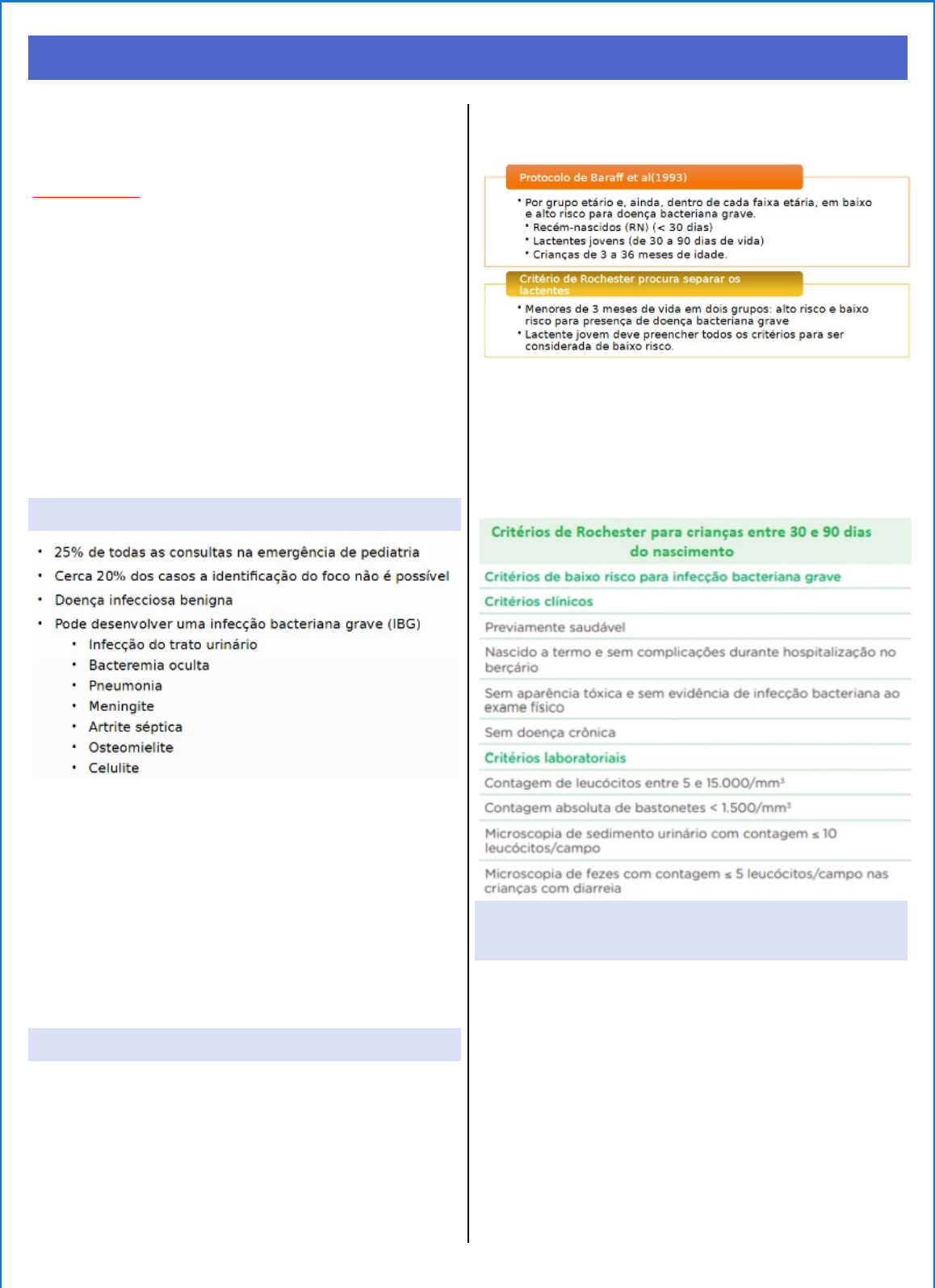 FEBRE SEM SINAIS LOCALIZATÓRIOS (FSSL) GABRIEL S. MIRANDA – MEDICINA FTC ✖ FSSL: Ocorrência de febre com menos de 7 dias de duração em uma criança, em que após a histórica clínica e exame físico detalhados, não tem a causa estabelecida. OBSERVAÇÃO: febre temperatura maior que 38ºC para medição via oral. Acima de 37,8ºC axilar vamos considerar como febre. A melhor e fidedigna é a oral, porém, usa-se mais a axilar. ✖ ATENÇÃO PARA NÃO CONFUNDIR: Febre prolongada de origem obscura (FPOO) é caracterizada por febre de existência indiscutível, duração mínima de três semanas, com quadro clínico inconcluso e que permanece sem diagnóstico após a realização do conjunto de exames e procedimentos indicados inicialmente para aquele caso particular. Indeterminado quer dizer que eu já investiguei com exames complementares e eu não sei a localização da febre ainda. EPIDEMIOLOGIA ✖ Febre corresponde a 25% dos casos das consultas na emergência pediatra. ✖ 95% dos casos de FSSL se refere a uma doença infecciosa benigna (isso após o advento da vacina). Os outros 5% é uma infecção bacteriana grave. ✖ Até os 3 anos complica mais, visto que a criança até os 4 anos ainda não tem um sistema imune muito bom. Por isso, quando falarmos aqui ate os 36 meses de idade, é por conta disso. Porém, isso não significa que determinadas condutas não sirvam para crianças de 5 anos, por exemplo. CRITÉRIOS DE AVALIAÇÃO DA FSSL ✖ A abordagem da criança com FSSL sem comprometimento do estado geral, varia de acordo com a idade da criança, uma vez que cada faixa etária apresenta diferenças substanciais em relação à etiologia, gravidade e prevalência de infecção bacteriana. ✖ Habitualmente, as crianças são classificadas em três grupos etários distintos para efeitos de avaliação de FSSL: RN (< 30 dias), lactentes jovens (de 30 a 90 dias de vida) e crianças de 3 a 36 meses de idade. · CRITÉRIOS DE ROCHESTER ✖ O critério de Rochester procura separar os lactentes menores de 3 meses de idade em 2 grupos: alto risco e baixo risco para presença de doença bacteriana grave na vigência de FSSL. O lactente jovem deve preencher todos os critérios para ser considerado de baixo risco. BACTEREMIA OCULTA (BO) E INFECÇÃO BACTERIANA GRAVE (IBG) ✖ DEFINIÇÃO DE INFECÇÃO BACTERIANA GRAVE (IBG): é toda infecção bacteriana que acarreta risco de morbidade ou mortalidade, caso ocorra atraso em seu diagnóstico. O conceito de doença bacteriana grave inclui: infecção urinária, pneumonia, bacteriemia oculta, meningite bacteriana, artrite séptica, osteomielite, celulite e sepse. O risco de IBG é maior nos menores de 3 meses de idade, principalmente nos recém-nascidos (RN), e decresce progressivamente com a idade. ✖ DEFINICÃO DE BACTERIEMIA OCULTA: refere-se à presença de bactéria em hemocultura, em uma criança febril, sem infecção localizada e com pouco ou nenhum achado clínico. Embora a maioria dos episódios de bacteriemia oculta tenha resolução espontânea, às vezes podem ocorrer complicações sérias, como pneumonia, meningite, artrite séptica, osteomielite, sepse e morte. ✖ Clinicamente falando, podemos dizer que BO ocorre quando eu tenho hemocultura positiva em uma criança que está com FSSL, clinicamente bem e sem infecção localizada. ✖ A BO está diretamente relacionada a vacinação – Hib e pneumococo. Em menos de 1% dos casos é mais comuns E. Coli e S. Aureus. ✖ Pelo menos 2 vacinas de Hib, pneumococo e meningococo, eu digo que é uma vacinação efetiva, completa. No paciente de 1 a 3 meses de idade, como ele não tem a segunda dose de pneumococo e Hib, ele tem mais chances de BO por HIB e pneumoco porque não fez 2 doses da vacina. INFECÇÃO DO TRATO URINÁRIO ✖ PRINCIPAL CAUSA DE FSSL. ✖ 3 a 4% dos casos em meninos menores de 12 meses de idade. ✖ 8 a 9% das meninas menores de 24 meses de idade. ✖ Circuncisão (remoção do prepúcio do pênis masculino) é um fator de proteção para os meninos. A fimose fisiológica então explica o maior episódio de ITU em meninos menos de 12 meses em relação a meninas. PNEUMONIA ✖ Ocorre em 3% das crianças com febre em ausência de taquipneia e/ou sinal e sintoma respiratório. Essa é a chamada PNEUMONIA OCULTA. ✖ Possui relação com a situação vacinal (ter 2 doses da vacina diminui as chances). MENINGite ✖ Meningococo é bem mais rara do que por pneumococo. A importância de saber sobre a meningite é a evolução do quadro. ✖ 25 a 50% dos pacientes com doença meningocócica haviam sido liberados após a avaliação inicial. Isso chama a atenção para a avaliação geral da criança antes de liberar. AVALIAÇÃO CLÍNICA ✖ Avaliar incialmente se há presença de sinais de toxemia que é basicamente observar o estado geral da criança, alteração da FC, FR, coloração da pele e etc. ✖ Observar a idade é importante para saber onde encaixar o paciente no fluxograma de avaliação. A avaliação para criança acima de 3 anos é mais ou menos o que procura em 3 anos. ✖ O que você vai pedir de avaliação laboratorial é de acordo com a necessidade. HEMOGRAMA – CONTAGEM DE LEUCÓCITOS ✖ As taxas estão relacionadas as CHANCES para desenvolver bacteremia. Provas de fase aguda ✖No serviço público só consegue proteína C reativa qualitativa (indica positivo ou negativo) e não quantitativo. No serviço privado você já consegue o quantitativo. Acaba que o qualitativo não tem muito valor diagnóstico. ✖ PCR maior que 80 depois de 12 horas de febre (visto que só é possível observar a elevação dela após 12 horas de febre), infecção bacteriana. Exclui infecção bacteriana se for menos que 20. ✖ Procalcitonina é mais caro, mas ele me dá uma resposta mais rápida que o PCR. Exame de urina ✖ UROCULTURA É O PADRÃO OURO para identificar a infecção bacteriana. ✖ Bacterioscopia não está disponível na maioria das emergê
