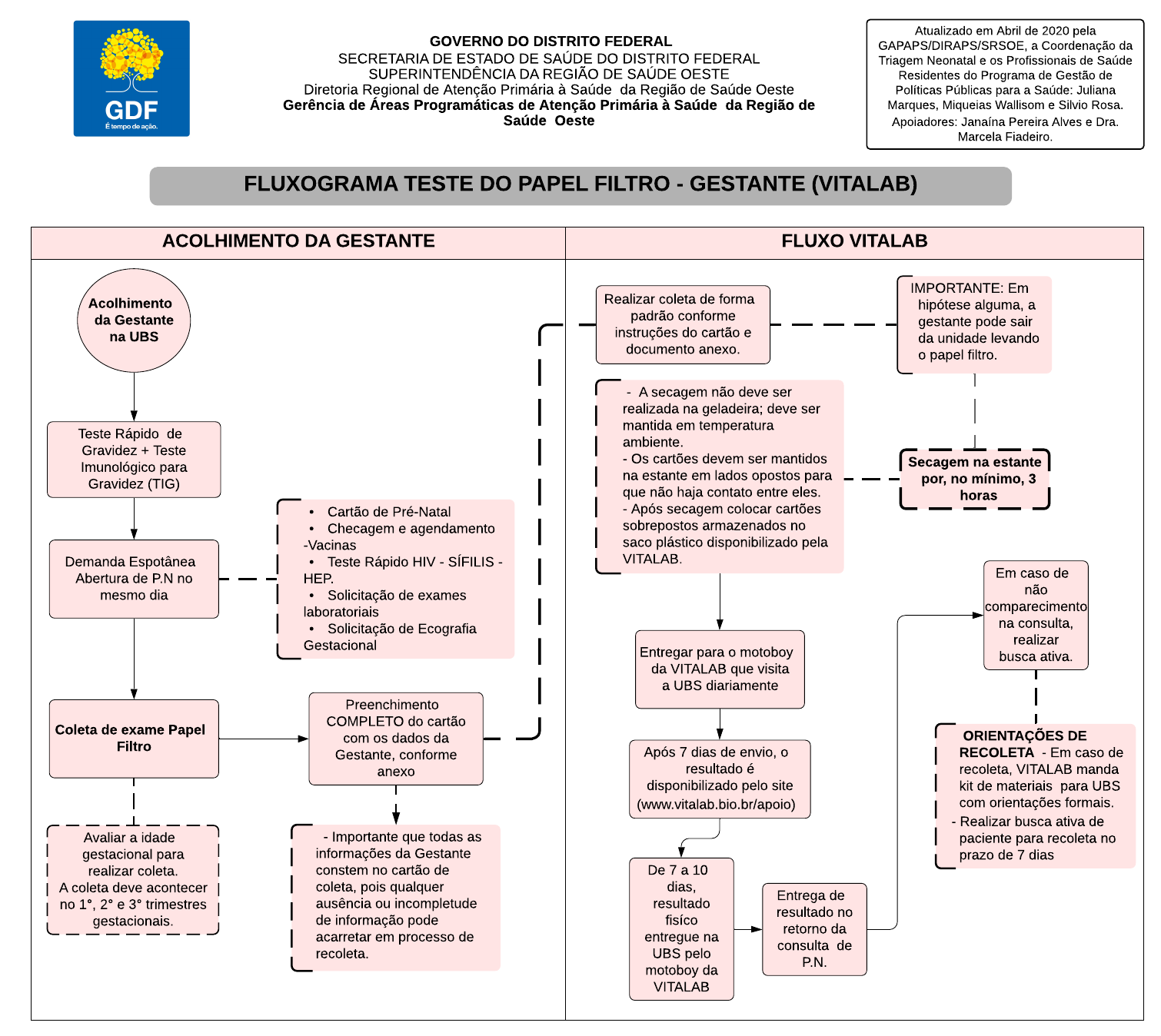ACOLHIMENTO DA GESTANTE FLUXO VITALAB Teste Rápido de Gravidez + Teste Imunológico para Gravidez (TIG) Demanda Espotânea Abertura de P.N no mesmo dia - Cartão de Pré-Natal - Checagem e agendamento -Vacinas - Teste Rápido HIV - SÍFILIS - HEP. - Solicitação de exames laboratoriais - Solicitação de Ecografia Gestacional Coleta de exame Papel Filtro Preenchimento COMPLETO do cartão com os dados da Gestante, conforme anexo Realizar coleta de forma padrão conforme instruções do cartão e documento anexo. Entregar para o motoboy da VITALAB que visita a UBS diariamente Secagem na estante por, no mínimo, 3 horas De 7 a 10 dias, resultado fisíco entregue na UBS pelo motoboy da VITALAB Entrega de resultado no retorno da consulta de P.N. Em caso de não comparecimento na consulta, realizar busca ativa. ORIENTAÇÕES DE RECOLETA - Em caso de recoleta, VITALAB manda kit de materiais para UBS com orientações formais. - Realizar busca ativa de paciente para recoleta no prazo de 7 dias Atualizado em Abril de 2020 pela GAPAPS/DIRAPS/SRSOE, a Coordenação da Triagem Neonatal e os Profissionais de Saúde Residentes do Programa de Gestão de Políticas Públicas para a Saúde: Juliana Marques, Miqueias Wallisom e Silvio Rosa. Apoiadores: Janaína Pereira Alves e Dra. Marcela Fiadeiro. GOVERNO DO DISTRITO FEDERAL SECRETARIA DE ESTADO DE SAÚDE DO DISTRITO FEDERAL SUPERINTENDÊNCIA DA REGIÃO DE SAÚDE OESTE Diretoria Regional de Atenção Primária à Saúde da Região de Saúde Oeste Gerência de Áreas Programáticas de Atenção Primária à Saúde da Região de Saúde Oeste Acolhimento da Gestante na UBS - Importante que todas as informações da Gestante constem no cartão de coleta, pois qualquer ausência ou incompletude de informação pode acarretar em processo de recoleta. IMPORTANTE: Em hipótese alguma, a gestante pode sair da unidade levando o papel filtro. - A secagem não deve ser realizada na geladeira; deve ser mantida em temperatura ambiente. - Os cartões devem ser mantidos na estante em lados opostos para que não haja contato entre eles. - Após secagem colocar cartões sobrepostos armazenados no saco plástico disponibilizado pela VITALAB. Após 7 dias de envio, o resultado é disponibilizado pelo site (www.vitalab.bio.br/apoio) FLUXOGRAMA TESTE DO PAPEL FILTRO - GESTANTE (VITALAB) Avaliar a idade gestacional para realizar coleta. A coleta deve acontecer no 1°, 2° e 3° trimestres gestacionais. TESTE DO PAPEL FILTRO Processo de ordem de serviço de TI de alto nÃ�vel para integração de funcionário