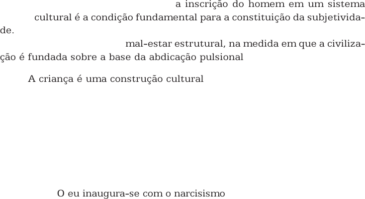 Psychê — Ano VIII — nº 14 — São Paulo — jul-dez/2004 — p. 157-167 Fragmentos da análise de uma criança: movimentos de constituição subjetiva Cláudia Andréa Gori Resumo No decorrer de sua obra, Freud formula a hipótese de que a inscrição do homem em um sistema cultural é a condição fundamental para a constituição da subjetividade. Conside- rando a idéia freudiana, o objetivo deste artigo é mostrar os movimentos de constituição subjetiva de uma criança em processo analítico, enfocando as relações teórico-clínicas da função do analista no processo de construção do eu na análise infantil, bem como as articulações entre o eu e a cultura, que se caracterizam por uma série de renúncias e substituições que irão moldar o ser pulsional. Unitermos Constituição subjetiva; psicanálise; criança; analista; cultura. discurso freudiano trata sobretudo da questão do homem como ser cultural. Para Freud (1914), a inscrição do homem em um sistema cultural é a condição fundamental para a constituição da subjetivida- de. No entanto, esse ponto de articulação necessária entre o homem e a cultura é marcado por um mal-estar estrutural, na medida em que a civiliza- ção é fundada sobre a base da abdicação pulsional. A criança é uma construção cultural. A partir do momento em que se dá sua inserção na cultura, por meio do olhar do outro, opera-se o início de uma sucessão de renúncias e substituições, que irão comprimir e moldar o ser pulsional. Em seu artigo de 1914, Sobre o narcisismo: uma introdução, Freud defende a idéia de que o eu, como unidade decorrente da reunião das parcia- lidades, não está presente desde o início, mas precisa ser construído a partir de uma nova ação psíquica que incide sobre o auto-erotismo e provoca o narcisismo. O eu inaugura-se com o narcisismo. O marip Highlight marip Highlight marip Highlight marip Highlight Psychê — Ano VIII — nº 14 — São Paulo — jul-dez/2004 — p. 157-167 158 | Cláudia Andréa Gori Esses movimentos de constituição subjetiva colocam questões e situam o analista de forma distinta na clínica de adultos e na clínica de crianças, em relação ao seu posicionamento diante do eu do paciente. Enquanto o eu na clínica do adulto é a fonte de resistências ao trabalho analítico, o eu na análise de crianças – além de ser fonte de resistências à análise – é também um acon- tecimento de máxima importância, na medida em que define a posição do sujeito frente às suas pulsões e à cultura. O eu da criança não está pronto, e o analista está diretamente implicado nesse processo de construção, já que ele, analista, oferece-se como continente para que o sujeito possa vir-a-ser. Do ponto de vista teórico, recorrerei às postulações de Freud sobre o eu, datadas de 1914. Capturado pelo olhar do outro e sem possibilidade de saber de si na ausência desse outro. Imerso na argila disforme. Essas foram minhas primeiras impressões diante de Pedro, agarrado e aninhado no colo de sua mãe. Nas entrevistas iniciais, a mãe de Pedro mostra-se decepcionada: “Eu não tenho mais vida, porque ele não me deixa viver. Não pára na escola, não fica com a babá, chora desesperadamente enquanto eu tomo banho, em todos os lugares as pessoas referem-se a Pedro como “pirata”... Pai bendito! Não sei mais o que fazer com ele” (sic). Talvez a mãe de Pedro também não saiba o que fazer com ela própria. O que predomina no discurso dessa mãe é a impotência à qual o adulto é submetido diante da emergência das dificuldades da criança. Pechberty aborda essa questão enfatizando que “a demanda de cuidado é vivida como um fracasso educativo pela família: o sintoma afasta, torna a criança estranha para seus próximos” (1996, p. 9). Senti nessas palavras maternas uma ambigüidade desesperada, de quem sabe que precisa interditar essa relação maciça, mas ao mesmo tempo vê-se tão envolvida nela que não tem força suficiente para rompê-la. Transfe- rencialmente ela colocava-me em uma posição terceira em relação ao par: enunciava um apelo ao Pai. Em Sobre o narcisismo: uma introdução, Freud (1914) postula a hipótese do narcisismo primário e do narcisismo secundário. Segundo ele, o narcisismo primário não pode ser objetivamente apreendido, mas decorre de uma inferência: antes da unificação das pulsões parciais em uma unidade chamada eu, não há representação do corpo como unidade, mas este é vivido como marip Highlight marip Highlight marip Highlight marip Highlight marip Highlight marip Highlight Psychê — Ano VIII — nº 14 — São Paulo — jul-dez/2004 — p. 157-167 Fragmentos da análise de uma criança: movimentos de constituição subjetiva | 159 fragmentado, e o estado da pulsão é o auto-erotismo, isto é, as pulsões parciais buscam satisfação investindo partes do próprio corpo. Para Freud, a constituição do eu é uma decorrência da posição dos pais diante do bebê. Os pais atribuem ao bebê todas as perfeições e sonhos que eles mesmos não puderam realizar ou precisaram renunciar em nome da cul- tura, ou seja, “o amor dos pais (...) nada mais é senão o narcisismo dos pais renascido” (1914, p. 98). O bebê é colocado na posição de His Majesty the baby, e de forma onipotente representa todo o universo do desejo dos pais. Esse eu nascente, que emerge da convergência do narcisismo dos pais e da imagem unificada que representa o corpo da criança, é o que Freud chama de eu ideal. O eu é um complexo de representações imaginárias, e na condição de ideal esse sujeito é o depositário de toda a perfeição e valor, ou seja, “o eu ideal é o efeito do discurso dos pais, efeito de um discurso apaixonado que abandona qualquer forma de consciência crítica para produzir uma imagem idealizada” (Garcia-Roza, 2000, p. 57). No entanto, esse eu ideal corresponde à posição mítica de Narciso diante