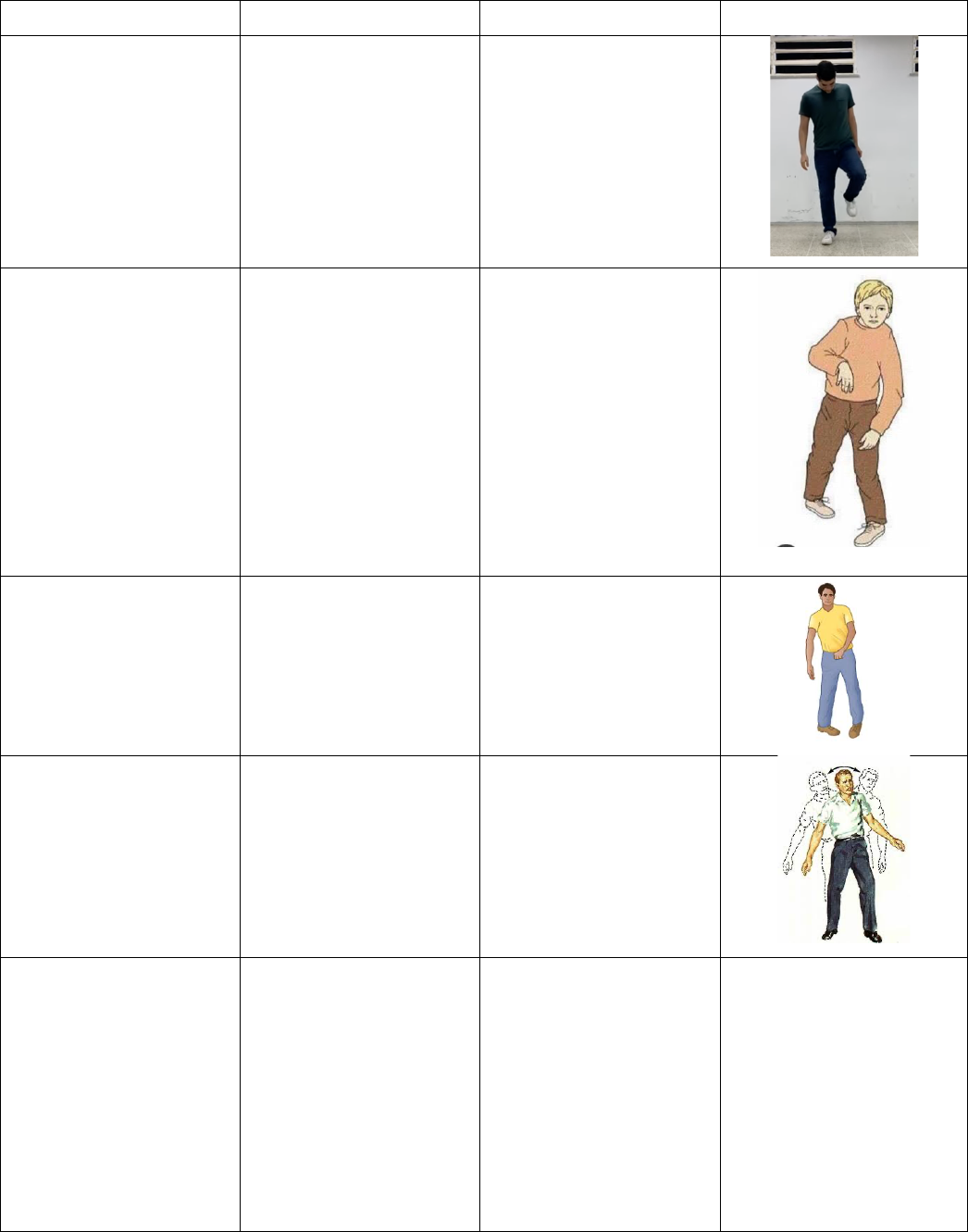 Brenna G Bonfante 1 Equilíbrio dinâmico (marchas) Tipos Características semiológicas Patologias Imagens Talonante Ataxia sensitiva Atáxica espinal Tabética Base alargada, pisada com energia ao solo, com toque inicial do calcanhar e olhar em direção aos pés, sendo impossível com os olhos fechados. - Deficiência B12 - Tabes dorsalis (neurossífilis) Hemiplégico-espástica Ceifante Helicópode O paciente mantém o MS fletido em 90º no cotovelo e em adução, com a mão fechada em leve pronação. O membro inferior do mesmo lado é espástico e o joelho não flexiona. O membro é abduzido em relação ao quadril, produzindo um movimento de circundação. Está associado a hemiplegias piramidais - AVC - Tumores do SNC - Neurotoxoplasmose Espástica ou “em tesoura” Os 2 membros inferiores estão enrijecidos e espásticos, permanecendo semifletidos. Os pés se arrastam, com as pernas se cruzando na frente durante a marcha, lembrando uma tesoura. Formas espásticas da paralisia cerebral Marcha cerebelar Ataxia cerebelar Marcha do ébrio A marcha é instável, com a base alargada, sem grandes mudanças com o fechamento dos olhos, traduzindo incoordenação de movimentos - Lesões cerebelares - Embriaguez Marcha vestibular O paciente apresenta lateropulsão quando anda. Quando tenta manter-se andando em linha reta, é como se fosse empurrado para o lado. Se colocado em um espaço amplo e mandado andar de olhos fechados para a frente e depois para trás, descreverá a forma de uma estrela Lesão vestibular Brenna G Bonfante 2 Parkinsoniana (festinante) O paciente caminha como um bloco, enrijecido, sem o movimento natural dos braços. Os passos são pequenos e rápidos, e a cabeça permanece inclinada para a frente, conferindo a impressão de que o eixo de gravidade do paciente foi deslocado. Pode ter festinação, com aceleração dos passos no início do caminhar. - Doença de Parkinson - Parkinsonismo atípico Marcha apráxica (magnética) Marcha de pequenos passos O paciente anda com os pés juntos ao chão, não conseguindo executar o movimento do passo. Os pés parecem “grudar no chão”, como se controlador por um imã. - Hidrocefalia de pressões normais - Lesões frontais Marca parética com steppage Marcha equina Escarvante Há excessivo levantamento do joelho, com excessiva flexão da coxa sobre a bacia. Os pés estão pendentes – marcha semelhante à do cavalo. Lesão de nervo periférico Marcha anserina Marcha “de pato” Há oscilações da bacia, as pernas estão afastadas e há hiperlordose lombar, como se o paciente quisesse manter o corpo em equilíbrio, em posição ereta, apesar do déficit muscular. Ocorre inclinação do tronco para um lado e para outro. Processos que causem fraqueza dos músculos pélvicos, como: - polineuropatias - pseudomiopatias - miosites - polimiosites - gravidez