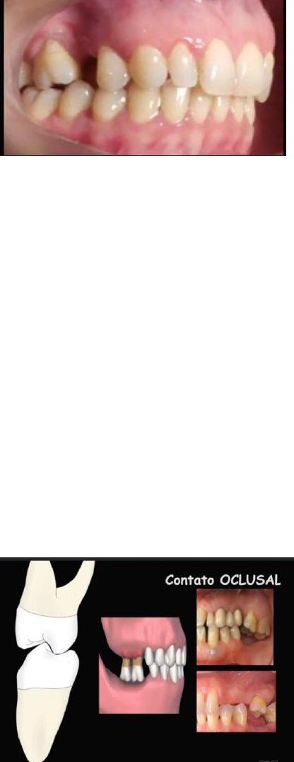 ALINHAMENTO E DISPOSIÇÃO DOS DENTES PERMANENTES NAS ARCADAS DENTÁRIAS Alinhamento – posição dos dentes na arcada e seu relacionamento com o arco antagonista. Esse alinhamento vai ter uma relação direta com a mastigação, a deglutição e a fonética do paciente. Alguns pacientes, têm os dentes mais vestibularizados e por isso, a fonética é prejudicada, por exemplo, dificuldade na pronúncia do F. Alguns fatores e forças vão guiar e determinar a posição dos dentes, como a bochecha, a língua e os lábios. O lábio exerce uma força vestibular nos dentes. Assim como a língua também exerce as forças linguais nos dentes. A mucosa jugal ainda exerce uma força sobre as faces vestibulares dos dentes posteriores. Essas forças se igualam, formando um espaço neutro entre elas, onde os dentes vão ficar alinhados, nesse espaço temos uma estabilidade dentária. Mas qualquer mudança no tamanho, direção e frequência das forças, pode provocar uma nova posição de equilíbrio, onde muitas vezes não quer dizer que os dentes permaneçam alinhados. Hábitos como roer unha, chupar dedo, tocar um instrumento musical, faz uma pressão nos dentes, fazendo com que esses dentes mudem de posição e saiam desse alinhamento. Normalmente, as crianças que chupam dedo têm dentes mais vestibularizados, fica mais “dentuça”, pois as forças não estão equilibradas, a força do dedo puxando para a vestibular é mais intensa do que a força do lábio. CONTATO PROXIMAL Contato de um dente, com o dente ao seu lado. Com a perda de uma unidade dentária, ocorre um deslocamento do dente localizado a distal, para a mesial, ocorrendo uma mesialização, pois a inclinação da raiz dele juntamente com a coroa, faz com que ele procure um novo ponto de contato na mesial. Assim, ocorrendo essa mesialização, vai diminuindo esse espaço, sendo que as vezes esse espaço diminui tanto que não pode-se mais fazer uma reabilitação. Logo, o interessante após a perda de uma unidade dentária é colocar uma provisória para preservar aquele espaço. Por exemplo: se eu perder o 1PMS, o dente que vai mesializar é o 2PMS. CONTATO OCLUSAL Quando perde o dente antagonista, ele procura um ponto de contato oclusal, logo vai ocorrendo uma extrusão até que ele encontre um ponto de contato, pode ocorrer uma extrusão até o rebordo mas é MUITO difícil, pois nesse ponto o dente já teria perdido estabilidade e perdido a sua inserção óssea. ALINHAMENTO INTRA ARCADAS Relação dos dentes entre si dentro do mesmo arco. 1. PLANO OCLUSAL Plano que une as cúspides e as bordas incisais dos dentes inferiores de um lado da arcada estendendo-se às cúspides do lado oposto. O plano é curvo para que todos os dentes consigam ter um contato na mastigação, aumentando a eficiência. O plano oclusal é formado pela curva de Spee + Curva de Wilson. 2. INCLINAÇÃO DOS DENTES NO SENTIDO M-D CURVA DE SPEE A partir de uma visão lateralizada, vai ter uma inclinação no sentido M-D. Os dentes inferiores se posicionam para a mesial. Assim como os dentes superiores são direcionados mais para a mesial, exceto os posteriores, que são um pouco mais retos, logo são mais inclinados para a distal. LINHA IMAGINÁRIA QUE SE FORMA NAS PONTAS DAS CÚSPIDES DOS DENTES POSTERIORES (PRÉ-MOLARES E MOLARES). CONVEXA PARA A ARCADA SUPERIOR E CONCAVA PARA ARCADA INFERIOR. 3. INCLINAÇÃO DOS DENTES NO SENTIDO V-L CURVA DE WILSON Os dentes inferiores possuem uma inclinação para vestibular dos dentes anteriores, e uma inclinação levemente lingual dos posteriores. Já os dentes superiores, são todos inclinados para a vestibular, pois o arco superior funciona como uma “tampa”, por isso deve seguir essa conformidade para conseguir acomodar o arco inferior. LINHA IMAGINÁRIA NAS PONTAS DE CÚSPIDES DOS DENTES POSTERIORES DIREITO E ESQUERDO – PANO OCLUSAL CURVO A qual é convexa no arco superior e côncava no arco inferior. ALINHAMENTO ENTRE ARCADAS Relação dos dentes de um arco com o outro arco (antagonista). Possuem comprimentos diferentes, a arcada superior tem em média 128mm e a arcada inferior 126mm. Essa diferença de comprimento se dá, principalmente pelos dentes anteriores inferiores serem menor, os incisivos são bem menores. Largura das arcadas é a distância da palatina de um molar até a palatina de outro. Comprimento das arcadas é uma linha que se inicia na distal do 3º molar e se estende mesialmente ao longo de todas as áreas de contatos proximais, em todo arco. Os inferiores estão mais para a lingual e para a mesial, por isso também a largura dos inferiores é menor do que a do arco superior. CÚSPIDES DE CONTENÇÃO CÊNTRICA - VIPS São responsáveis por manter a distância entre a mandíbula e a maxila. Por manter a dimensão vertical de oclusão (DVO) do paciente. CÚSPIDES DE NÃO CONTENÇÃO CÊNTRICA Minimizar o impacto tecidual e manter o bolo alimentar na mesa de mastigação. 1 dente oclui em 2 antagonistas, exceto o ICI e o 3MS. Quando analisamos os molares, vemos o tripoidismo (3 pontinhos no molar), que mostram com que a cúspide tenha contato em 3 pontos, não só na fóssula. O contato dos dentes inferiores é para a mesial dos dentes superiores. O contato dos dentes superiores é para a distal dos dentes inferiores. CLASSIFICAÇÃO DE ANGLE Classe I É uma classificação normal. Ao observamos o 1ºMI encontra-se ligeiramente para mesial do 1ºMS. Logo a cúspide mesiovestibular do 1ºMI oclui na área da ameia entre o 2ºPMS e o 1ºMS. Classe 2 1º MI encontra-se ligeiramente distalizado com 1ºMS. Paciente com retrusão mandibular, “queixo mais para trás”. Com isso a cúspide mesiovestibular do 1ºMI oclui na área da fossa central do 1ºMS. A cúspide DV do 1º MS alinha-se com o sulco vestibular do 1ºMI. A cúspide DL do 1ºMS oclui diretamente na área da fossa central do 1ºMI. CÚSPIDE DE NÃO CONTENÇÃO CÊNTRICA NÃO OCLUI, ALINHA-SE. Logo a vestibular do superior e a lin