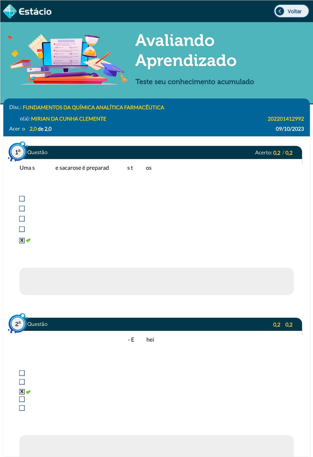 09/10/23, 10:09 Estácio: Alunos https://simulado.estacio.br/alunos/ 1/6 Avaliando Aprendizado Teste seu conhecimento acumulado Disc.: FUNDAMENTOS DA QUÍMICA ANALÍTICA FARMACÊUTICA Aluno(a): MIRIAN DA CUNHA CLEMENTE 202201412992 Acertos: 2,0 de 2,0 09/10/2023 Acerto: 0,2 / 0,2 Uma solução de sacarose é preparada e, após todos os procedimentos adequados, realizados por um técnico quali�cado, foi aferida a concentração de 0,25 mol.l-1. Considerando que a massa molar da sacarose é de 342 g.mol-1, assinale a alternativa que indica a concentração dessa solução em gramas.l -1 : 6 x 1023 g.l-1 171 g.l-1 342 g.l -1 1,5 x 1023 g.l-1 85,5 g.l-1 Respondido em 09/10/2023 10:00:28 Explicação: A resposta certa é:85,5 g.l-1 Acerto: 0,2 / 0,2 (FUNDATEC - Prefeitura de Santa Rosa - RS - Engenheiro Químico - 2017) A solubilidade de uma substância que se dissolve com o aumento de volume e com a liberação de calor será favorecida pela: Baixa pressão somente. Alta pressão e alta temperatura. Baixa pressão e baixa temperatura. Baixa pressão e alta temperatura. Alta pressão e baixa temperatura. Respondido em 09/10/2023 10:01:05 Explicação: Questão1 a Questão2 a https://simulado.estacio.br/alunos/inicio.asp https://simulado.estacio.br/alunos/inicio.asp javascript:voltar(); javascript:voltar(); 09/10/23, 10:09 Estácio: Alunos https://simulado.estacio.br/alunos/ 2/6 A resposta certa é: Baixa pressão e baixa temperatura. Acerto: 0,2 / 0,2 Considerando os ácidos hipoiodoso (HIO), iodoso (HIO2), iódico (HIO3) e periódico (HIO4), marque a opção que traz os ácidos em forma crescente de acidez. HIO ; HIO2 ; HIO3 ; HIO4 HIO2 ; HIO ; HIO3 ; HIO4 HIO4 ; HIO3 ; HIO2 ; HIO HIO3 ; HIO ; HIO2 ; HIO4 HIO ; HIO2; HIO4 ; HIO3 Respondido em 09/10/2023 10:02:13 Explicação: A resposta certa é: HIO ; HIO2 ; HIO3 ; HIO4 Acerto: 0,2 / 0,2 Para uma aula experimental, um técnico deve selecionar um sal cuja solução aquosa tenha pH alcalino. O sal que satisfaz essa condição é: Sul�to de sódio (Na2SO3) Nitrato de potássio (KNO3) Brometo de lítio (LiBr) Cloreto de amônio (NH4Cl) lodeto de prata (AgI) Respondido em 09/10/2023 10:03:34 Explicação: A resposta correta é: Sul�to de sódio (Na2SO3) Acerto: 0,2 / 0,2 A absortividade molar de certo composto A em 370 nm é igual a 3200 cm-1/(mol/L). A faixa linear adequada para quanti�cação deste composto é de 0,05 ¿ 0,90 de absorbância. Três amostras líquidas distintas foram submetidas a medidas de absorbância no comprimento de onda supracitado usando uma cubeta de 15 mm de caminho ótico. Os dados obtidos por espectrofotometria estão na tabela abaixo: Questão3 a Questão4 a Questão5 a 09/10/23, 10:09 Estácio: Alunos https://simulado.estacio.br/alunos/ 3/6 Considerando que a absorbância exibida na tabela é oriunda apenas do composto A, a concentração (mmol/L) deste composto nas amostras 1, 2 e 3 são, respectivamente: 0,0700; 0,120; 0,156. 0,0701; 0,155; 0,162. 0,0690; 0,100; 0,146. 0,0101; 0,150; 0,180. 0,6875; 1,000; 1,458. Respondido em 09/10/2023 10:04:25 Explicação: A resposta correta é: 0,0690; 0,100; 0,146. Acerto: 0,2 / 0,2 Dois copos (A e B) contêm solução aquosa 1mol.L-1 em nitrato de prata e estão conectados entre si por uma ponte salina. Mergulha-se parcialmente um �o de prata na solução contida no copo A, conectando-o a um �o de cobre mergulhado parcialmente na solução contida no copo B. Após certo período, os dois �os são desconectados. Em seguida, o condutor metálico de A é conectado a um dos terminais de um multímetro e o de B, ao outro terminal. Admitindo que a corrente elétrica não circula pelo elemento galvânico e que a temperatura permanece constante, assinale a opção cujo grá�co represente da melhor forma como a diferença de potencial entre os dois eletrodos (ΔE = EA-EB) varia com o tempo. Respondido em 09/10/2023 10:05:22 Questão6 a 09/10/23, 10:09 Estácio: Alunos https://simulado.estacio.br/alunos/ 4/6 Explicação: A resposta correta é: Acerto: 0,2 / 0,2 Em relação ao processo de ionização, podemos a�rmar corretamente: Ocorre tanto em compostos iônicos como em compostos covalentes. Ocorre em compostos dotados de ligação metálica. Ocorre em compostos iônicos. Ocorre em algumas moléculas covalentes, principalmente ácidos. Forma soluções não eletrolíticas. Respondido em 09/10/2023 10:05:55 Explicação: A resposta certa é: Ocorre em algumas moléculas covalentes, principalmente ácidos. Acerto: 0,2 / 0,2 (Adaptado de: IBFC - SEDUC-MT - Professor de Educação Básica de Química - 2017) Sobre equilíbrio químico, considere as a�rmativas a seguir: I. As reações não vão até o �m. Elas continuam até que a composição da mistura reacional corresponda ao mínimo de entalpia. Essa composição é descrita por uma constante de equilíbrio característica da reação que depende da temperatura, entre outros fatores. II. Para controlar o rendimento de uma reação, precisamos entender a base termodinâmica do equilíbrio e como a posição atual de equilíbrio é afetada por condições como a temperatura e a pressão, por exemplo. III. O equilíbrio químico é o estágio da reação química em que não existe mais tendência a mudar a composição da mistura da reação, isto é, as concentrações ou pressões parciais dos reagentes e produtos. Como os equilíbrios físicos, todos os equilíbrios químicos são dinâmicos, com a reação direta e inversa ocorrendo com a mesma velocidade. IV. A termodinâmica descreve quantitativamente o equilíbrio, o que nos possibilita controlar a direção e o rendimento das reações. V. A composição de uma mistura de reação no equilíbrio é descrita pela constante de equilíbrio, que depende do produto das atividades dos produtos (elevadas a potências iguais aos coe�cientes estequiométricos da equação química balanceada da reação), dividido pelo produto das atividades dos reagentes (ele