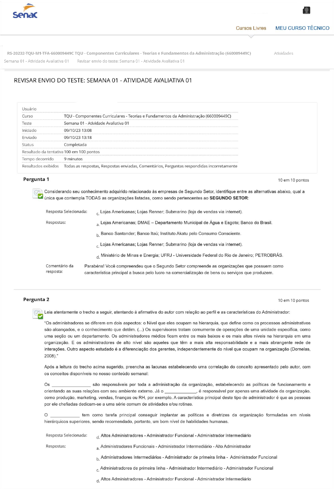 09/10/2023, 19:18 Revisar envio do teste: Semana 01 - Atividade Avaliativa 01 &... https://senac.blackboard.com/webapps/assessment/review/review.jsp?attempt_id=_33955866_1&course_id=_227582_1&content_id=_10279355… 1/5 09/10/2023, 19:18 Revisar envio do teste: Semana 01 - Atividade Avaliativa 01 &... https://senac.blackboard.com/webapps/assessment/review/review.jsp?attempt_id=_33955866_1&course_id=_227582_1&content_id=_10279355… 2/5 Comentário da Parabéns! Você compreendeu perfeitamente as formas de classificação para o Administrador com relação às resposta: suas características, perfil e tipologias. Pergunta 3 10 em 10 pontos Realize a leitura dos conceitos básicos de uma Organização e, posteriormente, preencha as lacunas: "Um ______________ pode ser entendido como uma sequência de ações que visam transformar ______________ ou matéria-prima nos bens ou serviços finais a serem comercializados no mercado, utilizando para isso combinações de recursos humanos e materiais. Uma importante característica das organizações é a sua capacidade de ser desmembrada em processos, os quais se diferenciam em conformidade com a ____________ e com os _____________ de cada organização”. Resposta Selecionada: Processo – Insumos - Natureza - Objetivos b. Pergunta 4 10 em 10 pontos Marque V, para verdadeiro e F, para falso para as seguintes afirmativas: ( ) Qualificam-se como entidades do Segundo Setor as Organizações Não- Governamentais (ONG’s) e as Organizações da Sociedade Civil de Interesse Público (OSCIPs) que são as associações, fundações entidades de assistência social, educação, saúde, esporte, meio ambiente, cultura, ciência e tecnologia, entre outras várias organizações da sociedade civil (Fulgencio, 2007). ( ) O Primeiro Setor, com finalidade lucrativa, em que pese a modernização das suas estruturas de funcionamento e de gestão, necessita operar segundo uma lógica própria que viabilize a única forma da sua sobrevivência como setor constitutivo de uma sociedade capitalista, que vem a ser a obtenção do lucro (Voltolini, 2009). ( ) As organizações do Terceiro Setor administram poucos recursos, os que vêm do seu próprio patrimônio, se elas tiverem, ou da possibilidade de gerar recursos pelos seus serviços ou pela captação deles, mas sempre dentro dos limites da premissa "sem fins de lucro” (Kother, 2008). ( ) Primeiro Setor tem uma fonte geradora de recursos: impostos, tributos, multas e outros (Kother, 2008). Assinale as alternativas corretas: Resposta Selecionada: F – F – V - V c. Pergunta 5 10 em 10 pontos Preencha as lacunas: As ______________ permitem ao homem fazer coisas que, _____________, não seria capaz de fazer, ajudam a dar continuidade à busca pelo conhecimento e podem ser uma importante forma de desenvolvimento na carreira. Passamos quase toda a nossa vida trabalhando em organizações ou participando delas, as quais, por mais que se diferenciem umas das outras, têm em comum a busca por um ____________ ou finalidade. Resposta Selecionada: b. Organizações – Individualmente - Objetivo Respostas: a. Organizações – Coletivamente - Lucro b. Organizações – Individualmente - Objetivo c. Organizações – Coletivamente - Objetivo d. Organizações – Individualmente - Lucro Pergunta 6 10 em 10 pontos Respostas: Comentário da resposta: a. Recurso – Projetos – Divisão do trabalho - Projetos b. Processo – Insumos - Natureza - Objetivos c. Processo – Projetos – Divisão do trabalho - Projetos d. Recurso – Projetos - Natureza - Objetivos Parabéns! Você apropriou-se com êxito dos conceitos de organização e da importância da participação individual para benefício coletivo de uma empresa. Respostas: Comentário da resposta: a. V – F – V - V b. V – V – V - V c. F – F – V - V d. F – F – V – F Parabéns! Você compreendeu corretamente os conceitos e a caracterização de empresas vinculadas ao Primeiro, Segundo e Terceiro Setor. Comentário da resposta: Parabéns! Você apropriou-se com êxito dos conceitos de Organização e a sua importância para as pessoas e processos. 09/10/2023, 19:18 Revisar envio do teste: Semana 01 - Atividade Avaliativa 01 &... https://senac.blackboard.com/webapps/assessment/review/review.jsp?attempt_id=_33955866_1&course_id=_227582_1&content_id=_10279355… 3/5 Considerando o fluxo de informações e de trocas nos diferentes setores organizacionais, assinale a alternativa que contempla uma correta correlação entre a tipologia das organizações e seus fluxos característicos: Assinale a alternativa correta: Resposta Selecionada: A = Terceiro Setor; B = Primeiro Setor; C = Segundo Setor d. Pergunta 7 10 em 10 pontos Considerando os conhecimentos adquiridos ao longo dessa semana, identifique entre as alternativas a seguir, quais representam corretamente características que são comuns às empresas englobadas pelo Terceiro Setor: I – Realizam atividades de interesse comum. II – Esse tipo de organização, tem eliminado o conflito de interesses existente entre o público e o privado na medida em que atua emrelação de parceria simultaneamente com o primeiro (governo) e com o segundo setores (empresas). III – Tem como funções típicas: arrecadar impostos, legislar, exercer a justiça e prover a segurança pública. IV – Empregam amplamente a mão de obra voluntária. Assinale as alternativas corretas: Respostas: Comentário da resposta: A = Primeiro Setor; B = Segundo Setor; C = Terceiro Setor a. b. A = Segundo Setor; B = Terceiro Setor; C = Primeiro Setor c. A = Terceiro Setor; B = Segundo Setor; C = Primeiro Setor d. A = Terceiro Setor; B = Primeiro Setor; C = Segundo Setor Parabéns! Você compreendeu corretamente os conceitos e a caracterização de empresas vinculadas ao Primeiro, Segundo e Terceiro Setor. 09/10/2023, 19:18 Revisar envio do teste: Semana 01 - Atividade Avaliativa 01 &... https://senac.blackboard.com/webapps/assessment