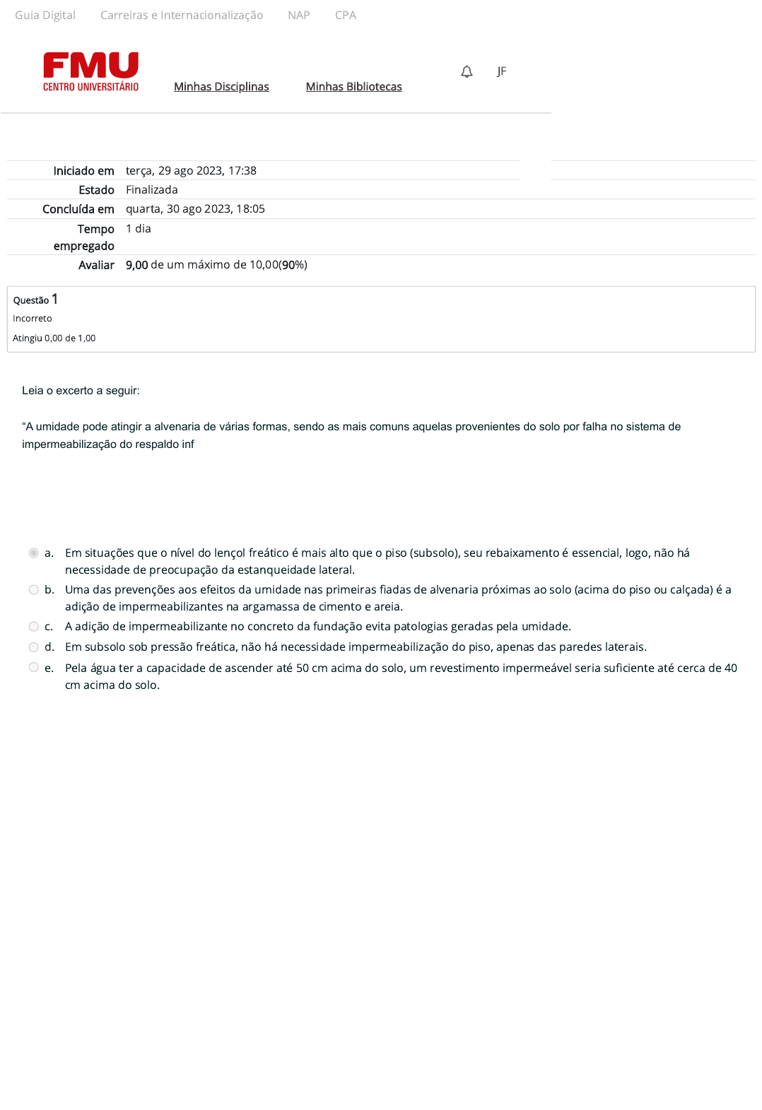 10/9/23, 6:26 PM Atividade 2 (A2): Revisão da tentativa https://ambienteacademico.com.br/mod/quiz/review.php?attempt=2787237&cmid=1089208 1/7 Iniciado em terça, 29 ago 2023, 17:38 Estado Finalizada Concluída em quarta, 30 ago 2023, 18:05 Tempo empregado 1 dia Avaliar 9,00 de um máximo de 10,00(90%) Questão 1 Incorreto Atingiu 0,00 de 1,00 Leia o excerto a seguir: “A umidade pode atingir a alvenaria de várias formas, sendo as mais comuns aquelas provenientes do solo por falha no sistema de impermeabilização do respaldo inferior e nas proximidades do piso, pontos por onde se inicia uma infiltração de água, e por capilaridade se alastra por boa parte da parede” (MARCELLI, 2007, p. 137). MARCELLI, M. Sinistros na construção civil. São Paulo: Pini, 2007. Com base no apresentado, assinale a alternativa correta: a. Em situações que o nível do lençol freático é mais alto que o piso (subsolo), seu rebaixamento é essencial, logo, não há necessidade de preocupação da estanqueidade lateral. b. Uma das prevenções aos efeitos da umidade nas primeiras �adas de alvenaria próximas ao solo (acima do piso ou calçada) é a adição de impermeabilizantes na argamassa de cimento e areia. c. A adição de impermeabilizante no concreto da fundação evita patologias geradas pela umidade. d. Em subsolo sob pressão freática, não há necessidade impermeabilização do piso, apenas das paredes laterais. e. Pela água ter a capacidade de ascender até 50 cm acima do solo, um revestimento impermeável seria su�ciente até cerca de 40 cm acima do solo. Guia Digital Carreiras e Internacionalização NAP CPA Responsabilidade Socioambiental Minhas Disciplinas Minhas Bibliotecas JF https://codely-fmu-content.s3.amazonaws.com/Moodle/GuiaDigital/Guia+digital/index.html https://carreiras.fmu.br/ https://codely-fmu-content.s3.amazonaws.com/Moodle/NAP/inicial/nap/fmu/index.html https://codely-fmu-content.s3.amazonaws.com/Moodle/CPA/landing_CPA/index.html https://portal.fmu.br/sustentabilidade https://ambienteacademico.com.br/ https://ambienteacademico.com.br/ https://ambienteacademico.com.br/course/view.php?id=236 10/9/23, 6:26 PM Atividade 2 (A2): Revisão da tentativa https://ambienteacademico.com.br/mod/quiz/review.php?attempt=2787237&cmid=1089208 2/7 Questão 2 Correto Atingiu 1,00 de 1,00 Leia o excerto a seguir: “Nas argamassas de revestimento a incidência de fissuras, sem que haja movimentação ou fissuração da base (estrutura de concreto ou alvenaria), ocorre geralmente devido a fatores relativos à execução do revestimento argamassado, [...] principalmente por retração hidráulica da argamassa” (BAUER, 1997, p. 322). BAUER, R. J. F. Patologia em revestimentos de argamassa inorgânica. In: Simpósio brasileiro de tecnologia das argamassas. In: SIMPÓSIO BRASILEIRO DE TECNOLOGIA DAS ARGAMASSAS, 2., 1997, Salvador. Anais [...]. Salvador: CETA/ANTAC, 1997. p. 321-333. A respeito da retração em alvenarias, analise as afirmativas a seguir, e assinale V para a(s) Verdadeira(s) e F para a(s) Falsa(s). I. ( ) Grandes retrações, causadas por um traço inadequado ou por execuções indevidas, dão origem a macrofissuras e grandes destacamentos da argamassa. II. ( ) A retração é um tipo de fissura geométrica. III. ( ) As fissuras que são encontradas, geralmente, em marquises, sacadas (lajes em balanço) ou oitões isentos de pilares de amarração são denominadas de retração. IV. ( ) Fissuras importantes de retração são observadas em paredes monolíticas de concreto. Assinale a alternativa que apresenta a sequência correta: a. F, F, F, F. b. V, V, F, V. c. F, V, F, V. d. V, V, V, V. e. V, V, F, F. Guia Digital Carreiras e Internacionalização NAP CPA Responsabilidade Socioambiental Minhas Disciplinas Minhas Bibliotecas JF https://codely-fmu-content.s3.amazonaws.com/Moodle/GuiaDigital/Guia+digital/index.html https://carreiras.fmu.br/ https://codely-fmu-content.s3.amazonaws.com/Moodle/NAP/inicial/nap/fmu/index.html https://codely-fmu-content.s3.amazonaws.com/Moodle/CPA/landing_CPA/index.html https://portal.fmu.br/sustentabilidade https://ambienteacademico.com.br/ https://ambienteacademico.com.br/ https://ambienteacademico.com.br/course/view.php?id=236 10/9/23, 6:26 PM Atividade 2 (A2): Revisão da tentativa https://ambienteacademico.com.br/mod/quiz/review.php?attempt=2787237&cmid=1089208 3/7 Questão 3 Correto Atingiu 1,00 de 1,00 Questão 4 Correto Atingiu 1,00 de 1,00 Leia o excerto a seguir: “O reforço ou recuperação de estruturas de concreto existentes para resistir aumento de cargas de projeto, perda de força devido a deterioração, deficiências de projeto ou construção, ou ainda aumentar a ductilidade é tradicionalmente realizado usando materiais convencionais e técnicas de construção.” (ACI, 2008, p. 3) ACI – AMERICAN CONCRETE INSTITUTE. Guide for the Design and Construction of Externally Bonded FRP Systems for Strengthening Concrete Structures. Farmington HillsI: ACI, 2008. Considerando o excerto apresentado sobre a recuperação estrutural, analise as afirmativas a seguir: I. O concreto, argamassa e madeira são os materiais mais utilizados na recuperação estrutural. A finalidade desses materiais é devolver a resistência inicial ao concreto. II. Para iniciar a recuperação de um elemento estrutural proveniente da corrosão das armaduras, primeiramente, se deve remover o concreto nas barras de aço para depois remover a camada oxidada. III. Ao longo da vida útil, a medida e o comportamento de cada produto (no caso o elemento estrutural) exposto ao ambiente e à ação dos usuários são definidos como desempenho. IV. A recuperação de fissuras pode ser realizada com a aplicação de resina epóxi. É correto o que se afirma em: a. I, II e IV, apenas. b. I, II e III, apenas. c. I e II, apenas. d. II, III e IV, apenas. e. II e III, apenas. Leia o excerto a seguir: “A ausência ou a má utilização de juntas de dilatação nas estr