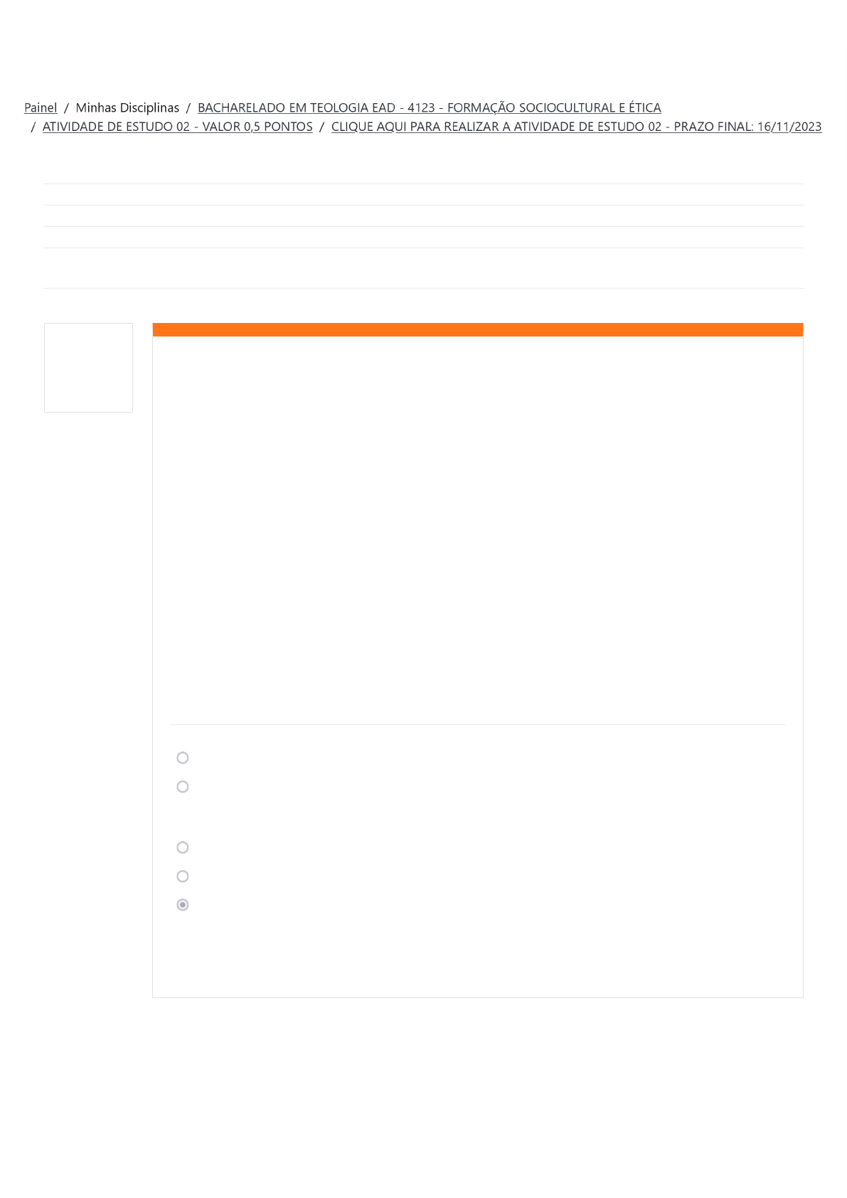 Questão 1 Completo Atingiu 0,00 de 0,05 Iniciado em segunda, 9 out 2023, 19:21 Estado Finalizada Concluída em segunda, 9 out 2023, 19:52 Tempo empregado 30 minutos 54 segundos Avaliar 0,35 de um máximo de 0,50(70%) Leia atentamente as sentenças abaixo sobre a Descoberta da América e o primeiro contato com os índios. I - O desenvolvimento cultural e comercial da Europa levou em 12 de Outubro de 1492, a descoberta da América pelo explorador Genovês Cristóvão Colombo que navegava representando os reis Fernando de Aragão e Isabel de Castela, região que posteriormente passa a se intitular “Espanha”. II - Colombo iniciou a exploração do território descoberto por ele e colocou o nome de São Salvador assim que pisou em nosso continente. III – Uma visão eurocêntrica se reflete no desprezo pelo nativo aqui existente e se reflete no próprio nome que foi adotado e que repetimos até hoje, ou seja, os chamamos de Índios, mesmo não sendo moradores das Índias. Assinale a única alternativa correta: a. As sentenças I, II III estão corretas. b. Somente a II está correta. c. Somente a III está correta. d. Somente a I está correta. e. Somente a I e II estão corretas. Sua resposta está incorreta. Questão 2 Completo Atingiu 0,05 de 0,05 "O sertanejo é, antes de tudo, um forte. Não tem o raquitismo exaustivo dos mestiços neurasténicos do litoral. A sua aparência, entretanto, ao primeiro lance de vista, revela o contrario. Falta-lhe a plástica impecável, o desempenho, a estrutura corretíssima das organizações atléticas. É desgracioso, desengonçado, torto. Hércules Quasímodo, reflete o aspecto, a lealdade típica dos fracos. Agrava-o a postura normalmente abatida, num manifestar de displicência que lhe dá um caráter de humildade deprimente.(...) É o homem permanentemente fatigado" (Euclides da Cunha. Os sertões. 1982, p. 47). Sobre o trecho do Os sertões, podemos considerar que estão corretas as afirmações: I - Há implícito no discurso de Euclides da Cunha um certo determinismo geográfico. II - O sertanejo não encontra dificuldades de se adaptar ao meio em que vive. III - Há uma contradição entre a aparência física e a capacidade de adaptação ao meio que é característica do sertanejo. IV - Os aspectos físicos do sertanejo são resultado da miscigenação racial incentivada pelo governo republicano no início do século XX. V - Não há relação entre meio geográfico e desenvolvimento corporal. Assinale a alternativa correta: a. II e III b. II, III e IV c. I e II d. III e V e. I e III Sua resposta está correta. Questão 3 Completo Atingiu 0,05 de 0,05 Questão 4 Completo Atingiu 0,00 de 0,05 Leia o trecho da Carta de Pero de Vaz de Caminha: “Ali veríeis galantes, pintados de preto e vermelho, e quartejados, assim pelos corpos como pelas pernas, que, certo, assim pareciam bem. Também andavam entre eles quatro ou cinco mulheres, novas, que assim nuas, não pareciam mal. Entre elas andava uma, com uma coxa, do joelho até o quadril e a nádega, toda tingida daquela tintura preta; e todo o resto da sua cor natural. Outra trazia ambos os joelhos com as curvas assim tintas, e também os colos dos pés; e suas vergonhas tão nuas, e com tanta inocência assim descobertas, que não havia nisso desvergonha nenhuma." O Texto acima demonstra: a. Os aspectos importantes da cultura indígena, como a pintura corporal e a nudez que para Caminha é algo chamado por ele de “inocência”. b. O primeiro contato com os índios no Brasil e o interesse em conhecer a importante cultura dos nativos. c. A vergonha dos portugueses em estar ao lado de índios nús e pervertidos. d. A maquiagem usada pelos índios que iriam ser a base para as mulheres europeias. e. O interesse dos marinheiros portugueses nas índias nuas que não pareciam mal. Sua resposta está correta. Desde o ano de 1991 o Instituto Brasileiro de Geografia e Estatística vem se utilizando das seguintes opções de classificação racial para identificar seus entrevistados: branco, pardo, preto, amarelo e indígena. Dentre as classificações a seguir, analise quais as características que estão incluídas nessa classificação. a. Raciais, de cor e de nacionalidade. b. Raciais e de cor. c. Raciais, de cor, étnicas e de gênero. d. De cor, étnicas e de nacionalidade. e. De cor, étnicas e de gênero. Sua resposta está incorreta. Questão 5 Completo Atingiu 0,05 de 0,05 O determinismo biológico é uma teoria bem antiga e um dos fatores principais e da mesma é afirmar que existem determinadas “raças” que possuem capacidades ou habilidades superiores a outra. Vale ressaltar que esse determinismo é base para o surgimento da xenofobia, ou seja, aversão ao extrangeiro, provocando ainda fatos e atidudes extremas como a praticada por Adolf Hitler e o partido Nazista com os Judeus, ciganos entre outros. O antropologo Roque Laraia chama isso de Senso Comum do Determinismo biológico. Leia as sentenças abaixo e assinale ( V ) para verdadeiro e ( F ) para exemplos de senso comum do Determinismo Biológico. ( ) Os Nórdicos tem uma surioridade intelectual em relação aos negros. ( ) Os judeus são os melhores negociantes do planeta. ( ) Os portugueses são burros em relação aos brasileiros. Assinale a alternativa com a sequência correta: a. V – F – V b. V – F – F c. V – V – V d. F – F – F e. V – V – F Sua resposta está correta. Questão 6 Completo Atingiu 0,05 de 0,05 Questão 7 Completo Atingiu 0,05 de 0,05 Quando Pedro Alvares Cabral chegou ao nosso território em 22 de abril de 1500, existia um número de aproximadamente 100 milhões de índios, e, no Brasil existia cerca de cinco milhões de nativos de várias tribos e de um variado tronco linguístico. Complete a afirmação abaixo com cada tronco linguístico de cada região do período da descoberta. Os ________________ estavam na região litorânea, os ______________ ou tapuias que se situavam na região 