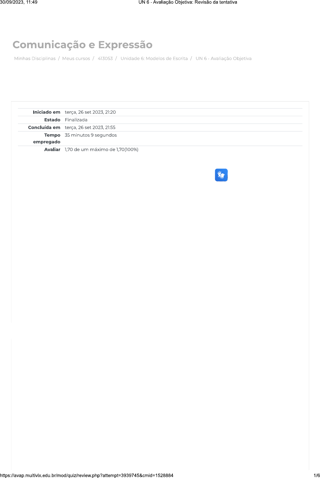 Comunicação e Expressão Minhas Disciplinas / Meus cursos / 413053 / Unidade 6 - Modelos de Escrita / UN 6 - Avaliação Objetiva Questão 1 Em relação...