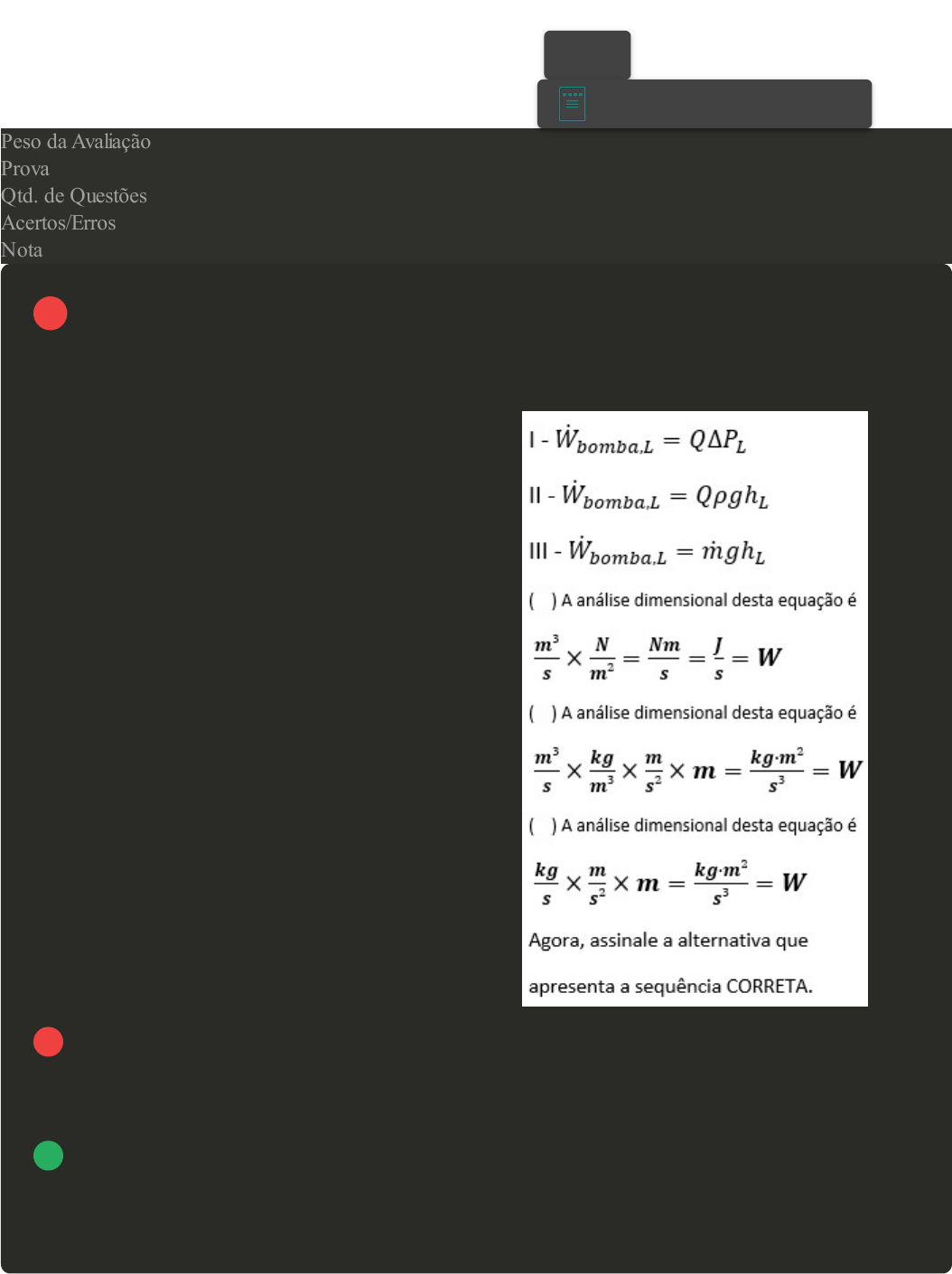 09/10/2023, 21:04 Avaliação Final (Objetiva) - Individual about:blank 1/8 Prova Impressa GABARITO | Avaliação Final (Objetiva) - Individual (Cod.:886595) Peso da Avaliação 3,00 Prova 71884001 Qtd. de Questões 12 Acertos/Erros 6/6 Nota 6,00 A queda de pressão ou perda de carga é um parâmetro importante para a análise do escoamento de fluidos em tubulações e está diretamente relacionada aos requisitos de potência exigidos pelo ventilador ou bomba para manter o escoamento do fluido com vazão constante. Com base na relação entre potência da máquina hidráulica e queda de pressão ou perda de carga, faça uma análise dimensional das equações apresentadas e associe os itens, utilizando o código a seguir: A III - I - II. B I - III - II. C I - II - III. D II - III - I. VOLTAR A+ Alterar modo de visualização 1 09/10/2023, 21:04 Avaliação Final (Objetiva) - Individual about:blank 2/8 O matemático holandês Simon Stevin (1548-1620) publicou em 1586 o princípio físico fundamental da estática dos fluidos, utilizado nos cálculos da manometria. A figura anexa apresenta este princípio, ilustrado no tanque de geometria irregular contendo água e mercúrio. Com base neste conceito, avalie as asserções a seguir e a relação proposta entre elas: I- A pressão do fluido no ponto "D" do tanque é maior do que a pressão no ponto "H". PORQUE II- A altura de coluna de líquido e a massa específica dos fluidos influenciam a pressão manométrica nestes pontos. Assinale a alternativa CORRETA: A A asserção I é uma proposição verdadeira mas a asserção II não é uma justificativa correta da asserção I. B A asserção I é uma proposição falsa e a asserção II é uma proposição verdadeira. C As asserções I e II são proposições falsas e a asserção II não é uma justificativa correta da asserção I. D As asserções I e II são proposições verdadeiras e a asserção II é uma justificativa correta da asserção I. [Laboratório Virtual – Experimento de Reynolds] Na prática experimental do laboratório virtual desta disciplina, você conheceu o Experimento de Reynolds, executado para observação e caracterização dos regimes de escoamento de um fluido com base nas forças inerciais e forças viscosas atuantes. Com base no sumário teórico, roteiro da prática e na condução do experimento no laboratório virtual, analise a situação proposta a seguir: 2 3 09/10/2023, 21:04 Avaliação Final (Objetiva) - Individual about:blank 3/8 Um aluno que está realizando um experimento de Reynolds na bancada em regime turbulento fechou completamente a válvula de adição de corante no fluxo de água pela tubulação. O que irá acontecer com o escoamento do fluido? A O escoamento de água irá se tornar um fluxo em regime laminar. B Nada irá acontecer com o escoamento do fluido. O aluno apenas não irá conseguir identificar qual é o regime de escoamento da água sem a adição do corante no fluxo. C O escoamento de água irá se tornar um fluxo em regime turbulento mais acentuado, com maior número de Reynolds. D O escoamento de água irá se tornar um fluxo em regime de transição. [Laboratório Virtual – Experimento de Reynolds] Na prática experimental do laboratório virtual desta disciplina, você conheceu o Experimento de Reynolds, executado para observação e caracterização dos regimes de escoamento de um fluido com base nas forças inerciais e forças viscosas atuantes. Com base no sumário teórico, roteiro da prática e na condução do experimento no laboratório virtual, analise a situação proposta a seguir: Um aluno que está realizando um experimento de Reynolds na bancada em regime turbulento fechou completamente a válvula de adição de corante no fluxo de água pela tubulação. O que irá acontecer com o escoamento do fluido? Assinale a alternativa INCORRETA: A Quando é retirado o corante, não é alterada a vazão de maneira significativa para tornar o escoamento de água ainda mais turbulento. B A retirada do corante do escoamento de água não altera a vazão de maneira significativa para tornar o escoamento laminar. C Quando é retirado o corante, o escoamento de água irá se tornar um fluxo em regime de transição. 4 09/10/2023, 21:04 Avaliação Final (Objetiva) - Individual about:blank 4/8 D Ao retirar o corante, o aluno não irá conseguir perceber a turbulência no fluxo, mas não irá ter uma alteração significativa na vazão dentro do tubo. A força de flutuação ou empuxo, que também é conhecida como Princípio de Arquimedes, é a força exercida por um fluido sobre um objeto submerso ou flutuante, apresentando direção vertical e sentido para cima. Considere um recipiente flutuante na água doce conectado a um bloco de aço, conforme ilustra a figura a seguir. No caso "a", o bloco de aço está dentro do recipiente e no caso "b", o bloco de aço está suspenso abaixo do recipiente e está totalmente submerso. Com base nesta situação, analise as sentenças a seguir: I- No caso "a", o recipiente afundará a uma profundidade (d) menor na água. II- No caso "b", o recipiente afundará a uma profundidade (d) menor na água. III- A profundidade (d) na qual o recipiente afundará na água será igual em ambos os casos. IV- A profundidade (d) na qual o recipiente afundará depende da densidade da água. Assinale a alternativa CORRETA: A As sentenças II e IV estão corretas. B As sentenças I e IV estão corretas. C Somente a sentença III está correta. 5 09/10/2023, 21:04 Avaliação Final (Objetiva) - Individual about:blank 5/8 D As sentenças III e IV estão corretas. Um tipo de medidor de velocidade e vazão de fluidos muito utilizado é o medidor por obstrução chamado de placa-orifício. As configurações comuns deste tipo de medidor estão ilustradas na figura anexa. Com base nas características do medidor placa-orifício, analise as sentenças a seguir: I- O medidor do tipo placa-orifício mede de forma