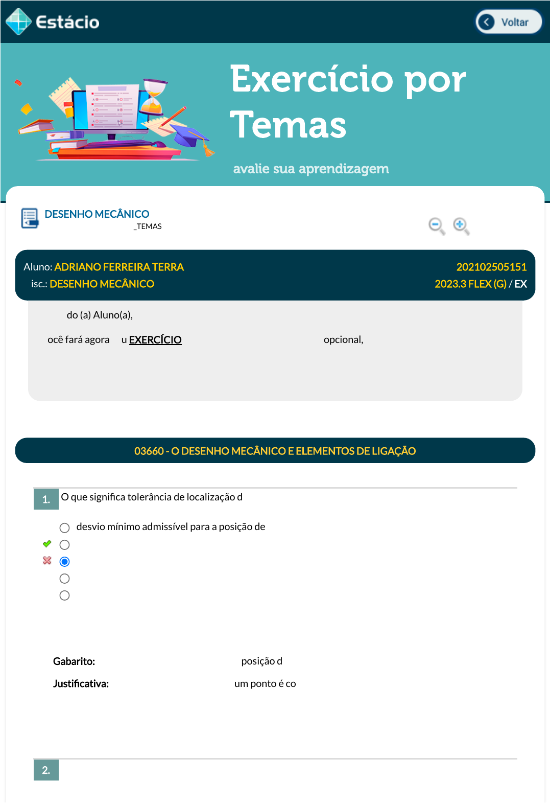 19/09/2023 22:47 Estácio: Alunos https://simulado.estacio.br/alunos/ 1/5 Exercício por Temas avalie sua aprendizagem O que signi�ca tolerância de localização de um ponto? Que tipo de cavilha é utilizada para �xação e junção em casos de aplicação de forças variáveis e simétricas, bordas de peças de ferro fundido? DESENHO MECÂNICO Lupa DGT1103_202102505151_TEMAS Aluno: ADRIANO FERREIRA TERRA Matr.: 202102505151 Disc.: DESENHO MECÂNICO 2023.3 FLEX (G) / EX Prezado (a) Aluno(a), Você fará agora seu EXERCÍCIO! Lembre-se que este exercício é opcional, mas não valerá ponto para sua avaliação. O mesmo será composto de questões de múltipla escolha. Após responde cada questão, você terá acesso ao gabarito comentado e/ou à explicação da mesma. Aproveite para se familiarizar com este modelo de questões que será usado na sua AV e AVS. 03660 - O DESENHO MECÂNICO E ELEMENTOS DE LIGAÇÃO 1. desvio mínimo admissível para a posição de um elemento em relação à sua posição teórica. desvio máximo admissível para a posição de um elemento em relação à sua posição teórica. desvio máximo admissível para a posição de um elemento. desvio médio admissível para a posição de um elemento em relação à sua posição teórica. desvio mínimo admissível para a posição de um elemento. Data Resp.: 19/09/2023 22:44:46 Explicação: Gabarito: desvio máximo admissível para a posição de um elemento em relação à sua posição teórica. Justi�cativa: Tolerância de localização de um ponto é considerado o desvio máximo admissível para a posição de um elemento em relação à sua posição teórica. 2. javascript:voltar(); javascript:voltar(); javascript:diminui(); javascript:aumenta(); 19/09/2023 22:47 Estácio: Alunos https://simulado.estacio.br/alunos/ 2/5 No Brasil e Europa as seis vistas ortográ�cas são baseadas na plani�cação do: Que tipo de corte é adotado quando se deseja representar somente uma parte da peça para salientar algum detalhe dela? KS 6 KS 3 KS 9 KS 7 KS 1 Data Resp.: 19/09/2023 22:47:16 Explicação: Gabarito: KS 3 Justi�cativa: KS 1 (DIN 1471) Fixação e junção; KS 3 (DIN 1473) Fixação e junção em casos de aplicação de forças variáveis e simétricas, bordas de peças de ferro fundido; KS 6 e KS 7 - Ajustagem e �xação de molas e correntes; KS 9 - Utilizado nos casos em que se tem necessidade de puxar a cavilha do furo. 3. 1º diedro 3º diedro 4º diedro 2º diedro 1º e 3º diedros Data Resp.: 19/09/2023 22:45:02 Explicação: Gabarito: 1º diedro Justi�cativa: No Brasil e na Europa a plani�cação das 6 vistas ortográ�cas é baseado no 1º diedro, ao passo que os EUA e Canadá utilizam o 3º diedro. 4. Composto por planos concorrentes Total Composto por planos paralelos Meio corte Parcial Data Resp.: 19/09/2023 22:45:25 Explicação: Gabarito: Meio corte Justi�cativa: O meio corte é adotado quando se deseja representar somente uma parte da peça em corte para salientar algum detalhe da mesma. Entre a região cortada e a região representada em vista são separadas por uma linha de eixo. 19/09/2023 22:47 Estácio: Alunos https://simulado.estacio.br/alunos/ 3/5 Para adquirir os rebites adequados ao seu trabalho, é necessário que você conheça suas especi�cações, ou seja: O que signi�ca a Figura a seguir? 5. de que material é feito; · o tipo de sua cabeça; · o diâmetro do seu corpo; · o comprimento a ser unido. que material vai unir; · o tipo de sua cabeça; · o diâmetro do furo; · o comprimento a ser unido. que material vai unir; · o tipo de sua cabeça; · o diâmetro do seu corpo; · o comprimento a ser unido. de que material é feito; · o tipo de sua cabeça; · o diâmetro do seu corpo; · o seu comprimento útil. que material vai unir; · o tipo de sua cabeça; · o diâmetro do furo; · o seu comprimento útil. Data Resp.: 19/09/2023 22:45:40 Explicação: Gabarito: de que material é feito; · o tipo de sua cabeça; · o diâmetro do seu corpo; · o seu comprimento útil. Justi�cativa: Para adquirir os rebites adequados ao seu trabalho, é necessário que você conheça suas especi�cações, ou seja: · de que material é feito; · o tipo de sua cabeça; · o diâmetro do seu corpo; · o seu comprimento útil. 6. O plano médio do rasgo deve situar-se entre dois planos distantes de 0,03 mm, paralelos entre si de forma a manter um plano médio da referência "A". O plano superior do rasgo deve situar-se entre dois planos distantes de 0,03 mm, paralelos entre si de forma contínua em relação ao plano médio da referência "A". O plano médio do rasgo deve situar-se entre dois planos distantes de 0,03 mm, paralelos entre si de forma contínua em relação ao plano médio da referência "A". O plano médio do rasgo deve situar-se entre dois planos distantes de 0,03 mm, paralelos entre si de forma simétrica em relação ao plano médio da referência "A". O plano superior do rasgo deve situar-se entre dois planos distantes de 0,03 mm, paralelos entre si de forma simétrica em relação ao plano médio da referência "A". Data Resp.: 19/09/2023 22:47:07 Explicação: Gabarito: O plano médio do rasgo deve situar-se entre dois planos distantes de 0,03 mm, paralelos entre si de forma simétrica em relação ao plano médio da referência "A". Justi�cativa: A Figura trata de uma tolerância geométrica de posição de simetria, onde o plano médio do rasgo deve situar-se entre dois planos distantes de 0,03 mm, paralelos entre si de forma a manter a simetria em relação ao plano médio da referência "A". 19/09/2023 22:47 Estácio: Alunos https://simulado.estacio.br/alunos/ 4/5 Quais fatores diferenciam os diversos tipos de parafusos? Os parafusos se diferenciam pela forma da rosca, da cabeça, da haste e do tipo de acionamento: O que consideramos quando temos que escolher o tipo de cabeça de parafuso a ser utilizada? No Desenho Técnico, nem todas as v