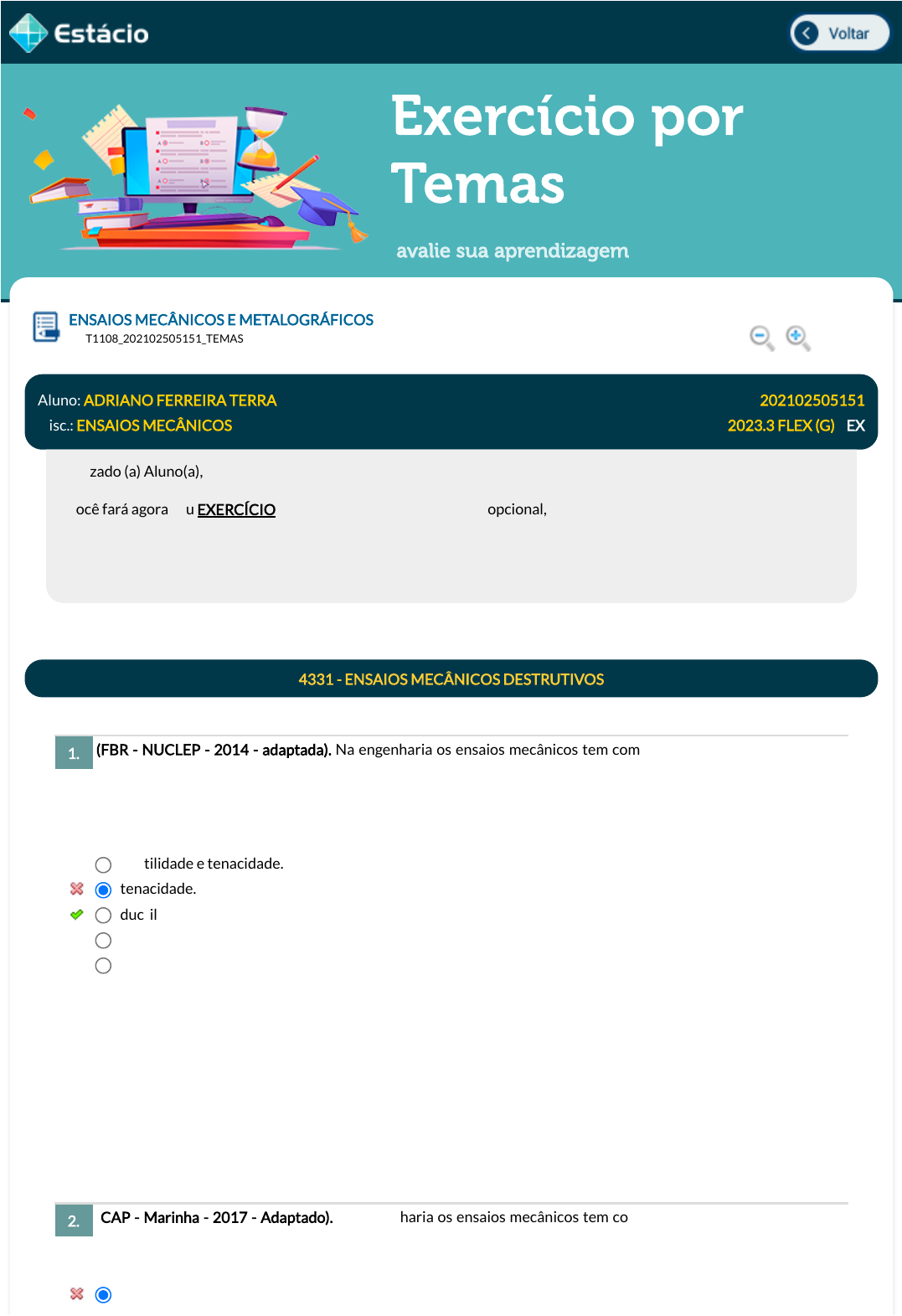 19/09/2023 23:13 Estácio: Alunos https://simulado.estacio.br/alunos/ 1/5 Exercício por Temas avalie sua aprendizagem (FBR - NUCLEP - 2014 - adaptada). Na engenharia os ensaios mecânicos tem como função fornecer informações para a determinação de parâmetros mecânicos úteis no dimensionamento de projetos, bem como para o controle de qualidade da produção. Neste contexto, o ensaio de dobramento é muito utilizado em juntas soldadas, para quali�cação de procedimentos de soldagem e de soldadores. Com o ensaio de dobramento realizado em juntas soldadas avalia-se: (CAP - Marinha - 2017 - Adaptado). Na engenharia os ensaios mecânicos tem como função fornecer informações para a determinação de parâmetros mecânicos úteis no dimensionamento de projetos, bem como para o controle de qualidade da produção. Neste contexto, a �uência pode ser de�nida como o fenômeno de deformação: ENSAIOS MECÂNICOS E METALOGRÁFICOS Lupa DGT1108_202102505151_TEMAS Aluno: ADRIANO FERREIRA TERRA Matr.: 202102505151 Disc.: ENSAIOS MECÂNICOS 2023.3 FLEX (G) / EX Prezado (a) Aluno(a), Você fará agora seu EXERCÍCIO! Lembre-se que este exercício é opcional, mas não valerá ponto para sua avaliação. O mesmo será composto de questões de múltipla escolha. Após responde cada questão, você terá acesso ao gabarito comentado e/ou à explicação da mesma. Aproveite para se familiarizar com este modelo de questões que será usado na sua AV e AVS. 4331 - ENSAIOS MECÂNICOS DESTRUTIVOS 1. ductilidade e tenacidade. tenacidade. ductilidade. resistência mecânica e ductilidade. tenacidade e resistência mecânica. Data Resp.: 19/09/2023 23:12:50 Explicação: O procedimento de avaliação da qualidade da solda é quanti�cado pela determinação percentual do alongamento das �bras superiores da solda no ensaio de dobramento guiado até que o ângulo seja igual a 1800. Essa quanti�cação é a mesma utilizada no ensaio de tração para a propriedade denominada ductilidade. 2. de um metal a tensão variável. javascript:voltar(); javascript:voltar(); javascript:diminui(); javascript:aumenta(); 19/09/2023 23:13 Estácio: Alunos https://simulado.estacio.br/alunos/ 2/5 (Aeronáutica - 2017 - Adaptada). Na engenharia os ensaios mecânicos tem como função fornecer informações para a determinação de parâmetros mecânicos úteis no dimensionamento de projetos, bem como para o controle de qualidade da produção. Neste contexto, considerando uma curva típica obtida durante a realização do ensaio de �uência, pode-se a�rmar que ela é dividida em: (CESGRANRIO - 2014 - Adaptada) Na engenharia os ensaios mecânicos tem como função fornecer informações para a determinação de parâmetros mecânicos úteis no dimensionamento de projetos, bem como para o controle de qualidade da produção. Neste contexto, o ensaio de dobramento em corpos de prova soldados, retirados de chapas ou tubos soldados, é realizado geralmente para quali�cação de soldadores e para avaliação de processos de solda. Nesse ensaio, a avaliação da qualidade da solda é feita com base na medição do(a): progressiva de um metal à temperaturas controladas. progressiva de um metal à tensão constante. de um metal a temperaturas variadas. de um metal a temperaturas constantes. Data Resp.: 19/09/2023 23:12:55 Explicação: O fenômeno da �uência é a deformação plástica de uma peça que ocorre em ambiente de temperatura elevada, sob tensão constante, mesmo abaixo do valor limite estático. Peças em reatores, turbinas etc estão sujeitas ao fenômeno de �uência que apresenta três estágios: primária, estacionária e terciária. 3. três estágios denominados taxa mínima de �uência, taxa crítica de �uência e relaxação, que são os parâmetros de engenharia obtidos no ensaio. um único estágio em que o crescimento temporal da deformação é exponencial. quatro estágios denominados inicial, estacionário, �uência terciária e �uência quaternária. três estágios denominados primário ou �uência primária, secundário ou �uência secundária, terciário ou �uência terciária. dois estágios denominados �uência inicial nos quais se determinam a taxa de �uência e �uência �nal. Data Resp.: 19/09/2023 23:12:59 Explicação: No ensaio de �uência, um corpo de provas é submetido a carregamento constante em fornos a temperatura alta e, também, constante. O output do ensaio é a curva deformação versus tempo em que há três regiões distintas: a �uência primária, a secundária e a terciária. Na secundária, a taxa de deformação é constante. 4. comprimento �nal do corpo de prova alongamento da face da solda ângulo de dobramento do corpo de prova garganta da junta soldada comprimento do cordão da solda Data Resp.: 19/09/2023 23:13:11 Explicação: O ensaio de dobramento é um ensaio mecânico destrutivo muito utilizado na avaliação da qualidade da solda bem como na quali�cação do operador, ou seja, o soldador. Na avaliação da solda, o método utilizado é o guiado em que o ângulo de dobramento é de 180°. Quanti�ca-se a variação percentual do comprimento das �bras externas da região soldada. 5. 19/09/2023 23:13 Estácio: Alunos https://simulado.estacio.br/alunos/ 3/5 (EBTT - IF - SUDESTE-MG - 2018 - Adaptada). Na engenharia os ensaios mecânicos tem como função fornecer informações para a determinação de parâmetros mecânicos úteis no dimensionamento de projetos, bem como para o controle de qualidade da produção. Neste contexto, é correto a�rmar que a propriedade mecânica que representa uma medida da capacidade de deformação plástica suportada até a fratura do material é: (CESGRANRIO - 2011 - Adaptada). Na engenharia os ensaios mecânicos tem como função fornecer informações para a determinação de parâmetros mecânicos úteis no dimensionamento de projetos, bem como para o controle de qualidade da produ