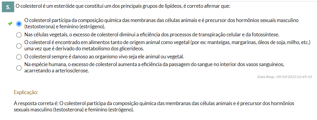 colesterol participa da composição química das membranas das células animais e é precursor dos hormônios sexuais masculino (testosterona) e feminino (estrógeno). Nas células vegetais, o excesso de colesterol diminui a eficiência dos processos de transpiração celular e da fotossíntese. colesterol é encontrado em alimentos tanto de origem animal como vegetal (por ex: manteigas, margarinas, óleos de soja, milho, etc.) uma vez que é derivado do metabolismo dos glicerídeos. O colesterol sempre é danoso ao organismo vivo seja ele animal ou vegetal. Na espécie humana, o excesso de colesterol aumenta a eficiência da passagem do sangue no interior dos vasos sanguíneos, acarretando a a) Somente a afirmativa 1 está correta. b) Somente as afirmativas 1 e 3 estão corretas. c) Somente as afirmativas 1, 2 e 3 estão corretas. d) Somente as afirmativas 1, 3 e 4 estão corretas. e) Todas as afirmativas estão corretas.