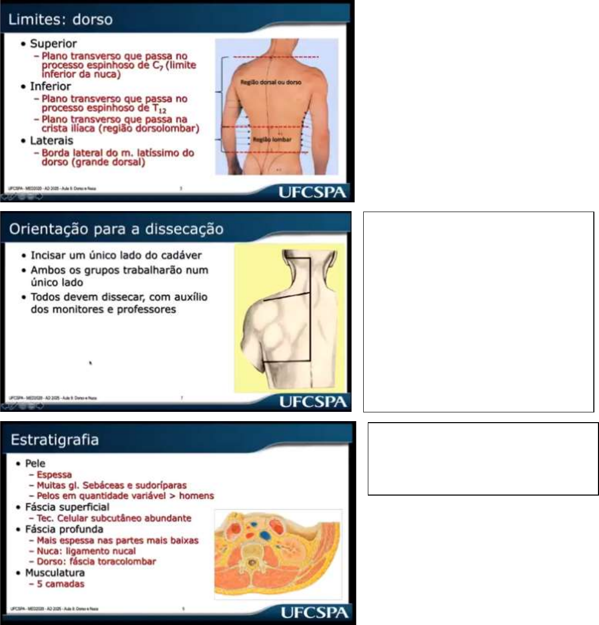 Aula Dorso e nuca Coluna vertebral e revestimentos • Identificar os limites do dorso e da nuca, estabelecer as incisões para a aula de dissecação • Estratigrafia – principio de camadas de construção do corpo humano (pele – superficial / Planos musculares – estruturas internas) • Movimentos do tronco Limites da Nuca No pescoço, nós temos duas regiões importantes a se considerar: Nuca é a parte posterior do pescoço que está abaixo da cabeça, a parte anterior é chamada de região cervical. A nuca tem um plano arciforme transverso que passa pela mastoide do osso temporal dos dois lados passando pela protuberância occipital externa. No plano inferior ele passa pelo plano transverso que passa no processo espinhoso de C7; Na borda lateral de um lado e de outro temos como limite a borda lateral do músculo Trapézio. 1-Incisão na linha média desde a protuberância occipital externa até o plano de T12. Esse plano que passa em T12, é feito a 2 incisão transversa que vai da margem lateral do latíssimo do dorso até a linha média, bem como uma 3 incisão da mastoide até a protuberância occipital externa. Por último, faz-se uma 4 incisão no plano transversal meio obliquo entre o processo espinhoso de C7 até uma protuberância palpada no ombro posterior chamada de Acrômio da escápula (acidente ósseo para a inserção de músculos e ligamentos). Estratigrafia: principio de construção cujo conceito diz que o corpo humano é constituído por camadas, desde a pele até camadas mais profundas. Ligamento nucal – unindo os processos espinhosos de todas as vértebras (Atlas, axis, até C7) fáscia profunda da região.