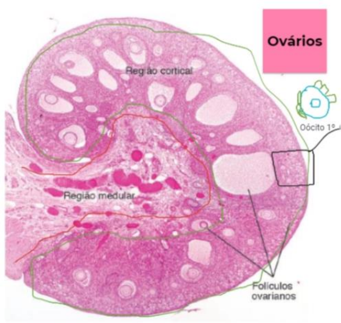 Sistema Reprodutor Feminino Dividido em genitalia interna, externa e glândula mamária. A genitalia interna compreende os ovários, tubas uterinas, útero e vagina. A genitália externa pe composta pelo monte púbis, lábios maiores e menores, clitóris, vestíbulo e abertura da vagina, hímen e óstio externo da uretra. As glandulas mamárias, do ponto de vista embriológico são uma glandula anexa da pele, mas costumamos estudá-las pois o desenvolvimento delas depende de hormônios produzido pelos ovários e seu funcionamento está diretamente relacionado com a função reprodutiva. OVÁRIOS tem função de produzir os gametas femininos e os hormônios (estrógeno e progesterona) que vão contribuir para o desenvolvimento das características sexuais secundárias externas e com a gametogênese. Os ovários são divididos em uma região mais interna (medular) que compreende a região do hilo do órgão, onde encontramos principalmente tecido conjuntivo propriamente dito. A outra região é chamada de região cortical conde encontramos os folículos ovarianos em diferentes estágios de maturação(tamanhos diferentes. O folículo ovariano é o conjunto formado pelo oócito 1°, mais células de revestimento. Temos então nessa área cortical um epitélio de revestimento simples cuboide revestindo a superfície. Logo abaixo dele temos tecido conjuntivo propriamente dito denso chamado de túnica albugínea. Entendendo a puberdade Até a puberdade, o vário não produz gameta nenhum. A partir da puberdade o hipotálamo começa a liberar o GNRH ( hormônio liberador de gonadotrofina) que vai agir sobre a hipófise (adenohipifise) promovendo o início da liberação de hormônio foliculoestimulante FSH e hormonio luteinizante LH, que vão atuar no ovário promovendo a maturação dos folículos e a ovulação. Todo mês cerca de 15-20 folículos (corte de folículos) iniciam o processo de maturação respondendo ao FSH. Um desses folículos começa a se desenvolver mais rápido que os demais, respondendo mais aos hormônios hipofisário, e as células que estão revestindo esse folículo passam a secretar o hormônio estrogênio, que além de ser responsável por desenvolver as características sexuais secundárias femininas e atuar no útero, ele também vai atuar na hipofise, bloqueando a liberação de FSH. Então aqueles folículos menores, que estavam com mais dificuldade de se desenvolver, como eles vão ficar privados desse FSH eles vão sofrer um processo de Atresia (morte celular), e aquele primeiro folículo grande (dominante), mais desenvolvido, começa a expressar receptores para o LH, continuando a se desenvolver. Conforme esse folículo vai crescendo cada vez mais, as celulas que revestem esse folículo (células da granulosa) vão secretando cada vez mais estrógenos, que vai gerando um feedback positivo sobre o LH, aumentando a sua liberação até que ocorra um pico, que age sobre o oócito, retomando a meiose, até a formação de oócito 2º, esse oócito que vai ser ovocitato (também como resposta ao LH). Nesse momento que ocorre a ovulação estamos na metade do ciclo menstrual. Esse folículo que gerou o ovócito secundário, após a ovulação, vai se transformar no corpo lúteo, que vai continuar a produzir estrógeno e vai passar a produzir também progesterona que começa a agir no útero, preparando-o para uma possivel gravidez caso o ovócito que está nas tubas uterinas seja fecundado. Se não ocorrer fecundação esse corpo lúteo passa a se degenerar (processo de luteólise) e a produção de progesterona e estrógeno caem. Essa queda da concentração de estrógeno e progesterona faz com que a hipófise volte a produzir FSH reiniciando o ciclo. Essa primeira parte do ciclo ovariano (desde o primeiro dia da menstruação até a ovulação) chamamos de fase folicular, que é quando o FSH tá agindo sobre os folículos. A segunda metade do ciclo (da ovulação até o primeiro dia da próxima menstruação) é chamada de fase lútea já que temos o corpo lúteo no ovário. Voltando... Esses folículos que fazem parte da corte folicular que vão iniciar o processo de maturação são chamados de folículos primordiais. Esses folículos primordiais tem em seu interior o oócito 1º revestido por células que apresentam uma morfologia pavimentosa (células foliculares). O folículo primordial é composto então pelo oócito 1º + células foliculares; eles sempre vão estar logo abaixo da túnica albugínea, muito próximos da superfície dos ovários. A maturação desses folículos primordiais ocorre com a manutenção do oócito 1º na prófase um mas as células foliculares vão sair de uma forma pavimentosa e vão passar a adotar uma morfologia cuboide. Esse folículo então, quando as células foliculares adquirem uma formação cuboide (células da granulosa) passa a se chamar de folículo primário unilaminar. Nesse estágio de folículo primário unilaminar, passa a ser sintetizada a zona pelúcida (capa glicoproteica eosinofílica) extremamente importante para a fertilização pois ela é uma das barreiras que o espermatozóide tem que vencer para fertilizar o oócito. Na maturação dos folículos, aquele que atinge a dominância primeiro via se transformar em folículo primário multilaminar, pois as células da granulosa passam a formar múltiplos extratos. Nesse estágio de folículo primário multilaminar a zona pelúcida já está completamente sintetizada. Nesse estágio também, as células do estroma do ovário passam a adotar uma conformação chamada de Teca Interna. (o estroma do ovário é formado basicamente por tecido conjuntivo [fibroblasto] e estes fibroblastos do tecido conjuntivo passam a sofrer uma modificação formando as células da teca interna, que respondem aos hormônios produzidos pela hipófise, produzindo hormônios andróginos. Esses hormônios produzidos pela célula da teca interna são enviados para as células da granulo