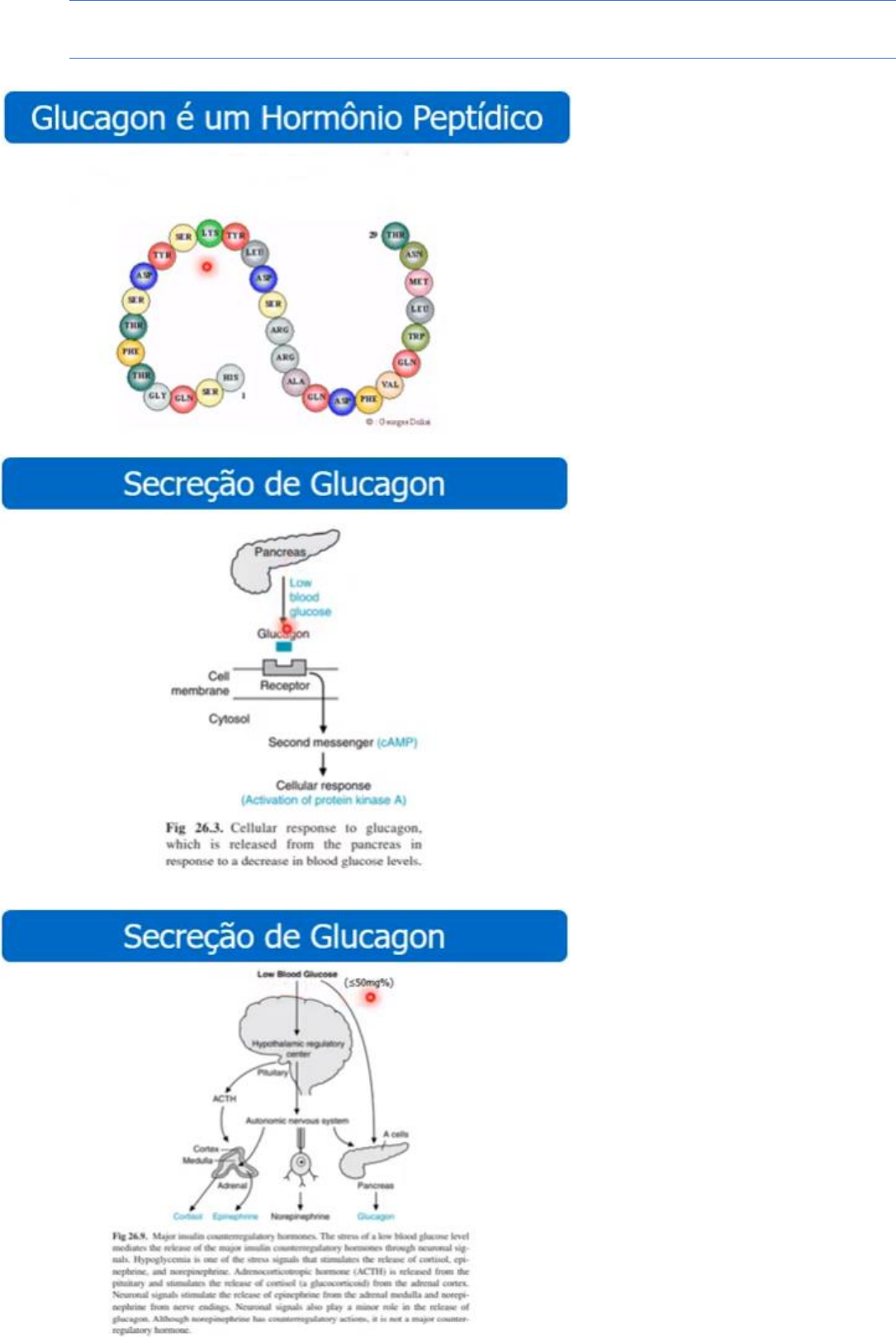TRANSDUÇÃO DE SINAL DO GLUCAGON E ADRENALINA O Glucagon é um hormônio peptídico, constituído por 29 resíduos de aa. Primeiramente ele é sintetizado como pré-pró-glucagon, uma molécula com 160 resíduos de aa. Quando essa molécula entra no lúmem do Retículo Endoplasmático, é convertida a glucagon por meio de várias clivagens proteolíticas. O glucagon é sintetizado e secretado pelo pâncreas por um dos três conjuntos de células endócrinas das ilhotas de Langerhans, as células Alfa- pancreáticas. Os principais estímulos para a liberação do glucagon são a Hipoglicemia e a baixa concentração de insulina no sangue. A baixa concentração de glicose sanguínea (valores menores ou iguais a 50mg%) podem afetar diretamente as células Alfa-pancreáticas ou indiretamente essas células a partir da estimulação do sistema nervoso autônomo simpático. O estresse pela hipoglicemia estimula Glicorreceptores hipotalâmicos desencadeando a resposta do sistema nervoso autônomo simpático. A medula adrenal e o pâncreas recebem enervação simpática que libera Noradrenalina. A Noradrenalina irá estimular a liberação de adrenalina pela medula adrenal e a liberação de glucagon pelas células Alfa-pancreáticas. A adrenalina pode, por sua vez, estimular a liberação de glucagon. Além disso o hipotálamo pode estimular a liberação de ACTH pela hipófise, o ACTH, por sua vez estimula a liberação de cortisol pelo córtex da adrenal, e esse Cortisol pode também afetar a liberação de Glucagon pelo pâncreas. O glucagon é liberado na HIPOGLICEMIA e sua ação é HIPERGLICEMIANTE, ou seja, ele vai estimular rotas metabólicas que vão manter a glicemia próxima aos níveis normais. Na tabela, temos o efeito do glucagon sobre a glicose sanguínea: No fígado, o glucagon irá aumentar a degradação do glicogênio, fornecendo glicose para a manutenção da glicemia, e ao mesmo tempo ele vai diminuir a síntese de glicogênio, assim, menos glicose será armazenada como glicogênio. No fígado também há uma redução da utilização de glicose como combustível energético, e ao mesmo tempo, haverá um aumento da produção de glicose a partir de compostos como aa, fornecendo assim glicose para a manutenção da glicemia. No tecido adiposo, haverá uma mobilização dos ácidos graxos, assim, menos glicose será utilizada como combustível pelo fígado e pelo músculo. No fígado também haverá um aumento da produção de corpos cetônicos, que são compostos energéticos, sendo assim uma fonte alternativa à glicose como fonte de energia para o cérebro. Essas ações do glucagon sobre essas rotas metabólicas vão se dar devido à atividade, ação dele, sobre as enzimas marcapasso dessas rotas metabólicas. A adrenalina e a noradrenalina são sintetizadas a partir do aminoácido Tirosina. A síntese de Noradrenalina ocorre nas fibras adrenérgicas e na medula adrenal. Na medula adrenal 80% da noradrenalina é metilada em adrenalina; A noradrenalina liberada pelos neurônios adrenérgicos funciona como neurotransmissor. A noradrenalina e a adrenalina liberadas pela medula adrenal funciona como hormônio. Noradrenalina também é conhecida como Norepinefrina e Adrenalina é conhecida também como Epinefrina. Situações em que há alguma ameaça que exige que o organismo produza energia extra para lutar ou fugir; Ela vai aumentar a degradação de glicogênio no fígado e a produção de glicose no fígado, colaborando com a manutenção da glicemia. Ela vai aumentar a degradação de glicogênio no músculo, fornecendo substrato energético para o músculo, ao mesmo tempo, existe uma redução da síntese de glicogênio. A adrenalina aumenta a glicólise no musculo, fazendo com que a glicose seja utilizada para a produção de ATP neste tecido. No tecido adiposo, ela promove a mobilização de ácidos graxos, que são uma fonte alternativa de combustível para o organismo. A adrenalina promove a secreção do glucagon e diminui a secreção de insulina, reforçando os efeitos metabólicos do glucagon na manutenção da glicemia. Os efeitos metabólicos da adrenalina são mediados pelos receptores do tipo Beta, sendo que os receptores do tipo Alfa-1 também podem mediar a degradação do glicogênio no fígado, no entanto, os receptores do tipo Beta são os principais mediadores. O glucagon e a adrenalina são moléculas hidrofílicas, por isso possuem receptores de membrana. O receptor para o glucagon e o receptor Beta- adrenérgico para a adrenalina estão associados à proteína G. A proteína G é trimérica, ou seja, ela é formada por três subunidades: Gα, Gβ, Gϒ. Ela é um ligante de GTP e GDP, que são nucleotídeos da Guanina Trifosfato e Difosfato. Quando a proteína G está ligada ao GDP ela está inativa. Quando a proteína G está ligada ao GTP ela está ativa. A proteína G também possui atividade GTPásica, ou seja, ela é capaz de defosforilar o GTP em GDP. Existem vários tipos de proteína G. Os receptores para o Glucagon e os receptores Beta-adrenérgicos estão associados à proteína G do tipo Gs. A proteína Gs é aquela que quando ligada ao GTP estimula a enzima de membrana Adenilato ciclase a produzir o segundo mensageiro celular AMPcíclico (AMPc). O hormônio pode ser o glucagon ou a adrenalina. A proteína efetora vai realizar a síntese do segundo mensageiro AMPc. Todo sistema está em repouso, a adenilato ciclase está inativa e a proteína Gs também, já que ela está associada ao GDP. Quando o hormônio se liga ao receptor, ocorre uma mudança conformacional no receptor (especialmente no domínio intracelular), afetando a interação do receptor com a proteína G. O receptor liga-se à proteína G, provocando uma mudança conformacional na subunidade Gsα, que vai trocar um GDP por um GTP ficando ativada. Uma vez ativada, a subunidade Gsα dissocia-se das subunidades Gβ e Gϒ. Com o GTP ligado, a subunidade Gsα move-se pela membr