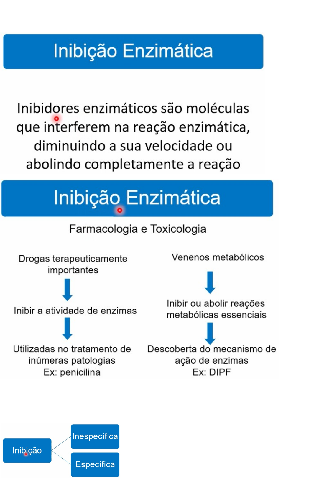 INIBIÇÃO ENZIMÁTICA Ferramenta util na farmacologia e na Toxicologia. Na farmacologia, drogas terapeuticamente importantes inibem a atividade de enzimas e serão utilizadas no tratamento de inúmeras doenças, ex Penicilina (antibiótico). No caso da toxicologia, venenos metabólicos podem inibir ou abolir reações metabólicas importantes e isso ajuda a desvendar o mecanismo de ação de enzimas, ex: DIPF (inseticida organofosforado/anticolinesterásico). As enzimas quando expostas a pHs extremos ou a temperaturas elevadas desnaturam e isso ocorre devido a sua natureza proteica, independentemente do tipo de reação que elas irão catalisar. Provoca uma modificação química do sítio ativo da enzima, alterando a sua estrutura ou destruindo o grupo funcional da enzima. A aspirina é um antinflamatório não esteróide. A ciclo-oxigenase (COX) é uma enzima que irá transformar um acido graxo de membrana (acido araquidônico) em mediadores locais (prostaglandinas) mediador responsável pela indução de vários processos fisiológicos como a inflamação, sensação de dor... Então com o bloqueio da COX pela aspirina, a aspirina funciona como um antinflamatório e um analgésico. A penicilina, por meio do anel Beta-lactâmico, consegue unir-se à Serina do sítio ativo da transpeptidase, impedindo que o substrato se ligue à esse sítio ativo, já que ela forma uma ligação covalente irreversível com a enzima Transpeptidase. Bactérias resistentes à penicilina produzem uma enzima chamada Beta-lactamase que liga-se à penicilina, modificando o anel beta-lactamico justamente no carbono que interage no sítio ativo da transpeptidase, transformando esse carbono numa carboxila e inativando a penicilina que não vai mais conseguir bloquear a transpeptidase. Por isso, Hoje em dia, combina-se com a amoxicilina com acido clavulanico que possui também um anel beta-lactâmico e consegue interagir com a Beta-lactamase, e ao ligar-se à enzima, ela o modifica, transformando-se então em seu inibidor. O acido clavulânico vai ficar ligado permanentemente à beta-lactamase, impedindo que a betalactamase inative a amoxicilina, possibilitando que ela continue atuando sobre a transpeptidase. Na inibição especifica reversível, o inibidor forma com a enzima um complexo instável já que se estabelece uma reação reversível entre a enzima e o inibidor. O inibidor competitivo possui estrutura semelhante à do substrato, ligando-se ao sítio ativo da enzima e formando o complexo EI (Enzima-Inibidor) que é semelhante ao ES, mas que jamais vai formar produto. Na presença do inibidor competitivo, há uma redução da afinidade da enzima pelo substrato, pois o inibidor compete com o substrato pela ligação no sítio ativo da enzima. Para reverter essa situação é preciso diminuir a concentração de inibidor ou aumentar a concentração de substrato, assim a enzima consegue funcionar normalmente. Como há uma alteração na afinidade da enzima pelo substrato na presença do inibidor (redução de afinidade) diz-se que há um aumento do Km aparente da enzima ( Km da enzima na presença do inibidor. O metanol é metabolizado no nosso organismo pela enzima Alcool desidrogenase hepática até formaldeído, esse formaldeído é tóxico, sendo prejudicial a muitos tecidos podendo causar cegueira. A intoxicação por metanol é revertida pela infusão lenta intravenosa de etanol que é um substrato da alcooldesidrogenase e nesse caso vai funcionar como um inibidor competitivo dessa enzima, evitando que o metanol encaixe-se ao sítio ativo da enzima sendo metabolizado em formaldeído, e seja liberado na urina. As estatinas são moléculas formadas a partir de culturas de fungos e elas foram descobertas para o tratamento da hipercolesterolemia por inibirem a HMG-COA Redutase (enzima que catalisa a transformação do intermediário da formação do colesterol HMG-CoA em outro intermediário chamado Mevalonato) este passo é o passo limitante de todo o processo de formação de colesterol endógeno. As estatinas possuem uma estrutura semelhante à do mevalonato, funcionando como um inibidor competitivo da HMG-CoA Redutase, reduzindo assima produção de Colesterol no nosso organismo e ajudando no controle da hipercolesterolemia. Um inibidor não competitivo não se liga ao sítio ativo da enzima, ele se liga em um local diferente do sítio ativo que não é o sítio alostérico. Ele pode liga-se tanto à enzima livre formando um complexo enzima-inibidor (inativo), quanto ao complexo ES, formando um complexo ternário Enzima-Substrato-Inibidor que também é inativo. Então em qualquer uma das ligações não há formação de produto. Na presença do inibidor não competitivo, a reação ocorre como se houvesse uma diminuição da concentração da enzima ativa. E como a velocidade de uma reação é proporcional à [enzima ativa], a velocidade máxima da reação é reduzida na presença do inibidor. Esse inibidor Não competitivo irá reduzir a Vmax aparente (velocidade máxima na presença do inibidor). Como o substrato e o inibidor não competitivo não competem pelo sítio ativo da enzima, não adianta aumentar a [substrato] que isso não vai anular ou atenuar o efeito do inibidor. Pra reverter a inibição não competitiva tem que REDUZIR A CONCENTRAÇÃO DO INIBIDOR. Numero de renovação: número de moléculas de substrato transformados em produto por molécula de enzima por unidade de tempo. O inibidor competitivo é aquele que possui uma estrutura molecular parecida com o substrato da enzima, portanto ele compete com o substrato pela ligação no sítio ativo da enzima. Ele liga-se ao sítio ativo da enzima impedindo a ligação do substrato. Como ele compete com o substrato pela ligação no sítio ativo da enzima, ele vai interferir/modificar o Km da enzima pelo substrato. Então há um aumento do Km aparente da enzima, uma diminuição da afinidade da enzima pelo substrato na presença do ini