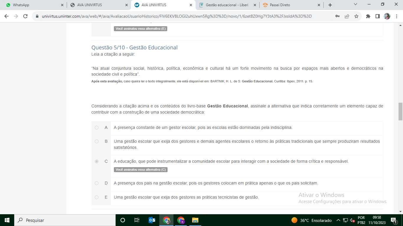 Leia a citação a seguir: "Na atual conjuntura política, econômica e cultural há um forte movimento na busca por espaços mais abertos e democráticos na sociedade civil e política" Após esta avaliação, caso queira ler texto integralmente, ele está disponível em: H. L. de Gestão Curitiba: 2011. p. 15. Considerando a citação acima e os conteúdos do livro-base Gestão Educacional. Assinale a alternativa que indica corretamente um elemento capaz de contribuir com a construção de uma sociedade democrática: A A presença constante de um gestor escolar, pois as escolas estão dominadas pela indisciplina. B Uma gestão escolar que exija dos gestores e demais agentes escolares retorno às práticas tradicionais que sempre produziram resultados. C A educação, que pode instrumentalizar a comunidade escolar para interagir com a sociedade de forma crítica. D A presença dos pais na gestão escolar, pois os gestores colocam em prática apenas que os pais solicitam. E Uma gestão escolar que exija dos gestores as práticas tecnicistas de gestão.