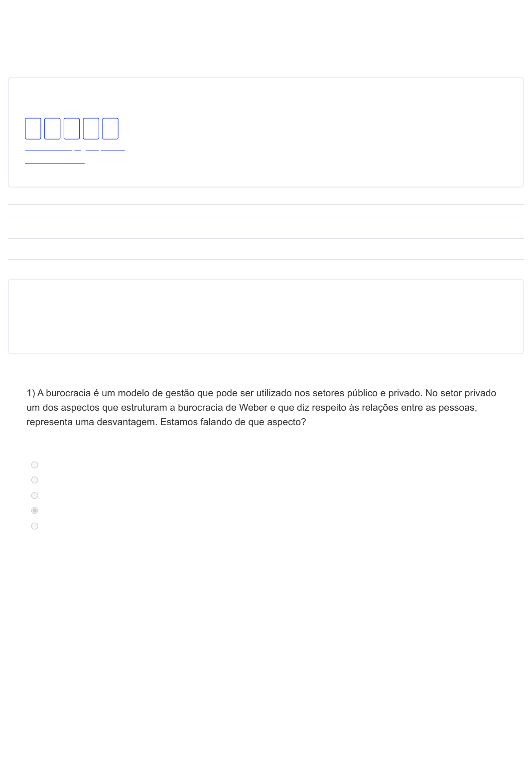 03/10/2023, 20:03 Exercício de Fixação : Burocracia: Revisão da tentativa https://www.certificacaotecnica.com.br/mod/quiz/review.php?attempt=4988113&cmid=54556 1/3 Iniciado em terça-feira, 3 out. 2023, 19:59 Estado Finalizada Concluída em terça-feira, 3 out. 2023, 20:03 Tempo empregado 4 minutos 22 segundos Avaliar 10,0 de um máximo de 10,0(100%) QUESTÃO Correto Atingiu 2,0 de 2,0 Navegação do questionário Mostrar uma página por vez Terminar revisão 1 2 3 4 5 1 1) A burocracia é um modelo de gestão que pode ser utilizado nos setores público e privado. No setor privado um dos aspectos que estruturam a burocracia de Weber e que diz respeito às relações entre as pessoas, representa uma desvantagem. Estamos falando de que aspecto? Escolha uma opção: a. Hierarquia. b. Divisão do trabalho. c. Especialização. d. Impessoalidade. e. Padronização. Sua resposta está correta. A resposta correta é: Impessoalidade. Burocracia https://www.certificacaotecnica.com.br/mod/quiz/review.php?attempt=4988113&cmid=54556&showall=0 https://www.certificacaotecnica.com.br/mod/quiz/view.php?id=54556 03/10/2023, 20:03 Exercício de Fixação : Burocracia: Revisão da tentativa https://www.certificacaotecnica.com.br/mod/quiz/review.php?attempt=4988113&cmid=54556 2/3 QUESTÃO Correto Atingiu 2,0 de 2,0 QUESTÃO Correto Atingiu 2,0 de 2,0 2 2) Max Weber estruturou um tipo ideal de burocracia que pudesse ser utilizado pela sociedade em geral. No entanto alguns aspectos hoje não funcionam no contexto das empresas privadas e organizações públicas que precisa se adaptar às constantes mudanças que ocorrem no ambiente externo. É correto afirmar que a burocracia em sua forma mais rígida no ambiente atual das organizações pode causar: Escolha uma opção: a. Eficiência. b. Maior flexibilidade nas ações. c. Estímulo à criatividade. d. Ineficiência. e. Iniciativa e inovação. Sua resposta está correta. A resposta correta é: Ineficiência. 3 3) A burocracia estruturada por Weber enfatiza aspectos como, divisão do trabalho, hierarquia, impessoalidade, profissionalização e competências técnicas dos funcionários. A característica da burocracia que não considera as pessoas como pessoas, mas como ocupantes de cargos e funções, diz respeito a qual dos aspectos apresentados acima? Escolha uma opção: a. Profissionalização. b. Divisão do trabalho. c. Hierarquia de autoridade. d. Impessoalidade. e. Competências técnicas dos funcionários. Sua resposta está correta. A resposta correta é: Impessoalidade. 03/10/2023, 20:03 Exercício de Fixação : Burocracia: Revisão da tentativa https://www.certificacaotecnica.com.br/mod/quiz/review.php?attempt=4988113&cmid=54556 3/3 QUESTÃO Correto Atingiu 2,0 de 2,0 QUESTÃO Correto Atingiu 2,0 de 2,0 4 4) Weber vê a burocracia como uma organização capaz de alcançar a máxima eficiência. A forma de definir antecipadamente como a organização deve funcionar, estabelecendo normas e regulamentos diz respeito a qual característica da burocracia? Escolha uma opção: a. Especialização da administração, separada da propriedade. b. Completa previsibilidade do funcionamento. c. Caráter formal das comunicações. d. Caráter legal das normas e regulamentos. e. Rotina e procedimentos padronizados. Sua resposta está correta. A resposta correta é: Caráter legal das normas e regulamentos. 5 5) As rápidas mudanças que vêm ocorrendo nos cenários politico, econômico e social, exigem das organizações públicas maior flexibilidade e rapidez de resposta e adaptação ao ambiente externo. Isso comprova a existência de imprevisibilidades, chamadas por Merton (1947) de disfunções da burocracia, que podem dificultar o alcance da eficiência. O apego excessivo do funcionário às normas e regulamentos e a adoção de posturas inflexíveis na execução de suas atividades se refere a qual disfunção da burocracia? Escolha uma opção: a. Internalização das regras e apego aos regulamentos. b. Resistência às mudanças. c. Despersonalização do relacionamento. d. Exibição de sinais de autoridade. e. Excesso de formalismo e de papelório. Sua resposta está correta. A resposta correta é: Internalização das regras e apego aos regulamentos.