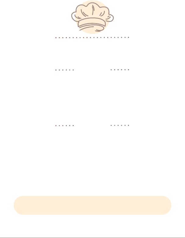 DE NADA Te M P e R O se não fosse COZINHEIRO seria um um bom minhas receitas meus dados Endereço: Cidade: Estado: Telefone: Celular: E-mail: inhas receita 1 2 3 4 5 6 7 8 9 10 11 12 13 14 15 16 17 18 19 20 21 22 23 24 25 26 27 28 Bolo de chocolate Low Carb inhas receita 29 30 31 32 33 34 35 36 37 38 39 40 41 42 43 44 45 46 47 48 49 50 51 52 53 54 55 56 inhas receita 57 58 59 60 61 62 63 64 65 66 67 68 69 70 71 72 73 74 75 76 77 78 79 80 81 82 83 84 inhas receita 85 86 87 88 89 90 91 92 93 94 95 96 97 98 99 100 um bom Preparo Acerte a quantidade Lista com as principais medidas usadas para uma boa organização em tempos de festas ou comemorações: Itens Carnes 1 opção 250 gramas 2 ou 3 tipos 100 gramas Legumes 1 opção 110 gramas 2 ou 3 tipos 50 gramas Macarrão prato principal 110 gramas acompanhamento 50 gramas 2 ou 3 tipos 25 gramas Grãos 1 opção 40 gramas 2 ou 3 tipos 25 gramas Por pessoa Itens Bebidas Água 300 ml Suco e 600 ml Refrigerante Docinhos com sobremesa 3 unidades sem sobremesa 5 a 6 unidades Salgadinhos prato principal 15 a 18 unidades 2 ou 3 tipos 6 a 8 unidades Bolo com acompanhamento 60 a 70g sem acompanhamento 100 a 120g Por pessoa Dicas valiosas . Leia atentamente a receita antes de começar a fazê-la. . Peneire ingredientes secos como farinhas, açúcar e outros, antes de serem medidos. Coloque-os cuidadosamente no recipiente de medidas, sem serem comprimidos ou sacudidos. . Coloque o recipiente para medir ingredientes líquidos sobre umas superfície reta e verifique o nível na altura da vista. Retire da geladeira com antecedência as gorduras sólidas como manteiga, margarina, banhas e outras, para que sejam medidas na temperatura ambiente. Coloque no recipiente de medida, apertando para que não fiquem buracos vazios ou bolhas de ar. . Coloque todos os ingredientes a serem utilizados, já medidos corretamente, no local que vai´prepará-los. . Escolha a panela ou a forma com tamanho correto para que não derrame o alimento e nem prejudique a sua consistência. . Se a receita pedir forno pré-aquecido é por que precisa estar quente, sendo assim é importante que acenda o forno de 10 a 15 minutos antes. Dicas valiosas . 50% Verduras - Metade do prato deve ser dedicado a legumes e verduras. . 25% Cereais e massas - Um quarto do prato deve ser dedicado ao arroz, massas e pães. .12,5% Carnes - Cerca de 1/8 do prato pode ser dedicado ao consumo de alimentos de origem animal. Para veganos e vegetarianos, podem substituir essa metade por frutas e oleagenosas. . 12,5% Grãos - Cerca de 1/8 do prato deve ser dedicado ao feijão, grão de bico, soja, lentilha ou qualquer grão de sua preferência. Temperaturas corretas: 250ºC 240ºC 220ºC 200ºC 190ºC 180ºC 160ºC 150ºC 140ºC 120ºC - - - - - - - - muito alta alta moderada baixa muito baixa Quanto pesa uma xícara de chá? Açúcar ------------------------------ Amido de milho --------------------- Arroz cru --------------------------- Amêndoas, nozes e castanhas ----- Aveia -------------------------------- Banha ------------------------------- Chocolate em pó -------------------- Coco seco ralado ------------------- Farinha de rosca ------------------- Farinha de trigo ------------------- Fubá --------------------------------- Manteiga ---------------------------- Mel ---------------------------------- Polvilho ------------------------------ Queijo ralado ----------------------- 160g 150g 210g 140g 80g 230g 90g 80g 150g 80g 120g 120g 230g 150g 80g E q u iv a lê n c ia d e p e s o s e m e d id a s : M e d id a s 1 c o lh er ( ch á ) 1 c o lh er ( s o p á ) 1 /4 x íc a r a ( ch á ) 1 /3 x íc a r a ( ch á ) 1 /2 x íc a r a ( ch á ) 1 x íc a r a M a n te ig a a ç ú c a r F a ri n h a d e t ri g o 5 m l 1 5 m l 6 0 m l 8 0 m l 1 2 0 m l 2 4 0 m l 6 g 2 0 g 5 0 g 6 5 g 1 0 0 g 2 0 0 g 4 g 1 2 g 4 5 g 6 0 g 9 0 g 1 8 0 g 3 g 1 0 g 3 0 g 4 0 g 6 0 g 1 2 0 g c h o c o la te L iq u id o s 2 g 6 g 2 0 g 3 0 g 4 5 g 9 0 g em p ó Receita: Tempo de preparo: Grau de dificuldade fácil médio Selo de aprovação: Ingredientes: difícil Rendimentos: Vegetariano Vegano Zero Glúten Low Carb _____________ _____________ _____________ Dicas para o preparo: nºBolo de chocolate Low Carb 3/4 de xícara de farinha de amêndoas 2 colheres de sopa de coco ralado fino 5 colheres de sopa de creme de leite 4 colheres de sopa de chocolate em pó 70% 2 colheres de sopa de farinha de coco 1 colher de sopa de fermento químico em pó Massa Cobertura 3 ovos 60 gr de chocolate 70% derretido Essência de baunilha a gosto Adoçante da sua preferência 5 colheres de sopa de creme de leite x 25 min 8 fatias 1 x modo de preparo: Em uma forma untada com manteiga, despeje a massa. Asse em forno médio a 200º por 25 minutos. Acrescente o chocolate picado quando o creme estiver quente e misture bem. Em uma tigela, misture os secos: a farinha de amêndoas, o chocolate em pó, o coco ralado e a farinha de coco. Preaqueça o forno a 180º. Acrescente os ovos e o creme de leite, e misture bem. Misture o adoçante e o fermento em pó, adicionando a essência de baunilha. Como fazer bolo de chocolate low carb Faça a ganache low carb esquentando o creme de leite em fogo baixo, sem deixe ferver. Com o bolo morno, acrescente a calda e bom apetite! Receita: Ingredientes: Dicas para o preparo: nº Tempo de preparo: Grau de dificuldade fácil médio Selo de aprovação: difícil Rendimentos: Vegetariano Vegano Zero Glúten Low Carb _____________ _____________ _____________ modo de preparo: Página 1 Página 2 Página 3 Página 4 Página 5 Página 6 Página 7 Página 8 Página 9 Página 10 Página 11 Página 12 Página 13 Página 14