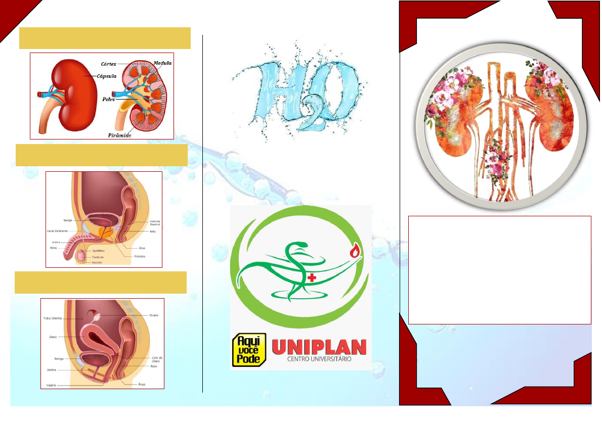 Sistema Urinário (A importância da água no corpo humano). ESTRUTURA DO RIM SISTEMA URINÁRIO MASCULINO SISTEMA URINÁRIO FEMININO Órgãos Função Rim Órgão responsável pela produção da urina. Ureter Órgão que garante que a urina seja conduzida até a bexiga. Bexiga Órgão responsável pelo armazenamento da urina até sua eliminação. Uretra "Órgão que garante a eliminação da urina para fora do corpo. INTRODUÇÃO O aparelho urinário é formado pelos dois rins, dois ureteres, a bexiga e a uretra. A urina é produzida nos rins, passa pelos ureteres até a bexiga e é lançada ao exterior pela uretra. Esse aparelho contribui para a manutenção da homeostase, produzindo a urina. Além da função reguladora da composição do meio interno, os rins também são responsáveis pela produção de alguns hormônios, como a renina, que participa da regulação da pressão sanguínea, e a eritropoietina, que estimula a produção de eritrócitos. Os rins junto com outros órgãos como a pele e o fígado, participam da ativação da vitamina D3. OBJETIVO GERAL Garantir a população brasileira o conhecimento do sistema urinário e a importância da agua para o corpo humano ,Ela ajuda a hidratar, transportar nutrientes até as células e auxilia na eliminação de toxinas do corpo através do suor e da urina. RESUMO RESUMO O Sistema Urinário ou Aparelho Urinário é responsável pela produção e eliminação da urina, possui a função de filtrar as "impurezas" do sangue que circula no organismo. O Sistema Urinário é composto por dois rins e pelas vias urinárias, formada por dois ureteres, a bexiga urinária e a uretra. ÓRGÃOS DO SISTEMA URINÁRIO E SUAS FUNÇÕES ETAPAS FORMAÇÃO DA URINA IMAGENS SISTEMA URINÁRIO