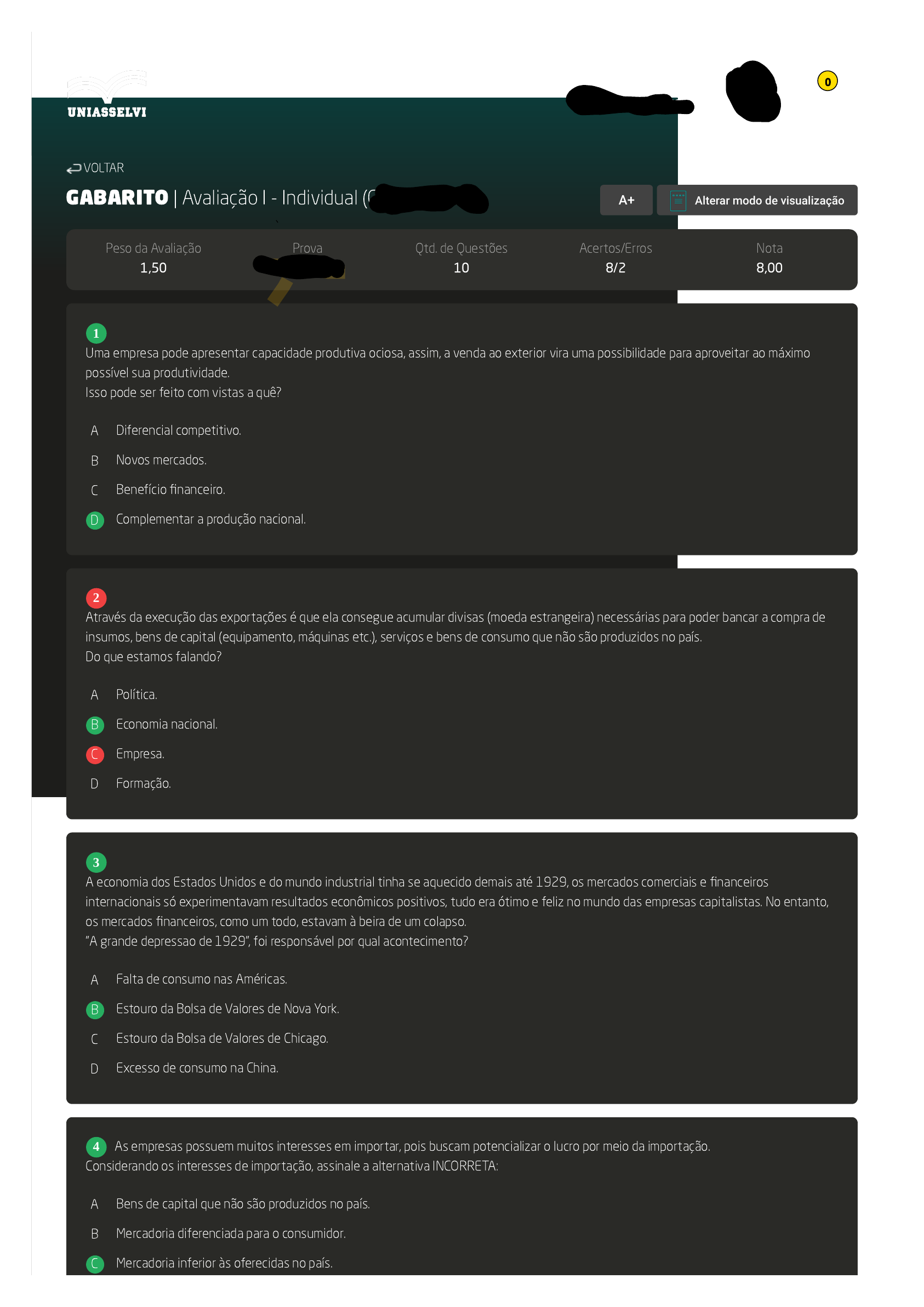 11/10/2023 15:56 AVA https://ava2.uniasselvi.com.br/subject/grades-and-tests/answer-book/eyJ0ZXN0Ijp7InRlc3RDb2RlIjoiODg0MTg2IiwiZGVzY3JpcHRpb24iOiJBdmFsaWHDp8OjbyBJIC0gSW5kaXZpZHVhbCIsInBhcmFtZXRlciI6MTI5M… 1/3 GABARITO | Avaliação I - Individual (Cod.:884186) Peso da Avaliação 1,50 Prova 69783728 Qtd. de Questões 10 Acertos/Erros 8/2 Nota 8,00 Uma empresa pode apresentar capacidade produtiva ociosa, assim, a venda ao exterior vira uma possibilidade para aproveitar ao máximo possível sua produtividade. Isso pode ser feito com vistas a quê? A Diferencial competitivo. B Novos mercados. C Benefício financeiro. D Complementar a produção nacional. Através da execução das exportações é que ela consegue acumular divisas (moeda estrangeira) necessárias para poder bancar a compra de insumos, bens de capital (equipamento, máquinas etc.), serviços e bens de consumo que não são produzidos no país. Do que estamos falando? A Política. B Economia nacional. C Empresa. D Formação. A economia dos Estados Unidos e do mundo industrial tinha se aquecido demais até 1929, os mercados comerciais e financeiros internacionais só experimentavam resultados econômicos positivos, tudo era ótimo e feliz no mundo das empresas capitalistas. No entanto, os mercados financeiros, como um todo, estavam à beira de um colapso. "A grande depressao de 1929", foi responsável por qual acontecimento? A Falta de consumo nas Américas. B Estouro da Bolsa de Valores de Nova York. C Estouro da Bolsa de Valores de Chicago. D Excesso de consumo na China. As empresas possuem muitos interesses em importar, pois buscam potencializar o lucro por meio da importação. Considerando os interesses de importação, assinale a alternativa INCORRETA: A Bens de capital que não são produzidos no país. B Mercadoria diferenciada para o consumidor. C Mercadoria inferior às oferecidas no país. VOLTAR A+ Alterar modo de visualização 1 2 3 4 Vitória Guimarães Administração (3606162) 0 11/10/2023 15:56 AVA https://ava2.uniasselvi.com.br/subject/grades-and-tests/answer-book/eyJ0ZXN0Ijp7InRlc3RDb2RlIjoiODg0MTg2IiwiZGVzY3JpcHRpb24iOiJBdmFsaWHDp8OjbyBJIC0gSW5kaXZpZHVhbCIsInBhcmFtZXRlciI6MTI5M… 2/3 D Matéria-prima e insumos que não estão disponíveis no mercado nacional,. É a atividade que proporciona a abertura do país para o mundo. É uma forma de se confrontar com os demais parceiros e, principalmente, frequentar a melhor escola de administração, já que, lidando com diferentes países, assimila técnicas e conceitos a que não teria acesso em seu mercado interno. De que conceito estamos falando? A Importação. B Balança comercial. C Câmbio. D Exportação. Os blocos econômicos foram criados com a finalidade de desenvolver o comércio de determinada região. Com isso, criam maior poder de compra nos países componentes, elevando o nível do seu povo. Como o mercado passa a ser disputado também por empresas de outros países-membros do bloco econômico, cresce a concorrência, o que gera a melhoria da qualidade e a redução de custos. Nesse panorama, cita- se três fases de desenvolvimento para ingresso nos blocos econômicos. Acerca dessas fases e suas peculiaridades, analise as sentenças a seguir: I- A fase do mercado comum busca eliminar totalmente alíquotas de importação de todas as mercadorias a serem importadas entre os países que fazem parte do bloco. II- A União Aduaneira vem a ser a segunda etapa do processo de integração comercial e econômica entre países. III- A primeira etapa é a formação de uma zona de livre comércio entre os países membros. Em um acordo de livre comércio, os países iniciam a redução de impostos de importação das mercadorias comercializadas entre eles. IV- O mercado comum é, de fato, um grande passo após a União Aduaneira, pois permite sem restrições a livre circulação comercial, financeira e de pessoas entre os países. Assinale a alternativa CORRETA: A As sentenças I, II e IV estão corretas. B As sentenças I e IV estão corretas. C As sentenças I, III e IV estão corretas. D As sentenças II, III e IV estão corretas. Aborda todas as operações comerciais realizadas entre os diversos que fazem parte da comunidade comercial internacional. Do que estamos falando? A Comércio internacional. B Comércio local. C Globalização. D Comércio exterior. Tanto os países desenvolvidos como aqueles com menor grau de desenvolvimento exportam diversos tipos de produtos e serviços, exportações que dependerão do grau de competitividade (produtividade) relativa dos produtos a serem exportados. Nesse sentido, os países podem exportar diversos produtos. Assinale a alternativa CORRETA que apresenta bens de capital: A Veículos, computadores, entre outros. B Equipamento e maquinaria, tais como fornos industriais, tratores, equipamento pesado utilizado nos processos produtivos, entre outros. 5 6 7 8 Vitória Guimarães Administração (3606162) 0 11/10/2023 15:56 AVA https://ava2.uniasselvi.com.br/subject/grades-and-tests/answer-book/eyJ0ZXN0Ijp7InRlc3RDb2RlIjoiODg0MTg2IiwiZGVzY3JpcHRpb24iOiJBdmFsaWHDp8OjbyBJIC0gSW5kaXZpZHVhbCIsInBhcmFtZXRlciI6MTI5M… 3/3 C Óleo de soja, farinha de mandioca, leite em pó, entre outros. D Petróleo, minério de ferro e grão de soja. Consolidou o intenso comércio regional no hemisfério norte do Continente Americano, beneficiando grandemente a economia mexicana, e aparece como resposta à formação da Comunidade Europeia, ajudando a enfrentar a concorrência representada pela economia japonesa. Do que estamos falando? A Zona de Livre-comércio da África Austral. B Zona de Livre-comércio da Norte América (Nafta). C Zona de Livre-comércio do Pacífico. D União Aduaneira. Nos primeiros anos - e décadas - do século XX começou a produção em massa da indústria automobilística. Com o lançamento do “Modelo T” da Ford, Henry Ford iniciou a massificação na produção e comercialização de automóveis. Ne