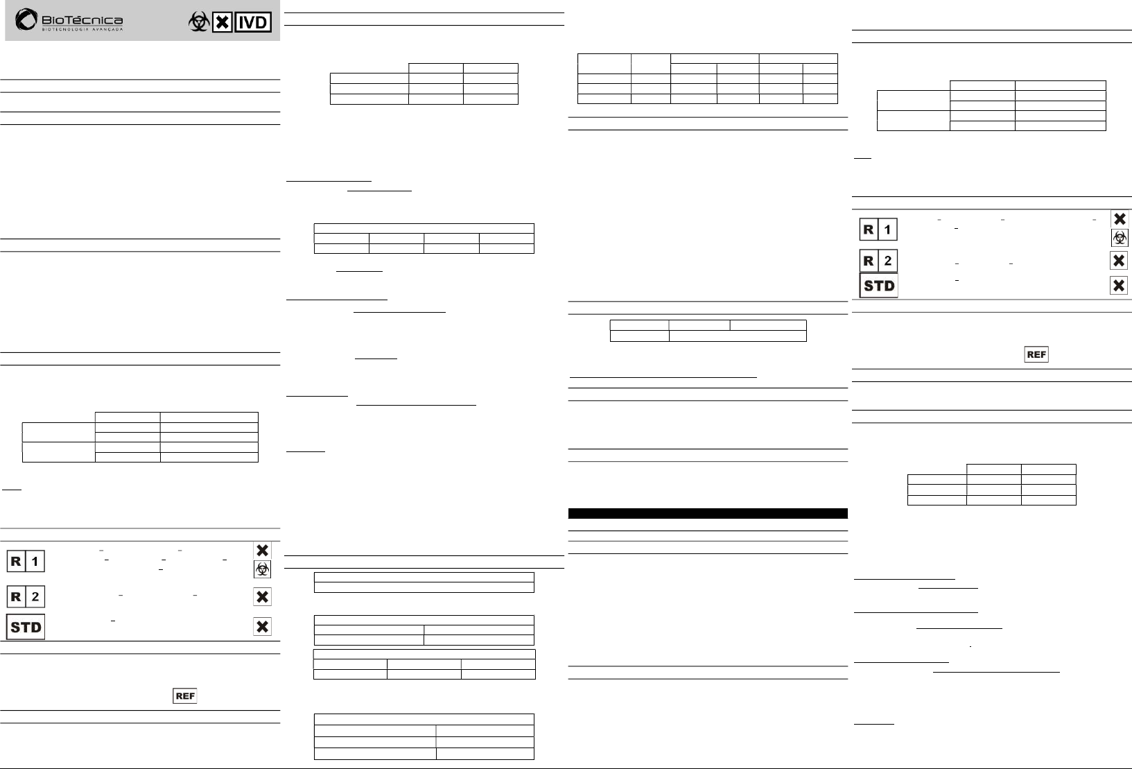 BIOTÉCNICA IND.COM. LTDA - CNPJ: 025340690001/20. Avenida Washington Ribeiro, 200 - Industrial Miguel de Luca CEP 37072-030 Varginha-MG BRASIL Tel/fax: +55 35 3214 4646 www.biotecnica.ind.br Revisão/Revision/Revisión: 02 – 02/07/2021 Ureia UV Urea UV / Urea UV Ref. 10.012.00 Responsável Técnico: Dr. Gilson Sério Pizzo CRF MG – 5310 MS 80027310263 FINALIDADE Kit destinado à determinação de ureia em amostras de soro, plasma e urina. Uso em diagnóstico in vitro. CONDIÇÕES DE ARMAZENAMENTO, MANUSEIO E PREPARO DO PRODUTO Conservar de 2 a 8 °C, permanecendo fora da temperatura especificada somente o tempo necessário para a realização dos testes. Manter ao abrigo da luz. Após aberto, o produto em uso é estável até a validade impressa no rótulo, desde que seguidas as condições de armazenamento recomendadas (2 a 8 °C). Não usar reagentes cuja data de validade tenha expirado. Reagente de Trabalho (RT): misturar na proporção de 4 partes de R1 + 1 parte de R2. Homogeneizar suavemente. O reagente de trabalho é estável por 4 semanas, desde que seguidas as condições de preparo e armazenamento recomendadas (2 a 8 °C). A leitura de absorbância para o reagente inferior a 0,900, em espectrofotômetro zerado com água purificada em 340 nm, indica a sua deterioração. Os reagentes podem ser utilizados em modo birreagente, desde que seguidas as proporções estabelecidas. Consultar a Assessoria Científica Biotécnica. PRINCÍPIO DE FUNCIONAMENTO Método: Enzimático UV A ureia da amostra é hidrolisada pela enzima urease com produção de gás carbônico e íons amônio. Estes são captados por uma segunda enzima, a glutamato desidrogenase, que em presença dos substratos NADH e -cetoglutarato produz NAD+ e glutamato. A taxa de diminuição da concentração de NADH no meio pode ser espectrofotometricamente determinada em 340 nm, sendo proporcional à concentração de ureia na amostra. Uréia + H2O ⎯⎯⎯ 2 NH4+ + CO2 NH4+ + -cetoglutarato + NADH + H+ ⎯⎯⎯⎯⎯⎯⎯⎯⎯⎯⎯⎯⎯⎯⎯⎯⎯⎯⎯ Glutamato + NAD+ AMOSTRAS: TIPO, COLETA, MANUSEIO, PREPARO E PRESERVAÇÃO Tipo de Amostra: soro, plasma (EDTA e heparina) e urina. Coleta e Manuseio: realizar a coleta da amostra conforme as Boas Práticas de Laboratório Clínico. Todas as amostras devem ser tratadas como material biológico potencialmente infectante. Preservação: Temperatura Estabilidade da Amostra Soro e Plasma* 4 a 8 °C 7 dias -20 °C 1 ano Urina de 24 horas 4 a 8 °C 7 dias -20 °C 28 dias * Os anticoagulantes citrato, fluoreto e oxalato de sódio interferem na dosagem de ureia. Preparo: Urina: utilizar uma amostra coletada no período de 24 horas em frasco com 2 mL de HCl 50%. Centrifugar por 10 minutos a 3000 rpm e coletar o sobrenadante. Diluir uma alíquota do sobrenadante na proporção de 1:50 com água purificada e proceder ao ensaio. Multiplicar o resultado obtido por 50. Se o resultado obtido estiver acima do intervalo operacional, preparar uma nova solução alterando a proporção de diluição. DESCRIÇÃO DO PRODUTO Tampão TRIS > 100 mmol/L; EDTA > 1 mmol/L; ácido alfacetoglutárico > 2 mmol/L; ADPK > 1 mmol/L; urease > 5000 U/L; glutamato desidrogenase > 1000 U/L; ativadores; detergentes; estabilizantes; conservantes. Tampão carbonato > 2 mmol/L; NADH > 0,5 mmol/L; conservante. Tampão fosfato > 2 mmol/L; conservante; ureia em concentração equivalente a 70 mg/dL. Rastreável ao material de referência NIST 912a. CONTROLE DE QUALIDADE O uso de controles deve ser prática rotineira no laboratório. Para Calibração e Controle Interno de Qualidade Laboratorial, recomenda-se o uso do calibrador e dos controles abaixo: Autocal Controle Normal – Quantinorm Controle Patológico – Quantialt 13.002.00 13.003.00 13.004.00 MATERIAL NECESSÁRIO PARA REALIZAÇÃO DO ENSAIO Espectrofotômetro ou fotômetro para leitura em 340 nm. Banho de água termostatizado a 37 °C e tubos de ensaio. Pipetas de vidro e/ou automáticas, relógio ou cronômetro. PROCEDIMENTO DE ENSAIO, CÁLCULOS E INTERPRETAÇÃO A) PROCEDIMENTO DE ENSAIO 1. Pré-aquecer o reagente de trabalho durante 3 minutos a37 °C. 2. Zerar o equipamento de leitura com água purificada em 340 nm. 3. Pipetar em tubos de ensaio: STD Amostra STD 10 L - Amostra - 10 L Reagente de Trabalho 1,0 mL 1,0 mL 3. Homogeneizar e inserir nas porta-cubetas termostatizadas a 37 °C. Acionar o cronômetro. 4. Medir a absorbância em 340 nm aos 30 segundos (A1) e aos 120 segundos (A2), da amostra e do padrão. B) CÁLCULOS Cálculos para Soro / Plasma Ureia UV (mg/dL) = (A1 - A2) da Amostra x Concentração do STD (mg/dL) (A1 - A2) do STD Exemplo: Concentração do Padrão = 70 mg/dL Leituras de Absorbância Amostra A1 Amostra A2 STD A1 STD A2 1,348 1,243 1,350 1,160 Ureia (mg/dL) = (1,348 – 1,243) x 70 = 38,7 mg/dL (1,350 – 1,160) Utilizando o Fator de Calibração: Fator de Calibração = Concentração do STD (mg/dL) (A1 - A2) do STD Ureia (mg/dL) = (A1 - A2) da Amostra x Fator de Calibração Exemplo: Fator de Calibração = 70 = 368,4 1,350 - 1,160 Ureia (mg/dL) = (1,348 – 1,243) x 368,4 = 38,7 mg/dL Cálculos para Urina: Ureia (mg/24 horas) = Ureia (mg/dL)* x Volume Urinário (mL) 100 * O sobrenadante da urina deve ser diluído na proporção de 1:50. Multiplicar o resultado obtido por 50 para obter a concentração de ureia na urina (mg/dL). Automação: Este procedimento pode ser aplicado na maioria dos analisadores automatizados. Os protocolos estão disponíveis em www.biotecnica.ind.br. C) INTERPRETAÇÃO A ureia é o principal metabólito nitrogenado do catabolismo das proteínas. Mais de 90% da ureia é excretada através dos rins, de modo que a doença renal é associada ao acúmulo de ureia no sangue. A dosagem de ureia sanguínea e urinária pode fornecer informações clínicas úteis. Ela pode estar elevada em virtude de diferentes fatores, como dieta rica em proteína, catabolismo proteico elevado, reabsorção das