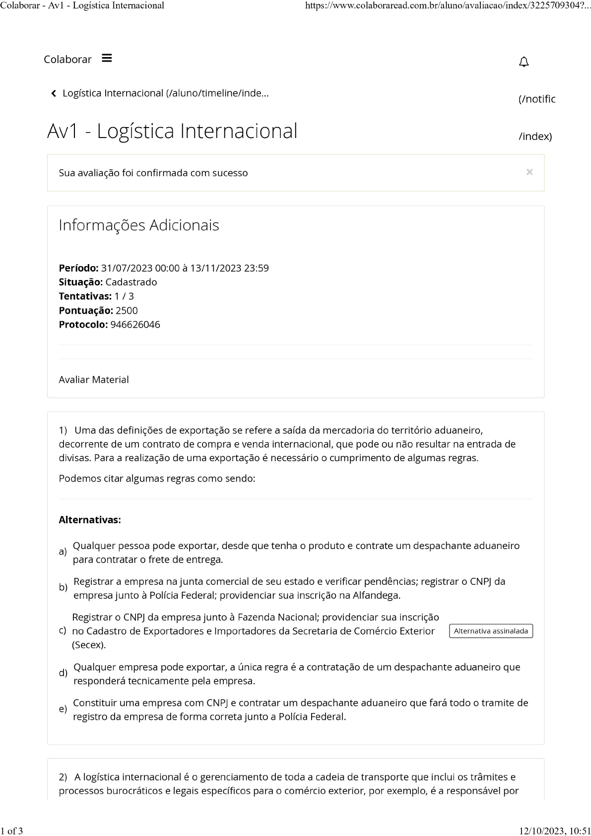 Colaborar - Av1 - Logística Internacional https://www.colaboraread.com.br/aluno/avaliacao/index/3225709304?... 2 of 3 12/10/2023, 10:51 Colaborar - Av1 - Logística Internacional https://www.colaboraread.com.br/aluno/avaliacao/index/3225709304?... 3 of 3 12/10/2023, 10:51