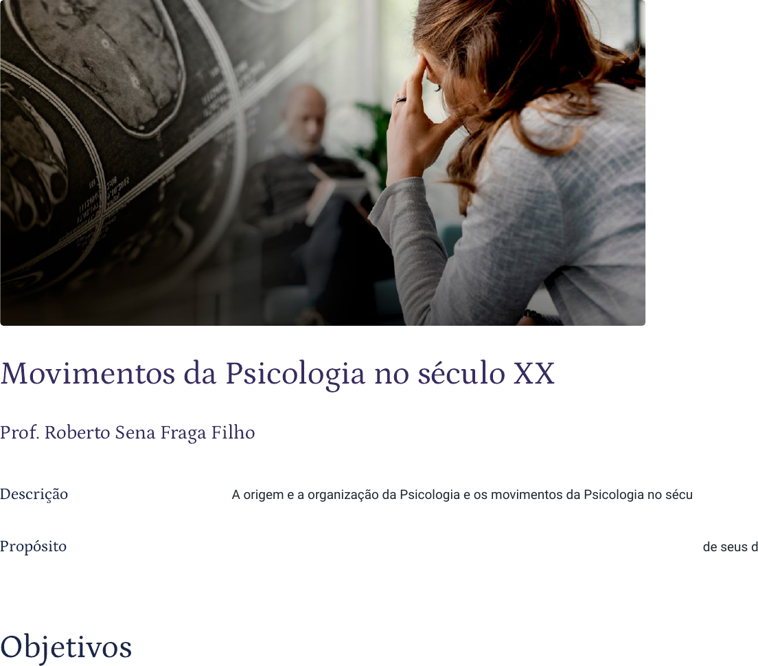 Movimentos da Psicologia no século XX Prof. Roberto Sena Fraga Filho Descrição A origem e a organização da Psicologia e os movimentos da Psicologia no século XX. Propósito Compreender que o conhecimento de facetas diversas do campo da Psicologia e de seus desenvolvimentos ao longo dos séculos XX e XXI instrumentalizam profissionais a multiplicar suas capacidades e abordagens. Objetivos Módulo 1 In�uências na história da Psicologia Descrever os movimentos históricos que contribuíram para a organização da Psicologia como ciência. Módulo 2 A Psicologia no século XX Identificar os movimentos da Psicologia do século XX. Módulo 3 A Psicologia Cognitiva Identificar o marco histórico, os conceitos fundamentais e os métodos da Psicologia Cognitiva. Módulo 4 Psicologia: do século XX para o século XXI Relacionar a Psicologia do século XX com a Psicologia do século XXI. Introdução Estudar a história de uma ciência, de uma área do conhecimento humano, permite-nos compreender o propósito, a utilidade desse conhecimento em nossas vidas, em nossa prática profissional e na forma como exercemos nossa profissão. A Psicologia como uma profissão é restrita ao psicólogo e à psicóloga, devidamente inscritos em um conselho regional de Psicologia. No entanto, a Psicologia como ciência embasa o trabalho de psicólogos, pedagogos, professores, gestores e de qualquer outro profissional que necessite compreender o ser humano para manejar comportamento e cognição dentro de sua prerrogativa profissional. Algumas práticas da Psicologia são, portanto, restritas aos seus profissionais, mas o uso do conhecimento, em interseção com outras profissões, após uma formação de nível superior para atuar na pedagogia, na docência, na gestão de pessoas, no desenvolvimento de soluções e produtos para as pessoas é possível e desejável. Essa é nossa proposta para você. Vamos nessa! 1 - In�uências na história da Psicologia Ao �nal deste módulo, você será capaz de descrever os movimentos históricos que contribuíram para a organização da Psicologia como ciência. Perspectiva e Zeitgeist Leonardo Boff afirma o seguinte: Todo ponto de vista é a vista de um ponto. Ler significa reler e compreender, interpretar. Cada um lê com os olhos que tem. E interpreta a partir de onde os pés pisam. Todo ponto de vista é um ponto. Para entender como alguém lê, é necessário saber como são seus olhos e qual é sua visão de mundo. Isso faz da leitura sempre uma releitura. A cabeça pensa a partir de onde os pés pisam. Para compreender, é essencial conhecer o lugar social de quem olha. Vale dizer: como alguém vive, com quem convive, que experiências tem, em que trabalha, que desejos alimenta, como assume os dramas da vida e da morte e que esperanças o animam. Isso faz da compreensão sempre uma interpretação. (BOFF, 1999, p. 4) Sem a pretensão de analisar a complexidade revelada nessas poucas linhas do texto de Leonardo Boff, uma palavra atende ao nosso propósito inicial: perspectiva. Em perspectiva, estudamos Psicologia, em perspectiva, usamos do conhecimento da Psicologia. Fundamentalmente, em perspectiva, buscamos compreender a complexidade dos fenômenos humanos, as pessoas e, também, os eventos históricos da Psicologia. Atenção! Não conseguimos estudar Psicologia desconsiderando o Zeitgeist. Uma ciência não se desenvolve no vácuo, ela usa a tecnologia disponível de sua época e tenta dar respostas às perguntas que são feitas. Essas perguntas (as indagações dos filósofos e dos cientistas) consideram o acúmulo de conhecimento até aquele ponto da história. Zeitgeist O espírito, as necessidades, o clima intelectual e cultural de uma época. A tecnologia está mais avançada no século XXI. Podemos dizer que, atualmente, os filósofos e os cientistas podem fazer perguntas mais complexas, pois detêm mais conhecimentos do que os filósofos e cientistas de meados do século XIX, quando surgiu a Psicologia Científica. Uma frase atribuída a Sir Isaac Newton (1643-1727), cientista do século XVII e cavaleiro da Coroa Real Inglesa, traduz bem essa ideia: Se enxerguei um pouco mais longe, foi por estar em pé sobre ombros de gigantes. (Isaac Newton) Não é recomendado julgar e/ou refutar um dado histórico se você estiver pensando com a cabeça do século XXI, a partir de suas ideias preconcebidas e do que você acha certo ou errado, ou seja, do seu sistema de crenças, de sua perspectiva, eventualmente, nutrida pelo senso comum, pelo conhecimento popular que não tenha sido testado e analisado pelo método da Filosofia ou da Ciência. Segundo Schultz (2019), é necessário um distanciamento: afastar-se momentaneamente do seu sistema de crenças e também do seu conhecimento do século XXI. Compreenda a perspectiva e o Zeitgeist do momento histórico que estiver estudando. Em ciência, não achamos, não deduzimos sem antes observar, experimentar, demonstrar evidências. Em ciência, não existe o óbvio. Tudo precisa ser investigado e evidenciado. Com essa postura, você absorverá melhor o conteúdo, compreenderá melhor a nossa história, e, assim, perceberá o propósito e a utilidade daquele conhecimento para não cometer os mesmos erros dos nossos antepassados, para prospectar o futuro, ou compreender como chegamos até o nosso momento histórico do século XXI. Em ciência, algumas vezes, para acertar é necessário errar. É a partir dos erros que alguns pesquisadores ficam inquietos, buscam evidências válidas e fidedignas para refutar o erro e alcançar evidências de maior qualidade. Os erros são tão relevantes quanto os acertos. Vamos analisar um exemplo prático do que tratamos até aqui! O que você diria se disséssemos que sua inteligência e suas características de personalidade podem ser medidas pelo tamanho de sua cabeça e do formato do seu crânio? Isso faria sentido? Digite sua resposta aqui Chave de resposta Pode parecer e