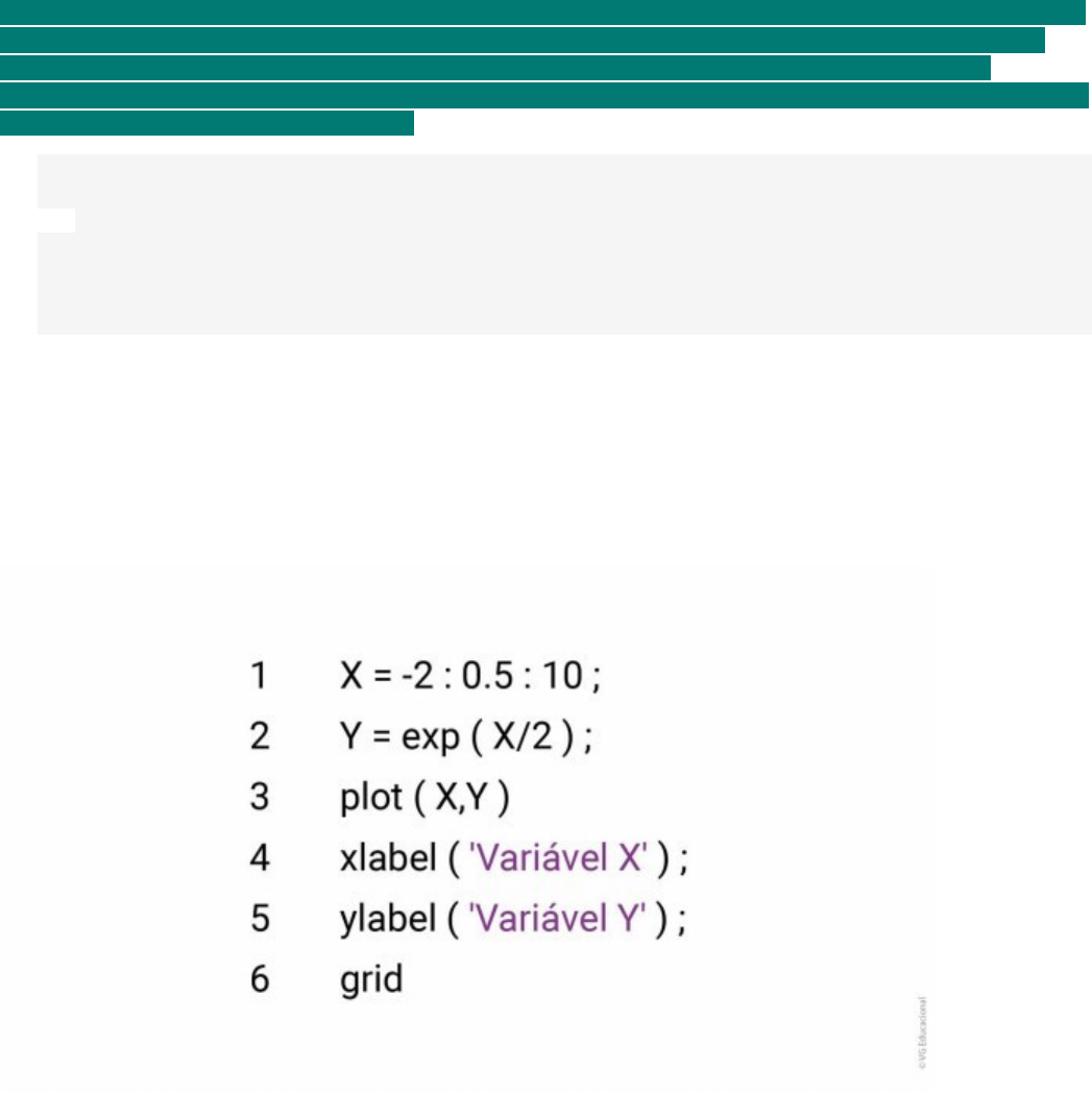 #PraCegoVer: a figura apresenta um código em MATLAB. Há seis linhas de código. Linha 1: X = -2:0,5:10; Linha 2: Y = exp(X/2); Linha 3: plot(X,Y); Linha 4: xlabel(‘Variável X’); Linha 5: ylabel(‘Variável Y’); LInha 6: grid.