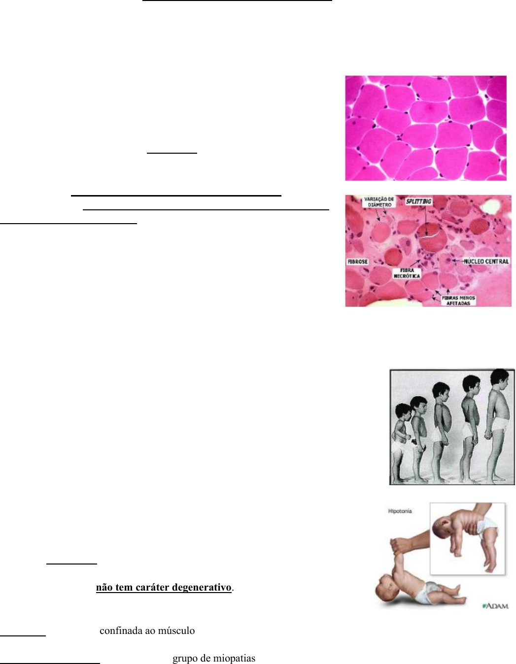 Clínica Neuro MIOPATIAS • Miopatia → Músculo (mudanças morfológicas e bioquímicas) → Não relacionadas ao SNC ou SNP. • Doença na qual o músculo sofre mudanças morfológicas e/ou bioquímicas, que não são secundárias a alterações do SNC e dos nervos periféricos • História o Queixa relacionada a motricidade • Exame Neurológico o Hipotonia o Hiporreflexia o Fraqueza muscular o Sensibilidade e coordenação normais → Músculo Miopático: • Proliferação de tecido conjuntivo gorduroso. • Fibras musculares normais, outras com volume aumentado ou diminuído. • Edema que precede a atrofia. • Fibras afetadas: contornos arredondados e necrose segmentar. • Fusos musculares: alterações degenerativas, atrofia, desaparecimento de fibras musculares intrafusais. → Doenças neuromusculares: • Miopatia congênita – nasce com a condição • Hereditárias – Instalação crônica o Distrofias musculares o Distrofias miotônicas • Adquiridas – instalação aguda o Miopatias inflamatórias (sistêmicas) → Quadro clínico: • Atrofia • Dificuldades nas AVD´s • Diminuição da ADM • Deformidades • Acometimento respiratório • Inabilidade Progressiva • Encurtamento muscular • Contraturas • Dificuldades em realizar transferências • Alterações posturais • Fraqueza muscular • Alterações na marcha • Dor • Diminuição do equilíbrio → Miopatia Congênita: • Condição hereditária rara • Manifesta no neonato • Sintomas de hipotonia, hiporreflexia e fraqueza muscular generalizada • Esse tipo de miopatia não tem caráter degenerativo. → Miopatia X Distrofia: • Miopatia: Patologia é confinada ao músculo sem nenhuma anormalidade no nervo periférico, neuropatia ou desordem neurogênica. • Distrofias musculares: constituem um grupo de miopatias caracterizado por serem: o Geneticamente determinadas o Progressivas o Degenerativas o Fraqueza o Musc. Voluntários o Sem outras anormalidades musculares • Distribuição simétrica da fraqueza e atrofia muscular, as sensações intactas e a conservação dos reflexos – maioria → Distrofias musculares ligadas ao X: • Mutações no gene da proteína distrofina em Xp21 = Distrofinopatias. • Distrofina = proteína do citoesqueleto ligada a membrana plasmática → Atua mantendo a integridade da fibra muscular → Degeneração da fibra muscular → Fraqueza muscular progressiva Distrofia Muscular de Duchenne (DMD): Distrofias musculares ligadas ao X • Ausência da distrofina. • Evolução progressiva e rápida. • Frequente na infância > Evidências da anomalia: 3 e 6 anos. • Perda da deambulação: 7 - 13 anos • Óbito: 20 e 30 anos. • 13 a 33 por 100.000 nascidos vivos/ano. • Predominante em homens. • Retardo Mental: 1/3. • Pseudo-hipertrofia: tecido muscular > tecido conjuntivo- gorduroso. • Fraqueza muscular acentuada • Pode levar a morte por insuficiência respiratórias. • Elevação da creatina quinase (CK). • Marcha anserina/ marcha de ganso: fraqueza bilateral do glúteo médio. • Postura lordótica e o abdome protuberante no bipedalismo > Fraqueza dos mm abdominais e Paravertebrais. • Alteração no equilíbrio e atividades gerais > Fraqueza dos extensores de quadril. • Apresentam hiperlordose, incapacidade de andar,aparentam ser menos ativos e suscetíveis à quedas, dificuldade para subir escadas. • Pés bem separados > aumentar a base de apoio; • Sinal de Gowers: Uso das mãos para "escalar" seu próprio corpo a partir de uma posição agachada devido à falta de força muscular no quadril e coxas. Distrofia muscular de Becker: Distrofias musculares ligadas ao X • Forma menos grave. • Distrofina alterada. • 2 a 6 por 100.000 - sexo masculino. • Reconhecida entre 5 e 12 anos. • Marcha: Anda satisfatoriamente até a vida adulta. • Funções psíquicas e condição cardíaca costumam ser normais. • Óbito: raro antes dos 21 anos, normalmente próx 40 anos Duchenne X Becker: • Gene anormal no cromossomo X e no seu produto do gene da distrofina. • Distrofina é ausente em pacientes com Duchenne • Distrofina em estrutura anormal no tipo de Becker. Becker: - Distrofina é anormal; - 5 a 11 anos; - Progressão lenta. Duchenne: - Distrofina ausente; - 3 a 6 anos; - Progressão rápida. • Fraqueza > m. iliopsoas, quadríceps e glúteos > pretibial (pé caindo e andando nas pontas) > músculos da cintura escapular e os mmss > serratil, peitorais, dorsais (menos comum) > cintura pélvica, a coluna lombossacra e os ombros enfraquecem. • Diferença entre DMD e Becker: início e progressão. Distrofia muscular de Emery-Dreifuss: Distrofias musculares ligadas ao X • O defeito em Xq28 e o defeito é dado pela proteína Emerina (regulação da expressão genética). • Progressão lenta com início na infância e parte final da adolescência. • Fraqueza: braço e ombro > cintura pélvica > mmii (distais) • Mm faciais podem ser afetados. • Estado mental intacto. • Cardiomiopatia grave: defeitos de condução sinoatrial e atrioventricular. • Evolução é benigna • Fraqueza e contraturas -cotovelo, mmss e tendão de Aquiles são severas > morte súbita. Distrofia muscular Facioscapulohumeral (FSH): • Lenta e muitas vezes assintomática. • Herança (geralmente) autossômico dominante, cromoss. 4q35. • 5: 100.000 nascidos vivos/ano. • A idade de início: entre 6 e 20 anos. • Primeiras manifestações: dificuldade em elevar os braços acima da cabeça e levantar as escápulas. • Fraqueza bifacial: mm orbicular dos olhos, zigomático e orbicular da bocal, masséteres, os músculos temporais, extra-oculares, são afetados. • Características: o Fraqueza Facial/MMII - tibiais e fibulares (marcha pato). o Fraqueza proximal para distal. o Escápula Alada: "asa de anjo" e as clavículas são proeminentes. o Atrofia dos m. Afetados o Trapézio e peitorais são afetados. Característica ocasion