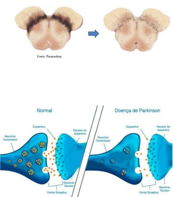 CLINICA NEURO DOENÇA DE PARKINSON HISTÓRICO E CONCEITO • Descrita em 1817, por James Parkinson; • Inicialmente foi chamada de “Paralisia agitante”, pois acreditava-se que era problema de medula. Mas depois descobriram sobre a perda de dopamina; • É uma doença degenerativa; • Perda de dopamina (1919). o A dopamina fica localizada na substância negra do mesencéfalo. • A doença de Parkinson é uma doença neurológica, crônica e lentamente progressiva, associada à perda de células cerebrais (neurônios) produtoras de um neurotransmissor chamado dopamina. • Doença de Parkinson x Parkinsonismo: o Doença de Parkinson: falta de dopamina. Faz aprte do grupo de doenças dentro do parkinsonismo. o Parkinsonismo: sintomas motores parecidos com Parkinson, que cessam ou diminuem posteriormente. • Neurônio pré-sináptico tem perda de dopamina, então a informação não é transmitida. INCIDÊNCIA E PREVALÊNCIA • 2ª doença mais comum do SNC; • Atinge 1 a 2% da população mundial acima dos 65 anos (OMS); • No Brasil existem cerca de 200 mil pessoas (MS); • Estima-se que 4% são diagnosticados antes do 50 anos; • Duas vezes mais frequente em homens do que as mulheres; • Prevalência da doença ↑ com a idade QUAIS AS CAUSAS • É idiopática; • 15% das pessoas com DP tem algum familiar de 1º ou 2º grau com a doença; • 5% de todas as pessoas com DP tem alguma alteração genética; • Hábitos de vida (fumar). CARACTERÍSTICAS • Não necessariamente vão apresentar todos; • Sintomas motores: o Tremor de repouso: pode aparecer na mão, braço, perna, pé, lábios, cabeça. Pode ser exacerbado por estresse, frio. o Rigidez: aumento do tônus. Roda denteada – movimento passivo, mas trava para fazer flexão. o Bradicinesia: lentificação do movimento. o Instabilidade postural: instabilidade constante, flexão de tronco, anteriorização de cabeça, alteração de equilíbrio, aumenta o risco de quedas. • Outras manifestações: o Hiposmia: é um dos primeiros que surge, antes mesmo que os motores. o Rosto pouco expressivo; o Micrografia; o Hipotensão postural: ao mudar posicionamento, a pressão arterial cai. o Redução da qualidade do sono. o Dor. o Constipação. o Déficits cognitivos. o Dificuldade de iniciar movimento. CIRCUITO MOTOR • Núcleos da base: conjunto de substância cinzenta na substância branca, com a função de modular movimentos; o Tálamo, putâmen, núcleo caudado (relacionados com o Parkinson). Via Direta: Facilita o movimento (a favor) • Núcleo estriado: putamen + núcleo caudado; • Glutamato: estimulante; • GABA: inibitório; • O tálamo estimula o córtex, o globo pálido inibe o tálamo. Quando o córtex é ativado, ele estimula o estriado para inibir o globo pálido medial e o tálamo fica livre para estimular o córtex. Via Indireta: inibe o movimento • Informação chega no córtex, que estimula o estriado, inibe o globo pálido lateral. Se ele não for inibido, ativa o subtálamo que estimula o pálido medial, responsável por inibir o tálamo. Ao inibir o tálamo, a informação não chega no córtex e não tem movimento. Via D1: Complemente a via direta (potencializa o movimento, entra dopamina) • Substancia negra, através da dopamina, estimula o núcleo estriado, que inibe o globo pálido medial, permite o tálamo de estimular o córtex e produzir movimento. Via D2: complementa a indireta (mas é a favor do movimento) • A substância negra estimula receptores inibitórios no estriado, que não inibe o pálido lateral e este fica livre para inibir o subtálamo, que não consegue ativar o globo medial e assim o tálamo fica livre para estimular o córtex e produzir o movimento. DIAGNÓSTICO • Não existe um teste/procedimento laboratorial específico pra diagnóstico; • Avaliação neurológica (pelo médico); • Apresentar três dos quatro sintomas principais; • Se os sintomas melhoram ou cessam após administração do medicamento; • Exames de imagem podem ser solicitados (Ultrassonografia transcraniana, PET). TRATAMENTO • Medicamentoso: Levodopa. o Atravessa a barreira hematoencefálica e é convertido em dopamina no cérebro. Aumenta a transmissão da informação e a responsividade. o A medicação restabelece a atividade da dopamina → redução dos sintomas, melhoria da qualidade de vida; o Corresponde ao aminoácido precursor da dopamina; o Convertida em dopamina no cérebro; o Recomendação de 1ª linha para os sintomas do DP. • Cirúrgico: Deep Brain Stimulation (DBS) o Para controle de sintomas quando não responde a medicamento; o Implanta um eletrodo no cérebro; o 1 – Eletrodo de estimulação; o 2 – Cabo de conexão; o 3 – Bateria. AVALIAÇÃO FUNCIONAL • MEEM – Mini exame do estado mental; • TSL – 30 seg. (teste de sentar e levantar); • Força muscular; • ADM; • TC6 minutos; • BERG – Equilíbrio; • TUG; • DGI – Equilíbrio e marcha dinâmica; • Exames próprios do Parkinson: o UPDRS, H&Y, FOG-Q, PDQ-39. Escala Unificada de Avaliação da Doença de Parkinson (UPDRS) • Umas das escalas mais extensas e completas; • 36 questões e vários domínios; • Sinais e sintomas através do autorrelato e observação clínica. H & Y – Classificação de Hoehn e Yahr (modificada) • Avalia o estágio da doença; • 0 – nenhum sinal; • 5 – confinado à cama. Versão Brasileira da Escala de Congelamento da Marcha (FOG-Q) PDQ-39 (Avalia qualidade de vida) Classificação Internacional de Funcionalidade (CIF) • Observa a interação social, atividades, participação, funcionalidade. FISIOTERAPIA • ↑ Flexibilidade; • ↑ Força muscular; • ↑ Equilíbrio; • ↑ Destreza manual; • Melhorar funcionalidade; • Manter independência/autonomia; • Prevenir incapacidades. • Vai depender muito do paciente; • Algumas condutas: o Tremor de repouso: luva estabilizadora de tremores; o Bradicinesia: circuito, atividades s