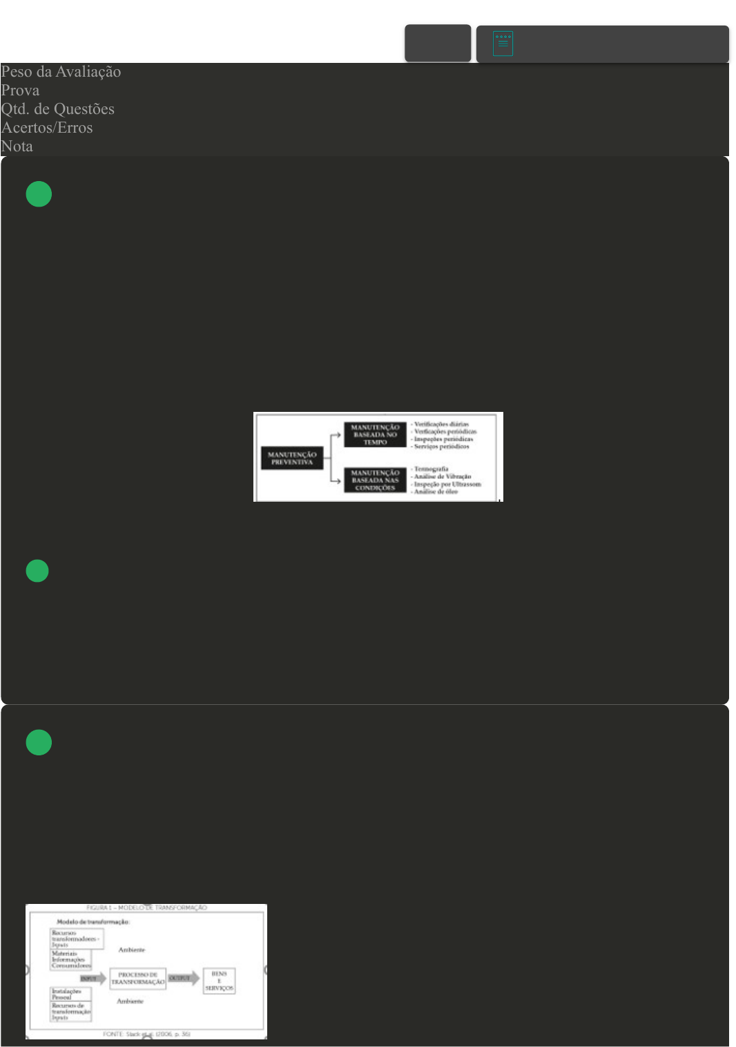 13/10/23, 15:12 Avaliação I - Individual about:blank 1/6 Prova Impressa GABARITO | Avaliação I - Individual (Cod.:885312) Peso da Avaliação 1,50 Prova 71982341 Qtd. de Questões 10 Acertos/Erros 9/1 Nota 9,00 Observe o infográfico relativo à manutenção preventiva e, em seguida, analise as sentenças a seguir: I- A manutenção preventiva se baseia em inspeções periódicas, e sua execução se dá quando observa- se sinais de deterioração aparente. II- A manutenção preventiva é baseada em probabilidades estatísticas que são muitas vezes explicadas pela "curva da banheira". III- Na indústria 4.0, a Inteligência Artificial ajudará a planejar as manutenções preventivas baseadas em estatísticas temporais de vida dos componentes, bem como poderá mapeá-las através de diversas ferramentas e sensores de análise de condições dos componentes que ajudaram a desenvolver planos de manutenção preventiva. Assinale a alternativa CORRETA: A Somente a sentença II está correta. B As sentenças II e III estão corretas. C Somente a sentença I está correta. D Somente a sentença III está correta. Esse processo de transformação dos recursos em bens é definido por Slack et al. (2006) e é apresentado de forma sucinta na figura a seguir. Analisando este modelo, pode-se verificar que temos dois elementos que devem ser entendidos como possíveis fatores de manutenção que são os recursos de transformação e os processos de transformação que podem ser entendidos como todos os equipamentos, máquinas e acessórios de apoio à produção (transformação dos bens). Quais os elementos que devem ser entendidos como possíveis fatores de manutenção, que são os recursos de transformação? FONTE: SLACK, N. et al. Administração da produção. São Paulo: Atlas, 2006. VOLTAR A+ Alterar modo de visualização 1 2 13/10/23, 15:12 Avaliação I - Individual about:blank 2/6 A Processo de transformação e bens e serviços. B Recursos transformadores e instalação de pessoal. C Recursos de transformação e bens e serviços. D Recursos de transformação e processos de transformação. Abraman (2013, s.p.) apresenta dados de uma pesquisa realizada no ano de 2013, em que os custos de manutenção anual equivalem, em média, a 4,69% do faturamento anual de uma empresa, e que neste ano de 2012 equivaleu a um montante no país gasto de 4,4 bilhões de reais gastos em manutenção. Todavia, conforme dados apresentados, já esteve em patamares menores. Veja a tabela anexa e analise as sentenças a seguir: I- Os dados refletem uma preocupação, por parte dos gestores, com uma manutenção industrial de qualidade ao longo do tempo. II- A elevação dos custos de manutenção, retratam a ausência de um planejamento estratégico para os setores de manutenção industrial por parte da gestão. III- Seria correto afirmar que o aumento dos custos de manutenção está diretamente relacionado com o crescimento industrial ao longo dos anos. Assinale a alternativa CORRETA: FONTE: http://www.abraman.org.br/Arquivos/403/403.pdf. Acesso em: 6 maio 2019. A Somente a sentença I está correta. B Somente a sentença II está correta. C As sentenças I e II estão corretas. D As sentenças II e III estão corretas. 3 13/10/23, 15:12 Avaliação I - Individual about:blank 3/6 Uma determinada indústria possui em sua planta diversos tipos de máquinas no processo produtivo. Considerando a diversidade dos maquinários e as devidas manutenções, pode-se afirmar que: Assinale a alternativa CORRETA: A A manutenção preventiva tem como finalidade reparar defeito dos equipamentos que operam em regime contínuo. B A troca de óleo de uma máquina, considerando o tempo de operação, é um serviço de manutenção corretiva. C A manutenção preventiva tem como finalidade antecipar ações para manter a máquina em operação. D A manutenção preventiva significa fazer manutenção quando a máquina estiver parada. Segundo a NBR 5462, o conceito de manutenção é definido como a combinação de todas as ações técnicas e administrativas, incluindo as de supervisão, destinadas a manter ou recolocar um item em um estado no qual possa desempenhar uma função requerida. A norma ainda apresenta uma nota que diz que a manutenção pode incluir uma modificação do item. Conforme a NBR 5462 - Confiabilidade e mantenabilidade, associe os itens utilizando o código a seguir: I- Manutenção preventiva. II- Manutenção corretiva. III- Manutenção programada. IV- Manutenção deferida. V- Manutenção controlada/Manutenção preditiva. ( ) Manutenção que permite garantir uma qualidade de serviço desejada, com base na aplicação sistemática de técnicas de análise, utilizando-se de meios de supervisão centralizados ou de amostragem, para reduzir ao mínimo a manutenção preventiva e diminuir a manutenção corretiva. ( ) Manutenção efetuada em intervalos predeterminados, ou de acordo com critérios prescritos, destinada a reduzir a probabilidade de falha ou a degradação do funcionamento de um item. ( ) Manutenção preventiva efetuada de acordo com um programa preestabelecido. ( ) Manutenção efetuada após a ocorrência de uma pane destinada a recolocar um item em condições de executar uma função requerida. ( ) Manutenção corretiva que não é iniciada imediatamente após a detecção da pane, mas é retardada de acordo com certas regras de manutenção. Assinale a alternativa que apresenta a sequência CORRETA: A I - V - III - II - IV. B V - I - III - II - IV. C IV - II - V - I - III. D V - III - I - IV - II. A gestão de manutenção adequada envolve aplicação de melhores práticas, auditorias e análise e correção de planos de ação. Além disso, o setor de manutenção desempenha uma função estratégica 4 5 6 13/10/23, 15:12 Avaliação I - Individual about:blank 4/6 importante nas organizações. Com base no conceito exposto, analise as sentenças a seguir: I- O desempenho das 