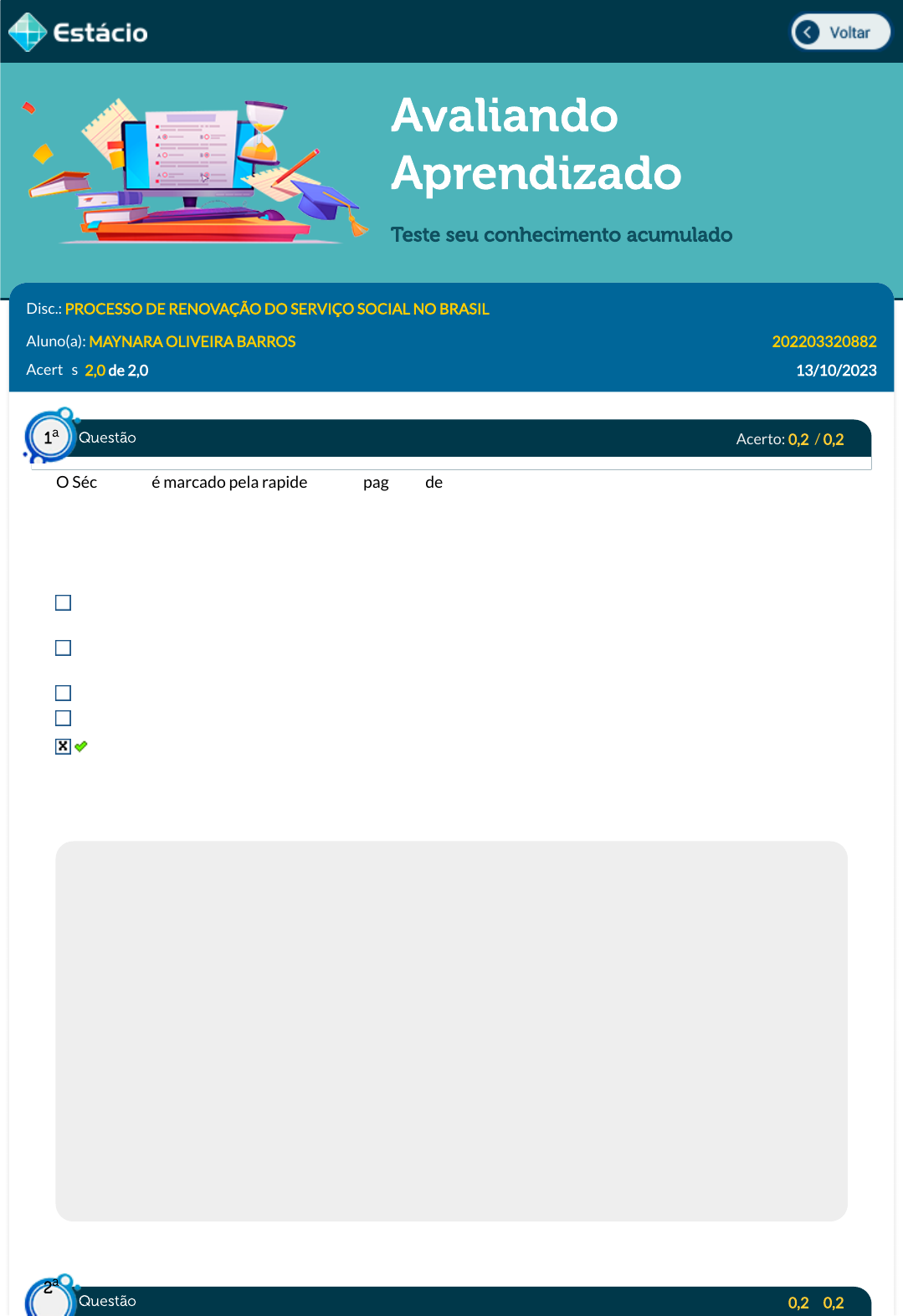 13/10/2023, 14:28 Estácio: Alunos https://simulado.estacio.br/alunos/ 1/5 Avaliando Aprendizado Teste seu conhecimento acumulado Disc.: PROCESSO DE RENOVAÇÃO DO SERVIÇO SOCIAL NO BRASIL Aluno(a): MAYNARA OLIVEIRA BARROS 202203320882 Acertos: 2,0 de 2,0 13/10/2023 Acerto: 0,2 / 0,2 O Século XXI é marcado pela rapidez na propagação de informações. Aos tradicionais meios de comunicação - rádio, TV, periódicos - foram somadas as redes sociais cuja velocidade di�culta a veri�cação da validade das informações recebidas e repassadas, criando as chamadas fake news. Esta característica das redes tem sido largamente usada em campanhas políticas, como a de Donald Trump, em 2016. Sobre esta tática, utilizada por Trump, é correto a�rmar. Apenas Donald Trump recorreu ao uso das fake news como instrumento política nas eleições presidenciais. O eleitorado norte-americano passou a se informar somente pelas redes sociais o que facilitou a propagação das fake news. O e�ciente sistema de proteção de dados impediu a propagação das fake news. O uso das fake news não impactou no resultado das eleições que levaram Donald Trump ao poder Conhecer minuciosamente o per�l dos eleitores permitiu produzir notícias falsas que exploravam questões sensíveis para o eleitorado norte-americano. Respondido em 13/10/2023 15:20:59 Explicação: Gabarito: Conhecer minuciosamente o per�l dos eleitores permitiu produzir notícias falsas que exploravam questões sensíveis para o eleitorado norte-americano. O eleitorado norte-americano passou a se informar somente pelas redes sociais o que facilitou a propagação das fake news. - Não é possível a�rmar de forma generalizada que os estadunidenses só sé informavam pelas redes sociais. Há, por exemplo, canais de televisão de orientação republicana e de orientação democrata que continuaram sendo fonte de informação no país. O e�ciente sistema de proteção de dados impediu a propagação das fake news - Não existiu um e�ciente sistema de proteção de dados, pelo contrário, os dados foram fornecidos a empresas de forma ilegal. Apenas Donald Trump recorreu ao uso das fake news como instrumento política nas eleições presidenciais - Não só a campanha de Donald Trump se valeu de fake news, como também a campanha de Hillary Clinton. O uso das fake news não impactou no resultado das eleições que levaram Donald Trump ao poder. - O uso das fake news in�uenciou o resultado das eleições na medida em que se criou informações falsas sobre os candidatos. Destaca- se aqui as notícias falsas que relacionavam a candidata Hillary Clinton a redes de pedo�lia e de abusos sexuais e que geraram descon�ança dos eleitores. Acerto: 0,2 / 0,2 Questão1 a Questão 2 a https://simulado.estacio.br/alunos/inicio.asp https://simulado.estacio.br/alunos/inicio.asp javascript:voltar(); javascript:voltar(); 13/10/2023, 14:28 Estácio: Alunos https://simulado.estacio.br/alunos/ 2/5 Durante a Primeira República (1889-1930), mais precisamente em 1906, foi �rmado um acordo no qual os governadores de São Paulo, Rio de Janeiro e Minas Gerais estabeleceram diretrizes, objetivando conservar a estabilidade dos preços do café no mercado internacional. Esse acordo, que denota o poder político e econômico dos cafeicultores paulistas durante a primeira experiência republicana brasileira, �cou conhecido como Convênio de Taubaté, em que o governo se comprometia a comprar excedentes para regular o preço. Ele foi muito útil durante a crise mundial econômica desencadeada em 1929 e mostra que mesmo com a "Revolução de 1930" a prática foi ressigni�cada por Vargas, mesmo representando uma ruptura. Que prática é essa? Domínio político de São Paulo na regulação de preços no Brasil, para o mercado interno. Funding Loan para garantir o preço internacional pela força do Brasil. "Toma lá da cá" dos políticos no Congresso Nacional, para discutir de quanto comprar do café. Compra do café excedente dos latifundiários realizada pelo governo, em que Vargas chegou a queimar café nos armazéns para garantir que os proprietários, não tivessem prejuízo. Fim da Política dos Governadores para controle das eleições, com a compra como empréstimo. Respondido em 13/10/2023 15:21:54 Explicação: No histórico brasileiro, o governo é o principal responsável por intervir em prol dos interesses econômicos e, mesmo diante de modelos posteriores, essa é uma tendência importante. Nas primeiras décadas de 1900, o papel agrário exportador ainda era destacado e o governo atuava como "gerente" nas crises que apareciam. Muitos consideraram que isso era típico da Políticas dos Governadores, mas a força do processo fez com que Vargas comprasse café e abandonando o mesmo para "ajudar" no processo de regulação do preço, lembrando que a crise de 1930 é uma crise de superprodução. Acerto: 0,2 / 0,2 Quais os três pilares que sustentam o conceito de sustentabilidade? Compliance, anti suborno e riscos. Econômico, social e ambiental. Competitividade, qualidade e produtividade. Custos, atendimento com excelência e justiça social. Qualidade, meio ambiente e saúde e segurança ocupacional. Respondido em 13/10/2023 15:22:29 Explicação: A resposta correta é: Econômico, social e ambiental. Acerto: 0,2 / 0,2 (IPAD / 2015 ) O Serviço Social é uma pro�ssão historicamente determinada, construída no seio de relações sociais mais amplas, atravessadas por múltiplas determinações. Sobre a trajetória histórica da pro�ssão no Brasil, analise os itens abaixo e assinale o incorreto: O desenvolvimento capitalista industrial e a expansão urbana relacionam-se ao desenvolvimento do Serviço Social como pro�ssão reconhecida na divisão social e técnica do trabalho. A transição da década de 1970 à de 1980 marca um momento importante no desenvolvimento do Serviço Social no Brasil, vinculado, especialmente, ao enfrentam