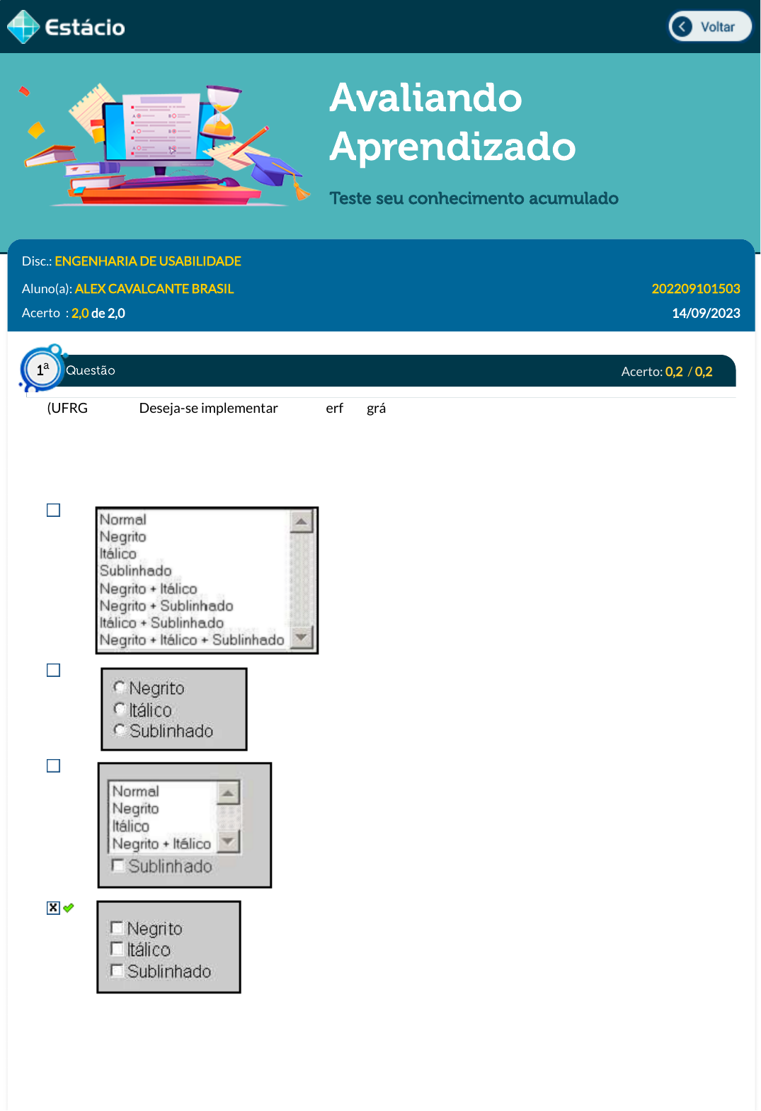 Avaliando Aprendizado Teste seu conhecimento acumulado Disc.: ENGENHARIA DE USABILIDADE Aluno(a): ALEX CAVALCANTE BRASIL 202209101503 Acertos: 2,0 de 2,0 14/09/2023 Acerto: 0,2 / 0,2 (UFRGS/2013) Deseja-se implementar uma interface grá�ca que permita que se escolha a marcação dos efeitos de texto Negrito, Itálico e Sublinhado, de tal forma que possa ser escolhido um dos três efeitos, dois deles ou até os três simultaneamente, ou, ainda, nenhum deles, mantendo o texto no modo normal, isto é, sem nenhum efeito. Segundo as regras de usabilidade vigentes, qual é a alternativa que realiza o solicitado com maior usabilidade? Questão1 a https://simulado.estacio.br/alunos/inicio.asp https://simulado.estacio.br/alunos/inicio.asp javascript:voltar(); javascript:voltar(); Respondido em 14/09/2023 17:04:00 Explicação: Não poderíamos usar radio buttons, pois as opções são mutuamente exclusivas. Lista de seleção também não seria adequada. Por exclusão, temos a alternativa que utiliza checkbox. Acerto: 0,2 / 0,2 O ciclo de vida é a estrutura contendo processos, atividades e tarefas envolvidas no desenvolvimento, operação e manutenção de um produto de software, abrangendo a vida do sistema, desde a de�nição de seus requisitos até o término de seu uso. Disponível em: https://www.devmedia.com.br/ciclos-de-vida-do-software/21099. Acesso em: 23 set. 2022. No Ciclo de Vida Estrela, a atividade central é: Avaliação Prototipação Especi�cação de Requisitos Implementação Análise de Tarefas Respondido em 14/09/2023 17:05:50 Explicação: O ciclo de vida estrela é um processo composto por seis atividades. Todas as atividades estão interligadas pela atividade de avaliação, ou seja, o que quer que se faça sempre necessita de uma avaliação, ao concluir uma atividade e antes de iniciar outra. Acerto: 0,2 / 0,2 A usabilidade é um termo utilizado para de�nir a facilidade com que as pessoas empregam uma ferramenta ou mesmo um objeto para realizar uma tarefa. No ambiente de software, os sistemas são as ferramentas utilizadas para a execução de tarefas pelo usuário e encontramos na usabilidade o momento do diálogo entre o usuário e a interface do software. Disponível em: https://www.teclogica.com.br/o-que-e-usabilidade/. Acesso em: 23 set. 2022. Avaliação de usabilidade pode ser entendida como: Estudo do diálogo humano-computador que busca economia de tempo, diminuição da carga cognitiva e rapidez de decisões. Uma ferramenta geral aplicada no estágio �nal do projeto, excluindo a prototipagem. Técnica realizada com os desenvolvedores de um sistema, visando maximizar o seu desempenho. Questão2 a Questão3 a Estratégia adotada pelo arquiteto de software para excluir o usuário de emitir opiniões. O procedimento para aquisição de informações sobre a usabilidade ou potencial usabilidade de um sistema, a �m de aprimorar recursos em uma interface em desenvolvimento. Respondido em 14/09/2023 17:06:41 Explicação: Resposta correta: o procedimento para aquisição de informação sobre a usabilidade ou potencial usabilidade de um sistema, a �m de tanto aprimorar recursos numa interface em desenvolvimento e seu material de suporte quanto avaliar uma interface já avaliada. De acordo com Barbosa e Silva (2010), um sistema interativo deve ser avaliado sob as perspectivas de todos os envolvidos: Quem o concebe (projetista), quem o constrói (desenvolvedores), e quem o utiliza (usuários). Acerto: 0,2 / 0,2 Acessibilidade Digital é a eliminação de barreiras na Web. O conceito pressupõe que os sites e portais sejam projetados de modo que todas as pessoas possam perceber, entender, navegar e interagir de maneira efetiva com as páginas. Disponível em: https://www.gov.br/governodigital/pt-br/acessibilidade-digital Acesso em: 26 set. 2022. São consideradas dimensões de Acessibilidade: Arquitetônica, equitativo, comunicacional, robusto e perceptível. Urbanísticas, arquitetônicas, nos transportes, nas comunicações e na informação, atitudinais e tecnológicas. Programáticas, de locomoção, de atitude, comunicacional e tecnológica. Equitativo, �exível, simples e intuitivo. Arquitetônica, metodológica, instrumental, programática, atitudinal e comunicacional. Respondido em 14/09/2023 17:11:27 Explicação: Acessibilidade arquitetônica, metodológica, instrumental, programática, atitudinal e comunicacional. Todas as dimensões são consideradas igualmente importantes e complementares entre si. Portanto, a ausência de uma dimensão compromete negativamente as demais. Acerto: 0,2 / 0,2 O Ergodesign busca acabar com as diferenças que existem entre as disciplinas de Ergonomia e Design. Qual das práticas de design citadas abaixo já traz embutido o conceito de Ergodesign? Design Centrado no Usuário. UX Writing. Design de interação. Design de Interface. Interface Humano-computador. Respondido em 14/09/2023 17:08:16 Explicação: Questão4 a Questão5 a A resposta correta é 'Design Centrado no Usuário'. Muitas vezes, mesmo que não se fale o nome 'Ergodesign', isso já está sendo utilizado, pois vem embutido nos conceitos de 'usabilidade', 'design centrado no usuário', 'experiência do usuário', 'design emocional' etc., dado que trata justamente da relação do usuário com uma interface qualquer. Acerto: 0,2 / 0,2 Uma diretriz relacionada à qualidade de interface é uma recomendação ou orientação que visa garantir que a interface do usuário (UI) de um software seja fácil de usar, intuitiva, e�ciente e agradável. Nesse sentido, marque a alternativa correta. O software deve ser complexo e pouco intuitivo. Alguns autores destacam a importância de manter o usuário no controle da interação. O sistema deve interromper o usuário o máximo possível, passando a ideia de controle e proteção. Para melhorar a experiência de uso do sistema, não deve-se adotar medidas mínimas de segurança. O software não deve ser observador