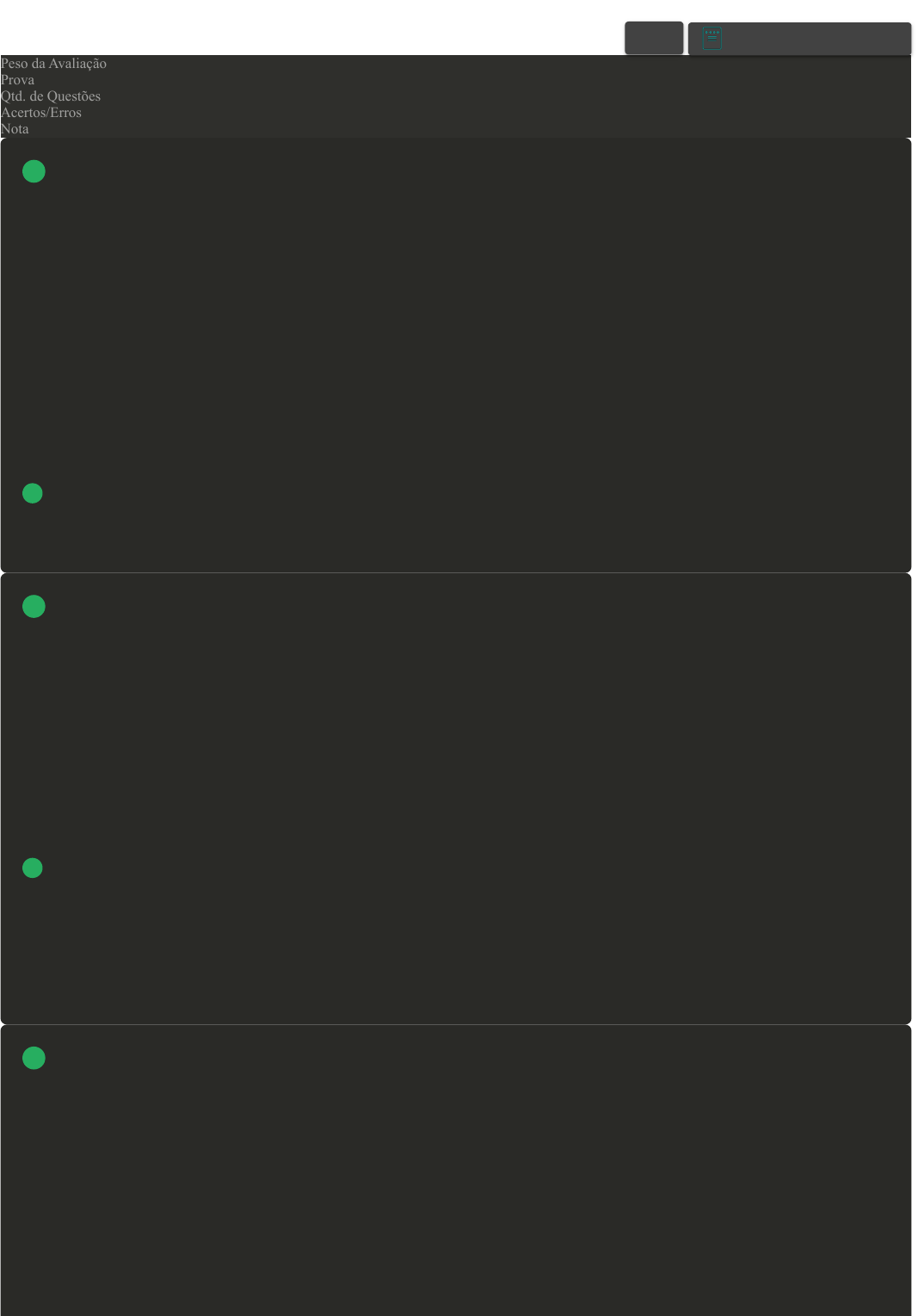 Prova Impressa GABARITO | Avaliação II - Individual (Cod.:887935) Peso da Avaliação 1,50 Prova 71968650 Qtd. de Questões 10 Acertos/Erros 10/0 Nota 10,00 No desenvolvimento de novas interfaces dos produtos, faz-se uso de métodos de avaliação de usabilidade como apoio na verificação da qualidade de uso. Existem uma grande gama de métodos de avaliação de usabilidade, sendo que cada um deles possui suas especificidades e buscam avaliar um tipo especifico de produto, usuário ou forma de interação. Os métodos de avaliação existentes podem ser categorizados de várias formas, com ou sem o envolvimento do usuário. Com base no exposto, analise as afirmativas a seguir: I- Avaliação Heurística é um método de avaliação que envolve apenas o analista. II- Inspeção é um método de avaliação que NÃO envolve usuários. III- Estudo de Campo é um método de avaliação que NÃO envolve usuários. Assinale a alternativa CORRETA: FONTE: https://www.researchgate.net/publication/306375261_METODOS_DE_AVALIACAO_DE_USABILIDADE_CARACTERISTICAS_E_APLICACOES. Acesso em: 29 mar. 2019. A As afirmativas I e III estão corretas. B Somente a afirmativa III está correta. C As afirmativas I e II estão corretas. D As afirmativas II e III estão corretas. No contexto de desenvolvimento de software existem varias normas de qualidade que buscam um conjunto de características a serem satisfeitas, de modo que o produto de software atenda às necessidades de seus usuários, entre elas está a norma ISO/IEC 9126, que define qualidade de software como a totalidade de características de um produto de software que lhe confere a capacidade de satisfazer necessidades explícitas e implícitas. Sobre as características de qualidade de software do modelo do padrão ISO/IEC 9126, associe os itens, utilizando o código a seguir: I. Confiabilidade. II. Eficiência. III. Funcionalidade. IV. Portabilidade. ( ) Conjunto de atributos associados à capacidade de migração do produto de um ambiente para outro. ( ) Conjunto de atributos que implicam a existência de um conjunto de funções e propriedades correspondentes, cada uma satisfazendo qualidades pré-estabelecidas., ( ) Conjunto de atributos relacionados à capacidade de manutenção do grau de desempenho do produto. ( ) Conjunto de atributos vinculados à relação entre o desempenho do produto e a quantidade de recursos empregados. Assinale a alternativa que apresenta a sequência CORRETA: A IV - III - I - II. B I - II - IV - III. C IV - II - III - I. D IV - II - I - III. Usabilidade é um termo usado para definir a qualidade de uso de um software ou qualquer outro objeto a fim de realizar uma tarefa específica e importante. Ela objetiva fazer uma avaliação da qualidade de uma interface com relação à sua utilização por parte dos usuários. Através desta avaliação, são diagnosticadas características da interface que atrapalham a interação, provavelmente por não estarem em conformidade com padrões implícitos e explícitos de Usabilidade. Sobre os objetivos de uma avaliação de usabilidade, analise as seguintes afirmativas: I- Verificar o desempenho real dos sistemas face aos objetivos que foram estabelecidos pelos usuários. II- Fazer a detecção precoce de problemas de usabilidade. III- Prever potenciais dificuldades de aprendizado na operação do sistema. Assinale a alternativa CORRETA: A Somente a afirmativa III está correta. B Somente a afirmativa II está correta. VOLTAR A+ Alterar modo de visualização 1 2 3 C As afirmativas I e III estão corretas. D As afirmativas II e III estão corretas. Uma das maiores dificuldades encontradas está em avaliar o quanto uma interface é adequada ao uso. A "usabilidade é uma metodologia científica aplicada na criação e remodelação de interfaces de sites, intranets, aplicativos, jogos e produtos de modo a torná-las fáceis de aprender e de usar". Podemos dizer que um problema de usabilidade ocorre quando determinada característica do sistema acaba por retardar, prejudicar ou mesmo inviabilizar a realização de uma tarefa, incomodando, constrangendo ou traumatizando o usuário que utiliza o sistema. Sobre a natureza de um problema de usabilidade, associe os itens utilizando o código a seguir: I- Barreira. II- Ruído. III- Obstáculo. ( ) Causa uma diminuição de seu desempenho na tarefa, o usuário pode desenvolver uma má impressão do sistema. ( ) Se refere a um aspecto da interface no qual o usuário esbarra sucessivas vezes e não aprende a suplantá-lo. Sua presença na interface implica em prejuízos definitivos, que dependendo da tarefa e usuário, podem inviabilizar economicamente o sistema. ( ) Se refere a um aspecto da interface no qual o usuário esbarra e aprende a suplantá-lo. Sua presença implica na acumulação de prejuízos para os que operam e para os que adquiriram o sistema. Assinale a alternativa que apresenta a sequência CORRETA: A II - I - III. B III - II - I. C II - III - I. D I - III - II. Vários princípios de designer já foram criados, eles normalmente objetivam determinar o que os usuários devem ver e fazer quando estão executando uma tarefa. Eles são derivados de uma mistura de conhecimento baseado em teoria, experiência e senso comum, são um conjunto de itens que devem ser assegurados para que a interface seja bem aceita, são eles: visibilidade, feedback, restrições, mapeamento, consistência e affordance Com base na imagem a seguir, assinale a alternativa CORRETA que apresenta o princípio utilizado: A Affordance. B Feedback. C Restrições. D Consistência. De acordo com o padrão de qualidade ISO 9126, são identificados seis atributos fundamentais da qualidade. Dentre eles, analise as sentenças a seguir: I- Funcionalidade. II- Portabilidade. III- Eficácia. IV- Usabilidade.Assinale a alternativa CORRETA: A As sentenças II e III estão corretas. B As sentenças I, II e III estão corretas. C As sentenças I, II e IV estão corre