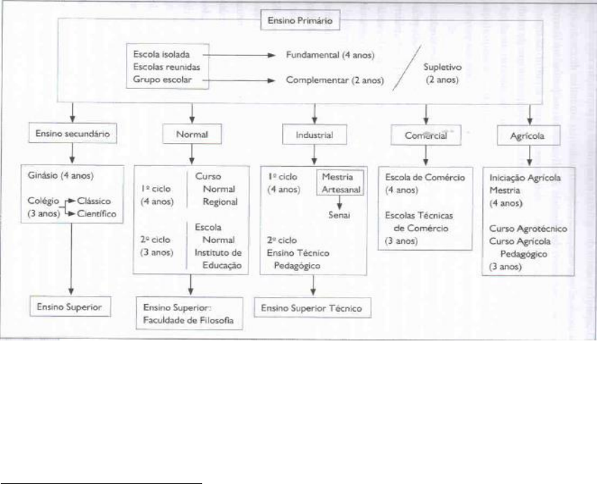 A REFORMA CAPANEMA: FRAGMENTAÇÃO NA EDUCAÇÃO PROFISSIONAL O período que teve início com a regulamentação das Leis Orgânicas do Ensino (Reforma Capanema), na década de 1940, inaugurou uma série de transformações na educação brasileira, entre as quais pode ser destacada a criação do Serviço Nacional de Aprendizagem Industrial (SENAI) e o Serviço Nacional do Comércio (SENAC), órgãos que motivaram e influenciaram a criação de instituições de cunho profissionalizante. Nessa mesma época, foi promulgado o Decreto n. 4.036/1942, que ampliou a abrangência do SENAI para setores além da indústria, inserindo também a pesca, o transporte e a comunicação. Esses decretos potencializaram a configuração de uma rede de escolas técnicas organizadas e gerenciadas por órgãos de representação empresarial. Esse conjunto de decretos e ações são considerados o núcleo formador do conjunto de instituições denominadas Sistema S1 (MANFREDI, 2002). Em termos gerais, observa-se que houve transformações no ensino técnico profissionalizante durante a Era Vargas, que podem ser visualizadas na Figura 3, que apresenta um resumo da estruturação da educação brasileira a partir da década de 1940, com as alterações trazidas pelas Leis Orgânicas do Ensino: Fonte: Ghiraldelli Júnior (2009) Figura 3: Estruturação da educação brasileira – década de 1940 Pode ser observado na Figura 3 que, a partir das Leis Orgânicas, o ensino técnico profissional foi estruturado em três setores da economia (industrial, comercial e agrícola). Na 1 Sistema S” designa um conjunto de instituições de caráter privado que são mantidas por contribuições das categorias profissionais e recursos públicos, as quais têm por meta ofertar melhorias e aperfeiçoamento na formação profissional dos trabalhadores. Podem ser destacadas, entre essas instituições, o Serviço Nacional de Aprendizagem Industrial (SENAI); o Serviço Nacional de Aprendizagem do Comércio (SENAC); o Serviço Nacional de Aprendizagem do Transporte (SENAT); o Serviço Social da Indústria (SESI) e o Serviço Social do Comércio (SESC), entre outros. Como a maioria das instituições tem sua sigla iniciada pela letra "S", convencionou-se chamar este conjunto de instituições de Sistema S (BRASIL, 2014). mesma Figura também é apresentada a área do magistério, denominada normal, o ensino secundário, e na parte de cima o ensino primário. De maneira geral, os cursos do ensino profissional se organizavam em dois ciclos: um fundamental, de quatro anos, e outro técnico, que poderia ter de três a quatro anos. Também destaca-se o caráter de seletividade aplicado, principalmente devido à obrigatoriedade de exames de admissão que constituíam, no período, um pré-requisito para que o sujeito tivesse acesso à etapa posterior, que poderia ser o ginásio, no caso do ensino secundário, o 1º ciclo do normal ou o 1º ciclo dos cursos técnicos da área industrial, comercial e agrícola. (ROMANELLI, 2014). No caso do ensino primário, também apresentado na Figura3, vê-se que, como o Decreto-lei n. 8.529, de 1946 (Lei Orgânica do Ensino Primário) foi promulgado em momento posterior à saída de Getúlio Vargas do governo, tornava-se possível um retorno à democracia e à abertura de novos rumos para o acesso à educação. Dessa forma, a estruturação do ensino primário, organizado em fundamental e supletivo, com duração de quatro e dois anos, respectivamente, representava essa nova possibilidade. De acordo com a afirmação de Shiroma (2004), a partir da regulamentação do Decreto- lei n. 8.529/1946 nos Artigos 2º ao 9º, o ensino primário fundamental seria destinado a crianças de sete a doze anos, e o ensino primário supletivo aos adolescentes e adultos que não receberam esse nível de educação na idade considerada adequada. O ensino secundário, regulamentado pelo Decreto-lei n. 4.244, de 1942, era dividido em ginásio, com a duração de quatro anos, e o 2º ciclo, estruturado em clássico ou científico, com a duração de três anos. O clássico intencionava oferecer a formação voltada para a área de humanidades, enquanto o científico tinha como foco principal a formação que privilegiava as ciências naturais e exatas (ROMANELLI, 2014). Em ambos os casos – clássico e científico — os cursos não possuíam caráter de formação profissional, pois o objetivo era proporcionar condições para o ingresso em cursos superiores. Em Romanelli (2014) e Shiroma (2004) podem ser visualizadas diversas observações sobre o ensino secundário regulamentado pelo Decreto-lei n. 4.244/1942, cujo ponto central seria formar as “individualidades condutoras” do país. Assim, segundo as autoras, o Decreto só reafirmava a tradição do ensino secundário acadêmico, propedêutico e aristocrático, refletindo o momento político do Estado Novo, caracterizado por uma ideologia autoritária e populista. No ensino industrial, além do 1º ciclo (básico) de quatro anos, existia o curso de mestria, que tinha duração de dois anos e estava incluso nesse ciclo básico. O ensino técnico pedagógico, inserido no 2º ciclo, tinha a duração de um ano, e visava a formação de professores para atuação nas escolas com foco industrial, complementando assim a parte técnica da área. Ainda inseridos no ensino industrial, havia os cursos artesanais, de duração curta e variável, e os cursos de aprendizagem, destinados à qualificação de aprendizes industriais, com a intenção de manter vínculo direto com possíveis empregadores. Quanto à questão do acesso ao ensino superior, é enfatizado por Romanelli (2014) que só era permitido o ingresso em cursos superiores de áreas correlatas, então denominadas como Ensino Superior Técnico, caracterizando inflexibilidade e diminuição de possibilidades aos que optavam pelo ensino industrial. O ensino comercial e o ensino agrícola tinham o 1º ciclo com d