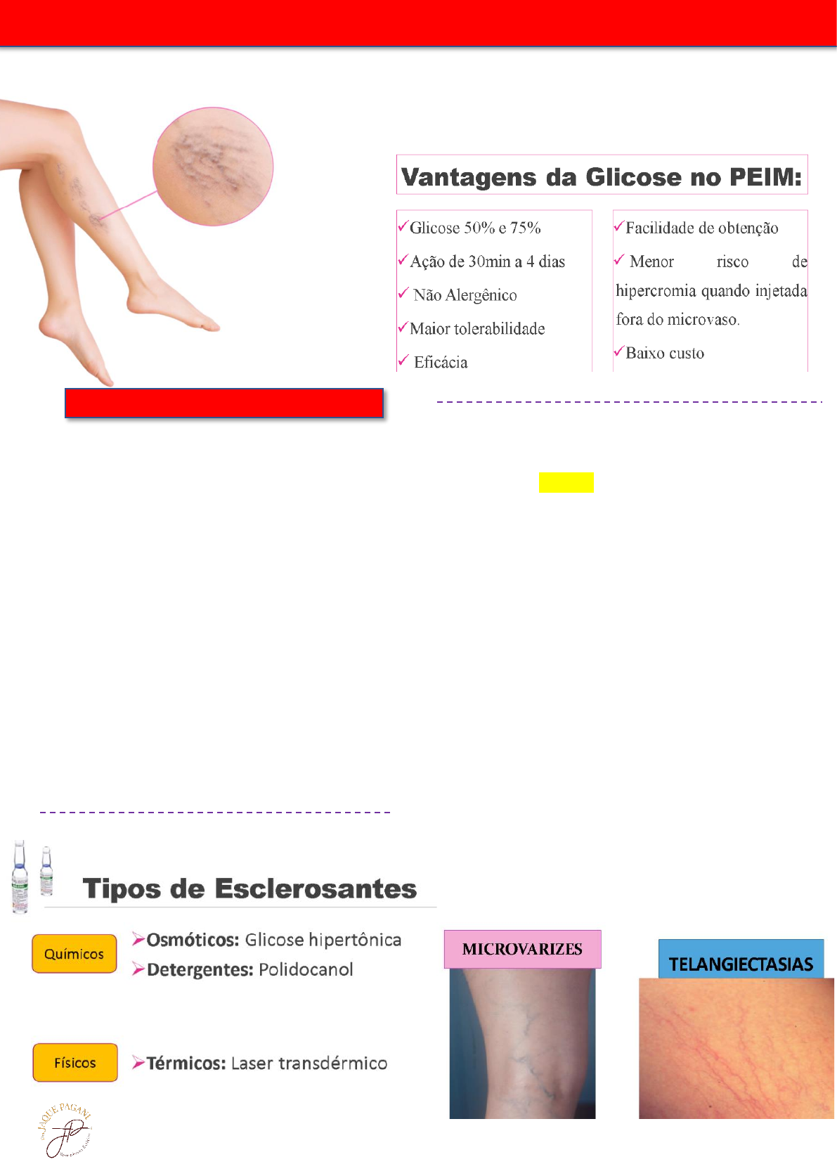 ✓ É um procedimento estético injetável destinado para o tratamento de microvasos ou telangiectasias, através da injeção de uma solução hipertônica de glicose com concentração de 50% ou 75% denominado esclerosante. ✓ Por sessão, restringe-se a quantidade de até 10 ml e pode ser feito aplicação com anestésico. ✓ As causas são multifatorais atingindo cerca de 70% das mulheres. ✓ Se enquadram em 4 subtipos, sendo o tipo I, classificadas como disfunção estético e, portanto, os tratamentos são mais direcionados à estética. Os demais subtipos são de interesse médico. Definição de varizes: As veias normalmente tem estruturas anatômicas denominadas válvulas que permitem que o sangue vá das pernas ao coração mesmo contra a ação da gravidade. Varizes são alterações morfológicas e funcionais nas paredes das veias, que impedem o funcionamento das valvas venosos no fluxo sanguíneo. Existe dois tipos de varizes: 1. Varizes primárias, que aparecem influenciadas pela tendência hereditária e são classificadas como tipo I. São superficiais de coloração arroxeada. 2. Varizes secundárias que aparecem por doenças adquiridas no decorrer da vida e de deficiência venosa, são de tratamento mais difícil e são classificadas como tipo II, III ou IV. PEIM – Procedimento estético injetável para microvasos VISÃO GERAL Fonte TONI T. Z. et al 2017 A panturrilha exerce importante ação no retorno venoso, uma vez que , a contração da musculatura esquelética auxilia na compressão dos vasos sanguíneos. impulsionando a circulação de volta ao coração. O sedentarismo é responsável por deixar a musculatura da panturrilha frouxa, dificultando a ação dos músculos no retorno venoso. A. Veia tortuosa, com válva e parede anormal ocasionando refluxo sanguíneo. B. Veia com Válva e parede normal, fluxo sanguíneo ocorrendo normalmente. B A São três principais vias que facilitam o surgimento de microvasos. 1. A fragilidade na parede dos vasos sanguíneos. 2. deficiência na válva impulsora, 3. panturrilha com musculatura frouxa. CAUSA DAS VARIZES Fonte: Santos et al, 2020 Características dos microvasos São capilares sanguíneos, microvarizes ou também chamado de microvasos ou telangiectasias, com 1 á 2mm de espessura, de origem primária, ou seja, caráter meramente estético, ocasionada principalmente por tendências hereditárias . tipos dos microvasos De acordo com a imagem acima, Os microvasos podem ser: • A. lineares/simples. • B/C ramificados como os arborizados/aracneiforme. • D. Pápulas. Se apresentam de cor azulada ou avermelhada com ou sem presença de queimação na região. Fonte: TONI T. Z., et al, 2017 Predisposição As causas são multifatoriais, com exemplo: Hereditariedade, sobrepeso, longos períodos de tempo em uma mesma posição (sentado/em pé), gravidez, anticoncepcional, Idade avançada, tabagismo, entre outros hábitos de vida considerados prejudiciais a saúde. Contraindicação Gestantes Doenças vasculares, Diabetes descompensada, Usuários de anticoagulantes, Doenças autoimunes Microvarizes classificadas acima do tipo I. Mecanismo de ação da substância A solução hipertônica de glicose 50% ou 75%, é um esclerosante osmótico muito utilizado devido a sua segurança, tolerabilidade e baixo custo. 1. A sua ação consiste em causar desintegração das células que constituem a parede do vaso sanguíneo através da inflamação, ocasionado perda de água causando o desaparecimento dos microvasos pouco a pouco. 2. Para isto, injeta-se a glicose no interior dos vasinhos promovendo um processo inflamatório , 3. Nisto, os microvasos se transformam em fibrose causando o colabamento e posterior metabolização, excluído os microvasos da circulação e, resultando em melhora na aparência estética. Falhas na técnica 1. Desconhecimento da técnica 2. Injetar volumes excessivos 3. Injetar fora do microvaso 4. Pressão exagerada na punção Reações adversas e complicações ➢ Dor ou sensação de queimação em razão das microinjeções. ➢ Hematomas ➢ Equimoses ➢ Telangiectasias secundárias ➢ Hiperpigmentação pós inflamatória ➢ Microvasos secundários ➢ Flebite e microtrombos ➢ Necrose Fonte: Santos et al, 2020 Dica de ouro: Como evitar complicações: Perguntas frequentes no consultório: 1. Microvasos podem voltar? O mesmo microvaso após finalizar o tratamento não retornará mas, podem surgir novos microvasos, uma vez que, as causas são multifatoriais. 2. Microvasos se transformam em varizes? Não, microvasos são dilatações de capilares sanguíneos e varizes são dilatações de veias. 3. Os microvasos desaparecem na hora? Não, o que acontece no momento da aplicação é a glicose percorrendo o microvaso e nesse momento empurrando o sangue. Os resultados após as aplicações podem ser notados após 7 dias e dependendo de cada caso, pode ser necessário várias sessões para alcançar resultados satisfatórios. ✓ A injeção deve ser interrompida sempre que a pele ao redor da punção tornar-se pálida, formar pápulas ou quando o paciente se queixar de muita dor. ✓ Cuidado com o volume a ser injetado em cada vaso (0,1 á 0,2 ml) ✓ Cuidado para não extravasar glicose nos tecidos adjacentes. ✓ Ao término de cada punção, pressione a região para evitar refluxo. ✓ Caso fique hematomas, indique pomada para hematomas e solicite ao paciente que evite exposição solar.