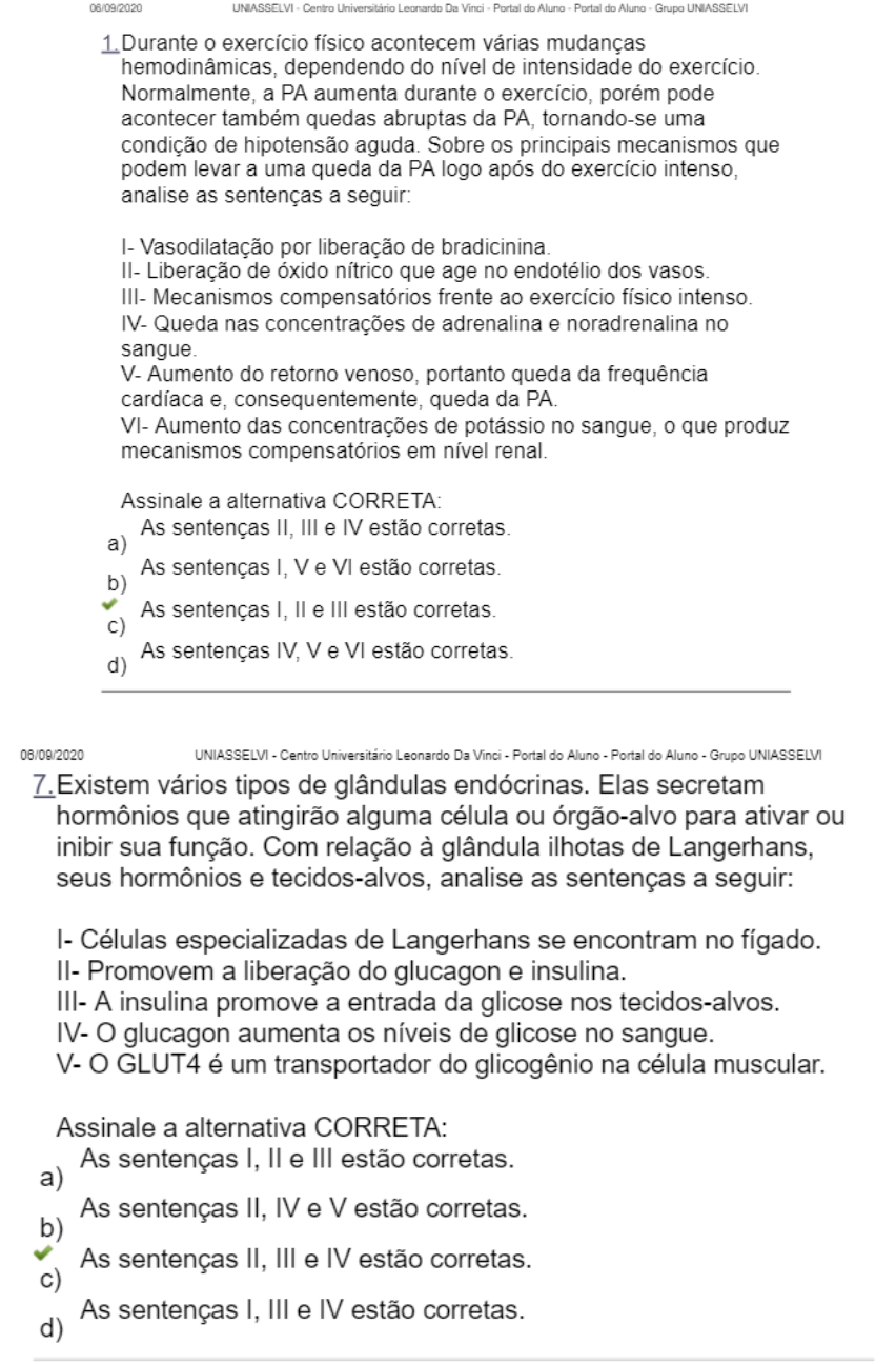 Avaliação I - Individual (Cod.:766745) Fisiologia do Exercício (EDF06) Prova – Nota: 9 57132887 Período para responder 01/11/2022 - 16/11/2022 1 Por meio da ingestão equilibrada de todos os nutrientes, pode-se promover a saúde, prevenir doenças e melhorar a capacidade de rendimento do organismo (PEREIRA; CABRAL, 2007.). Dentre esses nutrientes, os carboidratos são a principal fonte de energia para o correto funcionamento do nosso corpo. Sobre as funções do carboidrato no corpo humano, assinale a alternativa CORRETA: A) Produzir níveis elevados de glicose no sangue, contribuir para as reservas de glicogênio hepático e manter o balanço energético estável. B) A manutenção de membrana da célula para produzir e armazenar glicogênio no sangue. C) Otimização dos estoques de glicogênio muscular, manutenção dos níveis de glicose no sangue e a adequada reposição das suas reservas na fase de recuperação após o exercício. D) Manter os níveis de glicose no sangue, proporcionar a síntese protéica e ativação mitocondrial da glicose durante o exercício e criar depósitos de gordura, glicogênio muscular e hepático. 2 Sobre as características da nutrição equilibrada e sua relação com o exercício físico, classifique V para sentenças verdadeiras e F para as falsas: (V ) Pela ingestão equilibrada de todos os nutrientes, oriundos de uma boa nutrição, pode-se promover a saúde, prevenir doenças e melhorar a capacidade de rendimento do organismo. (F) Os macronutrientes (carboidratos, proteínas e lipídios) juntos influenciam a ingestão calórica (IC) e no gasto energético (GE), com importante papel na perda de peso e controle de gordura corporal. (V ) A nutrição acompanha o ser humano em todas as etapas de sua vida, com suas peculiaridades dietéticas, levando em conta origens, idade, condições fisiológicas e múltiplas finalidades. (V ) O objetivo dos guias alimentares é organizar de forma gráfica a distribuição dos alimentos para que a população compreenda e, a partir disso, faça com que haja o consumo de vários alimentos e em quantidade suficiente para que juntos componham uma dieta adequada nutricionalmente. Assinale a alternativa que apresenta a sequência CORRETA: A) F - V - F - F. B) V - F - V - F. C) F - V - F - V. D) V - F - V - V. 3 Os lipídeos são moléculas pequenas semelhantes ou homólogas.Com relação à água e as características que apresenta, assinale a alternativa CORRETA: A) Hidrossolúveis. B) Homogênias. C) Insolúveis. (resposta certa) D) Solúveis. 4 Durante o exercício físico, os lipídios são utilizados como importantes fontes de energia com os carboidratos. Entretanto, os lipídios também são utilizados para outras funções na célula e no corpo. Sobre os principais tipos de lipídios, analise as opções a seguir: I- Triglicerídeos, fosfolipídios, ceras e esteroide. II- Triglicerídeos, fosfolipídios e terpenos e esteroide. III- Triglicerídeos, fosfolipídios, terpenos e prostaglandinas. IV- Esteroides, ceras, terpenos e prostaglandinas. Agora, assinale a alternativa CORRETA: A) As opções II e III estão corretas. B) Somente a opção I está correta. C) Somente a opção IV está correta. D) As opções I e IV estão corretas. 5 O seu uso como fonte de energia depende de alguns fatores, como a intensidade do exercício, duração, tipo de célula esquelética usada, tipo de exercício, taxas hormonais etc. Sobre o exposto, assinale a alternativa CORRETA: A) Água e Isotônicos. B) Carboidratos e Lipídios. C) Proteína e Sais Minerais. D) Sais Minerais e Vitaminas. 6 Os carboidratos são classificados de acordo com o tamanho do carboidrato, grau de polimerização e número de unidades monoméricas, ou de acordo com sua digestibilidade ou disponibilidade. Sobre o exposto, associe os itens, utilizando o código a seguir: I- Monossacarídeos. II- Dissacarídeos. III- Oligossacarídeos. IV- Polissacarídeos. (I) Com um açúcar por molécula. (II) Com dois açúcares por molécula. (III) De três a cinco açúcares por molécula. (IV) Mais de 20 unidades até milhares de monossacarídeos. Assinale a alternativa que apresenta a sequência CORRETA: A) I -II - III - IV. B) II - IV - III - I. C) I - III - IV - II. D) IV - III - II - I. 7 Quando falamos em água, podemos dizer que nosso corpo é constituído por 55 a 60% de massa corporal, segundo Tortora e Derrickson (2012) e até 70%, segundo outros autores. A massa muscular é composta por 65 a 75% de água, o que evidencia a importância da hidratação do nosso organismo para seu correto funcionamento. Sobre a água, a hidratação e os eletrólitos, classifique V para as sentenças verdadeiras e F para as falsas: ( ) A ingestão de água deve ser pelo menos 2,5 litros por dia. ( ) A excreção de água é realizada principalmente pela pele, em forma de suor ou vapor de água. ( ) Quando falamos de eletrólitos, sua principal função é a transmissão de estímulos elétricos, e um eletrólito orgânico muito conhecido é a glicose. ( ) Um eletrólito essencial do meio extracelular que regula o equilíbrio osmótico é o sódio, e sua concentração é de aproximadamente 145 mmol/L. ( ) Desidratação é um estado causado pela perda hídrica do nosso corpo, perda de água corporal causada pela hipoidratação. ( ) Uma das consequências da desidratação em nível intracelular é a hipoperfusão cerebral e o aumento das concentrações de citocinas no plasma. Assinale a alternativa que apresenta a sequência CORRETA: A) F - F - V - V - F - F. B) V - F - F - F - F - F. C) V - V - F - V - F - V. D) V - F - F - V - V - F. 8 Uma das formas de se monitorar a intensidade do exercício físico é a mensuração da frequência cardíaca. Se um indivíduo apresenta frequência cardíaca máxima de 170 bpm e frequência cardíaca de repouso de 70 bpm, então a sua zona de treinamento de 50% a 60%, é calculada por meio da equação da frequência cardíaca de