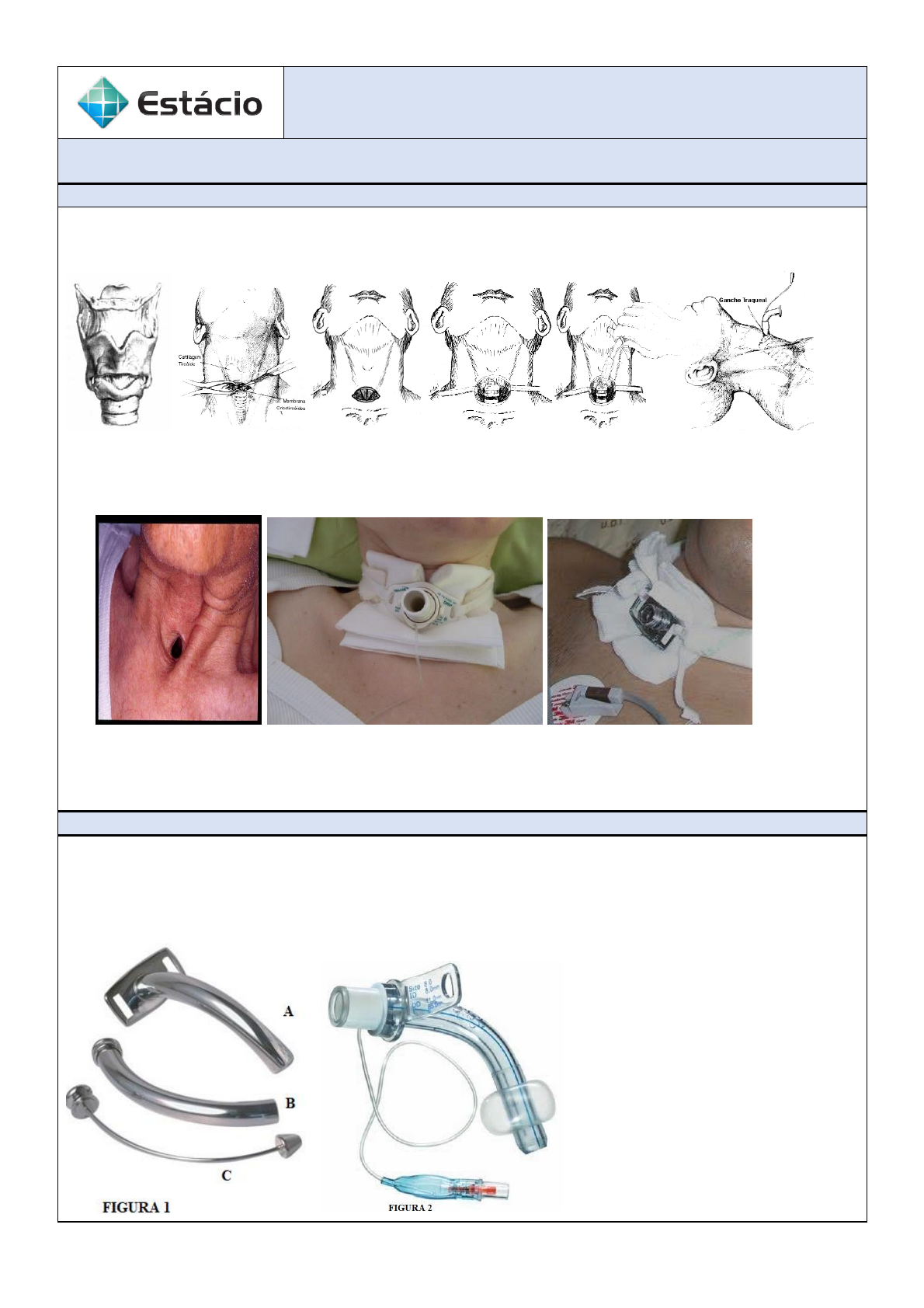 CENTRO UNIVERSITÁRIO ESTÁCIO CURSO DE ENFERMAGEM SEMIOLOGIA E SEMIOTÉCNICA EM ENFERMAGEM TÉCNICA: TRAQUEOSTOMIA INTRODUÇÃO O termo traqueostomia refere-se à cirurgia realizada para fazer uma abertura na traquéia e criar uma comunicação da luz traqueal com o exterior. O termo traqueostoma se aplica ao estoma cicatricial permanente obtido com a fixação da traqueia à pele. O enfermeiro tem competência técnica e legal para a: troca de gastrostomia, cistostomia e traqueóstomo. Sendo privativo a este profissional no âmbito da equipe de enfermagem (PARECER TÉCNICO COREN/PE: Nº020/2017). TIPOS DE TRAQUEÓSTOMO Quanto ao tempo de permanência: Temporário Permanente Podem ser: cânula traqueal metálica (Figura 1) ou cânula de plástico descartável (Figura 2). https://www.google.com.br/url?sa=i&rct=j&q=&esrc=s&source=images&cd=&cad=rja&uact=8&ved=2ahUKEwiRuePoqJLdAhVLEJAKHSPXBQUQjRx6BAgBEAU&url=https%3A%2F%2Fexperienciasdeumtecnicodeenfermagem.com%2Ftroca-de-fixacao-de-traqueostomia%2F&psig=AOvVaw363nprFVvfrTjMTUWR7Fmb&ust=1535634041796110 https://www.google.com.br/url?sa=i&rct=j&q=&esrc=s&source=images&cd=&cad=rja&uact=8&ved=2ahUKEwiXmPz2qJLdAhWKf5AKHbUHCC0QjRx6BAgBEAU&url=http%3A%2F%2Fwww.enfermagemvirtual.net%2F2012%2F07%2F&psig=AOvVaw363nprFVvfrTjMTUWR7Fmb&ust=1535634041796110 https://www.google.com.br/url?sa=i&rct=j&q=&esrc=s&source=images&cd=&cad=rja&uact=8&ved=2ahUKEwiTyI-gqpLdAhUMjpAKHV4UCvMQjRx6BAgBEAU&url=https%3A%2F%2Fproduto.mercadolivre.com.br%2FMLB-802940113-cnula-de-traqueostomia-metalica-fradel-n-4-standart-_JM&psig=AOvVaw3GxdGaU8uM8Dia7xlMW2vp&ust=1535634446005989 A cânula traqueal metálica é um tubo cilíndrico curvo, de metal, usado para criar uma comunicação entre a luz traqueal e o exterior. As cânulas traqueais metálicas variam de acordo com sua numeração, seu diâmetro interno e ângulo de curvatura. É composta de três peças: A- Uma parte externa não removível, que fica presa por um cadarço no pescoço do paciente. B- Uma parte interna, de diâmetro menor, chamada de endocânula, subcânula ou cânula interna. C- Um mandril que funciona como guia ou condutor na ocasião da introdução da cânula na traquéia, facilitando o acesso à luz traqueal. INDICAÇÕES ➢ Obstrução das vias aéreas superiores: • Infecções • Queimaduras • Disfunção laríngea • Manejo pós-operatório • Aspiração de corpos estranhos • Acidentes com substâncias corrosivas • Neoplasias de faringe, laringe, traquéia ou esôfago • Anomalias congênitas do trato respiratório superior • Traumas do esqueleto facial causando edema de laringe, de traquéia, língua ou faringe • Suporte ventilatório • Eliminação ineficaz de secreções das vias aéreas inferiores. ➢ Problemas que alteram a ventilação pulmonar: • Estados comatosos • Intoxicação por barbitúricos • Paralisia diafragmática • DPOC ➢ Eliminação ineficaz de secreções das vias aéreas inferiores: • Idade avançada • Astenia • Afecções neuro-musculares ➢ Pacientes que necessitam Suporte ventilatório prolongado COMPLICAÇÕES DE TRAQUEOSTOMIA ➢ Complicações no pós-operatório imediato: • Hemorragia • Enfisema subcutâneo • Obstrução da cânula • Deslocamento da cânula • Pneumotórax ou pneumomediastino ➢ Complicações no pós-operatório tardio • Infecção (51% dos casos) • Granuloma • Disfagia • Estenose traqueal e subglótica • Fístula traqueoesofágica • Fístula faringocutânea • Dificuldade de extubação FINALIDADE • Manter a via aérea desobstruída • Prevenir a infecção • Manter a área limpa • Avaliar condições do estoma • Reduzir o calibre para desmame MATERIAL PARA TROCA DO TQT • Conjunto de cânula de traqueostomia • Lâmina de bisturi • Esparadrapo (ou cadarço apropriado) • Gazes estéreis • Solução fisiológica • Transofix • Luva estéril • Luvas de procedimento, máscara, gorro e óculos • Material para aspiração traqueal (se necessário) • Forro • Saco plástico pequeno (lixo) • Biombo TÉCNICA DE TROCA DO CONJUNTO METÁLICO DA TQT Execução Objetivo 1. Verificar prontuário. ✓ Certificar-se quanto ao tipo e tamanho da cânula traqueal 2. Analisar paciente: confirmar o tipo e numeração do traqueóstomo. ✓ Não correr o risco de colocar um traqueóstomo de tamanho diferente, apenas em caso de prescrição médica. 3. Lavar as mãos. ✓ Prevenir infecção 4. Encaminha-se ao leito do paciente, deposita a bandeja sobre a mesa de cabeceira. 5. Explicar ao paciente o procedimento. 6. Analisar o ambiente: cama com acesso a oxigênio, vácuo e ar comprimido, conexões instaladas e prontas para serem usadas. 7. Fechar portas, janelas e colocar biombo (SN). ✓ Zelar pela privacidade 8. Calça a luva e realiza a limpeza da mesa de alimentação, parte inferior da bandeja, passa para a mesa de alimentação e limpe manivela da cama. 9. Retirar as luvas. 10. Preparar o cadarço para fixação Mensurar da comissura labial até a região occipital multiplicar o tamanho por 3. 11. Colocar os EPI’s (máscara, gorro, luva de procedimento e óculos de proteção). Prevenir infecção do paciente e do profissional. 12. Posicionar o paciente em decúbito dorsal com fowler a 45º. Promover conforto e segurança 13. Retirar travesseiros e proteger tórax com forro ou toalha. 14. Realizar a ausculta pulmonar. Verificar presença de ruídos adventícios. 15. Aspirar se necessário. Remover as secreções presentes. 16. Remover o curativo antigo com luva de procedimento. Desprezar o conteúdo no saco de lixo 17. Retirar as luvas e lavar as mãos. 18. Preparar o frasco de soro fisiológico com transofix. 19. Posicionar o novo cadarço no pescoço do paciente. 20. Abrir pacote de luva estéril. 21. Dispor gaze, bisturi estéril e o conjunto da cânula dentro do pacote da luva. ✓ Manter técnica asséptica 22. Calçar as luvas estéreis. 23. Testar o conjunto de traqueó