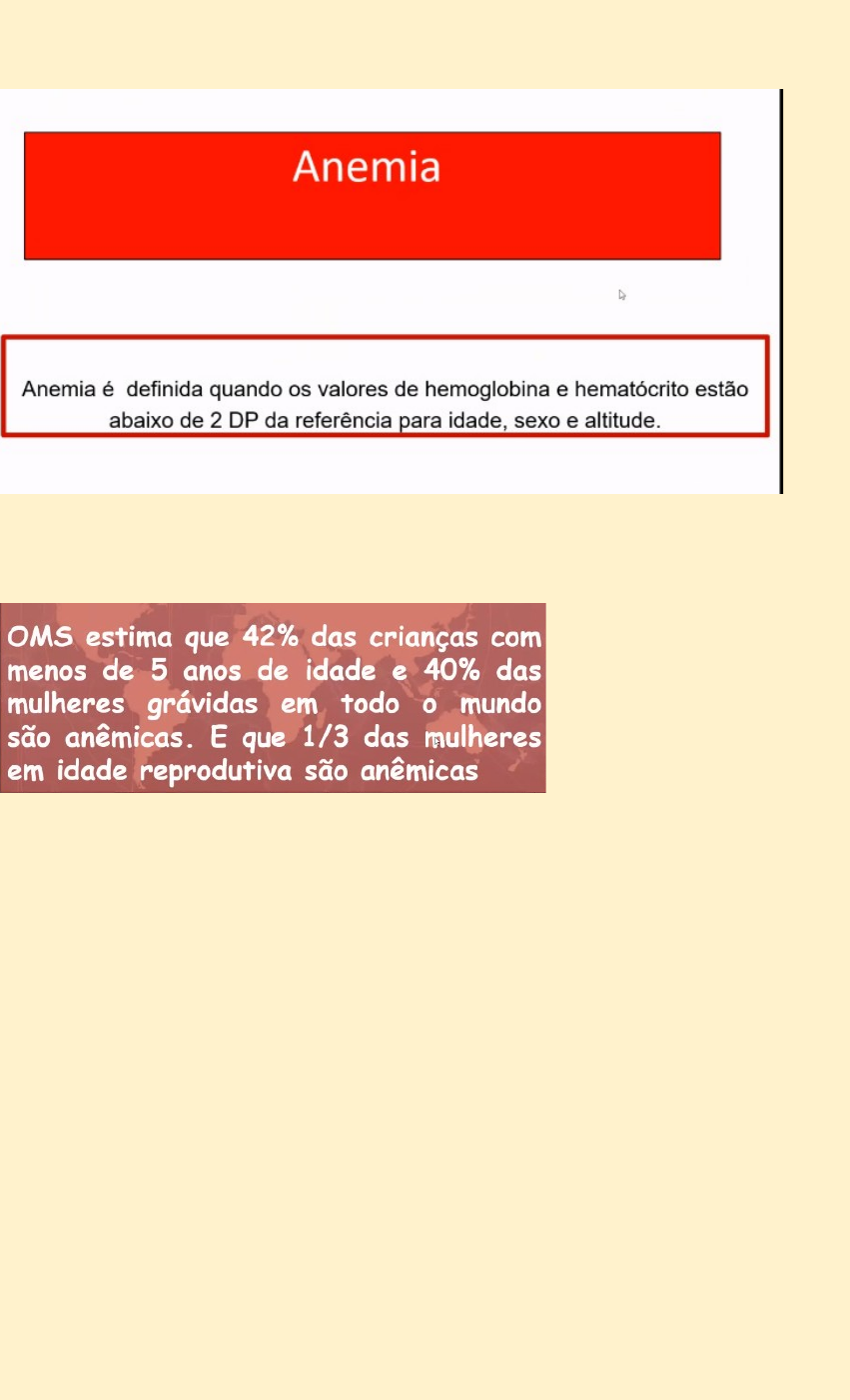 Anemias na infância Afeta mais crianças e mulheres grávidas; Grande número de doenças pode cursar com HB diminuída. A determinação da causa específica é um pré-requisito absoluto para a terapia da anemia. · Anemia ferropriva Hemograma: microcitose e hipocromia. Anemia ferropriva No 6° mês de vida as reservas de ferro da criança se esgotam e ela passa a depender do ferro da dieta. Tratamento · Orientação nutricional · Identificação da causa · Repor o ferro · Via oral é a melhor opção Falha no tratamento · Baixa adesão; · Diagx incorreto; · Perdas sanguíneas; · Má absorção intestinal de ferro; · Defeitos hereditários