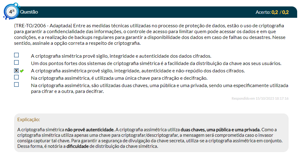 Assymmetric cryptography provides confidentiality, integrity, authenticity, and non-repudiation of encrypted data. Asymmetric cryptography uses only one key for encryption and decryption. Asymmetric cryptography uses two keys, one public and one private, for encryption and decryption. a) Only statement 1 is correct. b) Only statement 2 is correct. c) Only statement 3 is correct. d) Statements 1 and 3 are correct. e) Statements 2 and 3 are correct.