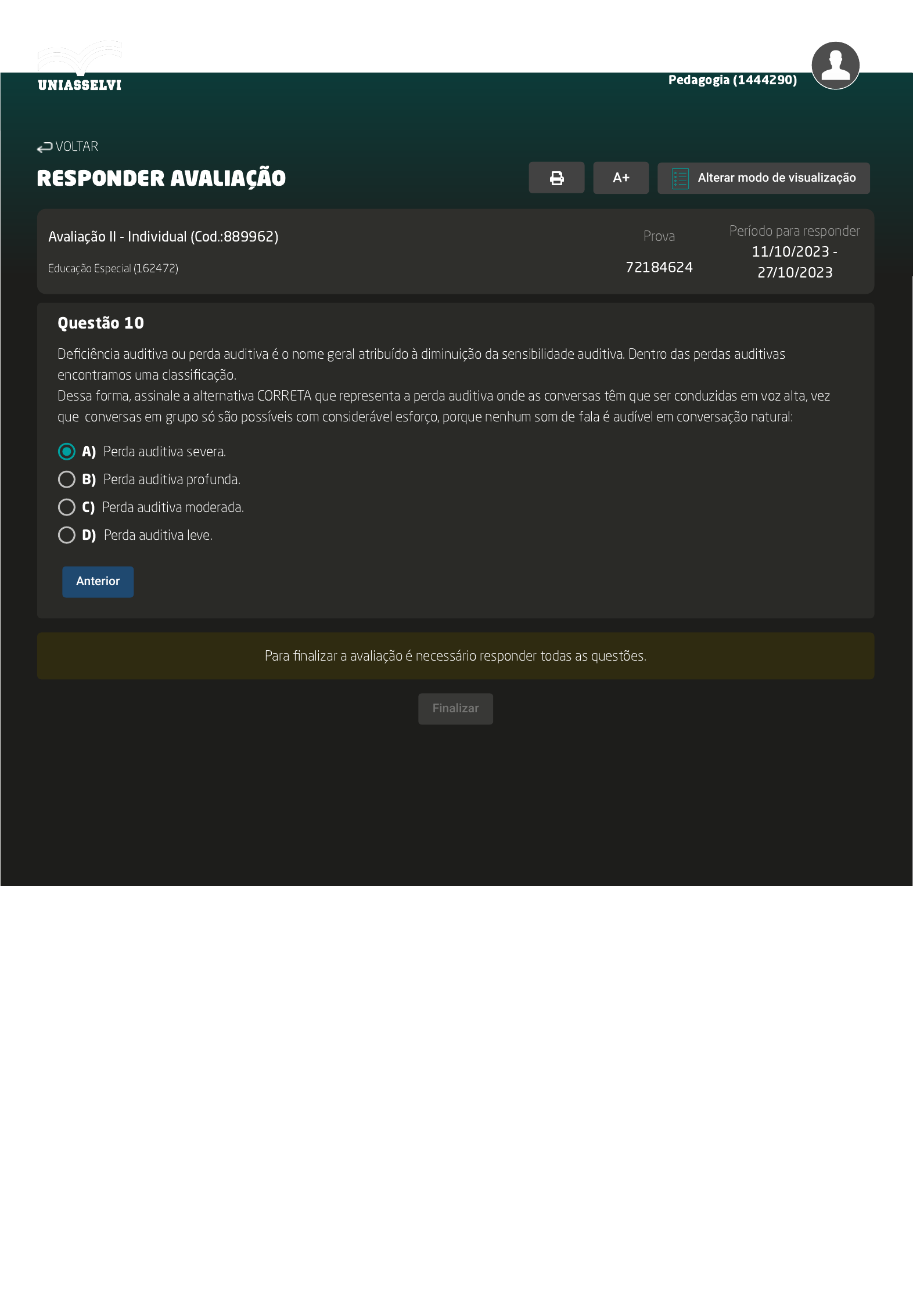 15/10/23, 20:12 AVA https://ava2.uniasselvi.com.br/subject/grades-and-tests/answer/eyJ0ZXN0Ijp7InRlc3RDb2RlIjoiODg5OTYyIiwiZGVzY3JpcHRpb24iOiJBdmFsaWHDp8OjbyBJSSAtIEluZGl2aWR1YWwiLCJwYXJhbWV0ZXIiOjU0OS… 1/1 RESPONDER AVALIAÇÃO Avaliação II - Individual (Cod.:889962) Educação Especial (162472) Prova 72184624 Período para responder 11/10/2023 - 27/10/2023 Questão 10 Deficiência auditiva ou perda auditiva é o nome geral atribuído à diminuição da sensibilidade auditiva. Dentro das perdas auditivas encontramos uma classificação. Dessa forma, assinale a alternativa CORRETA que representa a perda auditiva onde as conversas têm que ser conduzidas em voz alta, vez que conversas em grupo só são possíveis com considerável esforço, porque nenhum som de fala é audível em conversação natural: Para finalizar a avaliação é necessário responder todas as questões. VOLTAR A+ Alterar modo de visualização A) Perda auditiva severa. B) Perda auditiva profunda. C) Perda auditiva moderada. D) Perda auditiva leve. Anterior Finalizar Priscila Vânia Nazario Pedagogia (1444290)