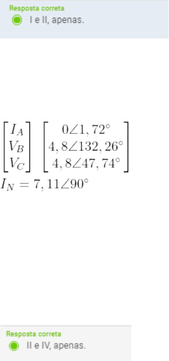 Rodrigo Molgado Engenharia Elétrica GRA1653 Prova N2 1) A sobretensão e a subtensão são fenômenos elétricos que ocorrem quando há variações indesejadas no nível de tensão em um sistema elétrico. A sobretensão ocorre quando a tensão excede o valor nominal. Por outro lado, a subtensão ocorre quando a tensão fica abaixo do valor nominal. Com base no conceito apresentado, avalie as afirmações a seguir: I. Os transitórios com uma duração superior a um minuto podem ser considerados Sobretensão ou Subtensão. II. A sobretensão pode ser causada devido à uma variação brusca em grandes cargas conectadas no sistema elétrico de potência. III. A sobretensão pode ocorrer quando há um número excessivos de carregamento de circuitos que interagem com a rede elétrica. IV. O fenômeno de subtensão pode ocorrer quando existe um excesso de reativo injetado no sistema devido aos bancos de capacitores das indústrias fora do horário de pico. É correto o que se afirma em: 2) Foi identificado uma falha em um gerador trifásico operando a vazio e é necessário saber qual o tipo de falta ocorre para ser solucionada. Considerando as medidas de corrente obtidas, analise as afirmativas em seguida da apresentação das medidas. = I. O gerador sem carga possui uma falta Fase-Terra. II. O gerador sem carga possui uma falta Fase-Fase-Terra. III. O gerador sem carga possui uma falta Fase-Fase. IV. A sequência zero está defasado de 180 graus da sequência positiva, mas com módulos diferentes. Está correto o que se afirma em: 3) A admitância de um elemento é a razão entre a corrente fasorial e a tensão fasorial. Uma matriz de admitâncias corresponde à uma representação de um diagrama de um circuito. Sabemos que a admitância é o inverso da impedância. Com isso, observe a matriz admitância apresentada. Y= Diante disso, assinale a alternativa que apresenta a matriz de impedâncias, correspondente à matriz de admitância apresentada. 4) A admitância de um elemento é a razão entre a corrente fasorial e a tensão fasorial. Uma matriz de admitâncias corresponde à uma representação de um diagrama de um circuito. Sabemos que a admitância é o inverso da impedância. Com isso, observe a matriz admitância apresentada. Y = Na matriz admitância apresentada, o elemento 21 e 12 são nulos, possuindo o valor zero. Isso ocorre devido ao fato de: 5) Na análise de sistemas elétricos de potência é necessário utilizar as ferramentas matemáticas na análise dos sistemas, compreendendo assim o seu comportamento. Dada a matriz abaixo composta por três linhas e uma coluna. A= Assinale a alternativa que apresenta a mesma matriz em coordenadas polar. 6) A proteção de um sistema de distribuição de energia elétrica é fundamental para garantir o fornecimento confiável de eletricidade e a segurança de equipamentos, pessoas e propriedades. Existem várias medidas de proteção empregadas nesses sistemas para prevenir ou minimizar problemas, como sobrecargas, curtos-circuitos e falhas de isolamento. Com base no texto apresentado, avalie as afirmações a seguir. I. Nos ramais onde se exigem cargas especiais, como indústrias e hospitais, deve-se utilizar religadores e/ou seccionadores. II. Sempre que possível, devem ser instaladas mais de quatro chaves fusíveis em série (incluindo a de entrada), pois isso não afeta a coordenação com outros dispositivos. III. Caso a proteção de retaguarda não seja capaz de atuar em razão de uma falta, é necessário instalar uma chave fusível, um religador ou um seccionador. IV. Não se deve utilizar qualquer equipamento de proteção ao longo do alimentador tronco que permita manobra com outro alimentador. É correto o que se afirma em: 7) Um transiente oscilatório é uma tensão ou corrente cujo valor instantâneo muda de polaridade de modo muito rápido, afetando a qualidade de energia de um sistema elétrico. Esse tipo de transiente pode ocasionar diversos efeitos na rede elétrica, prejudicando equipamentos e elementos de proteção. Observe a figura abaixo com um transitório oscilatório. Figura 4: Típico transitório oscilatório de corrente (polaridades negativa e positiva) causado pelo chaveamento de um capacitor de potência. Fonte: Adaptado de DUGAN et al. (2002, p. 17). #PraCegoVer: a figura apresenta um típico transitório oscilatório de corrente (polaridades negativa e positiva) provocado pelo chaveamento de um capacitor de potência. A figura é representada por um plano cartesiano ortogonal, constituído por dois eixos xis (x) e ípsilon (y) perpendiculares entre si que se cruzam na origem. O eixo xis refere-se ao tempo de duração do transitório oscilatório de corrente, que é da ordem de µs. Ele inicia em oito microssegundos (8 µs), atinge dez microssegundos (10 µs), depois chega ao tempo de doze microssegundos (12 µs) e continua até quatorze microssegundos (14 µs). Observe que, ao passar do tempo, a amplitude das oscilações reduzem (amortecimento do transitório). O eixo ípsilon refere-se à intensidade do transitório de corrente, que é da ordem de ampères (A). Ele inicia no zero (0) e vai até sete mil e quinhentos ampères positivos (7500 A) e até sete mil e quinhentos ampères negativos (-7500 A). As oscilações resultantes do processo de chaveamento são representadas por uma linha sólida de cor preta. Ela tem o seu início na origem do plano cartesiano com uma subida abrupta e, logo em seguida, inicia um período oscilatório que vai diminuindo após o chaveamento. O transitório oscilatório mostrado na figura acima pode ser causado por: 8) O correto projeto e dimensionamento dos fusíveis em um sistema de distribuição envolvem a seleção adequada dos fusíveis para proteger os diferentes componentes do sistema, como cabos, transformadores, disjuntores, entre outros. Para isso, devem ser consideradas algumas etapas básicas. Com base no excerto apresentado, avalie as afirmações a segu