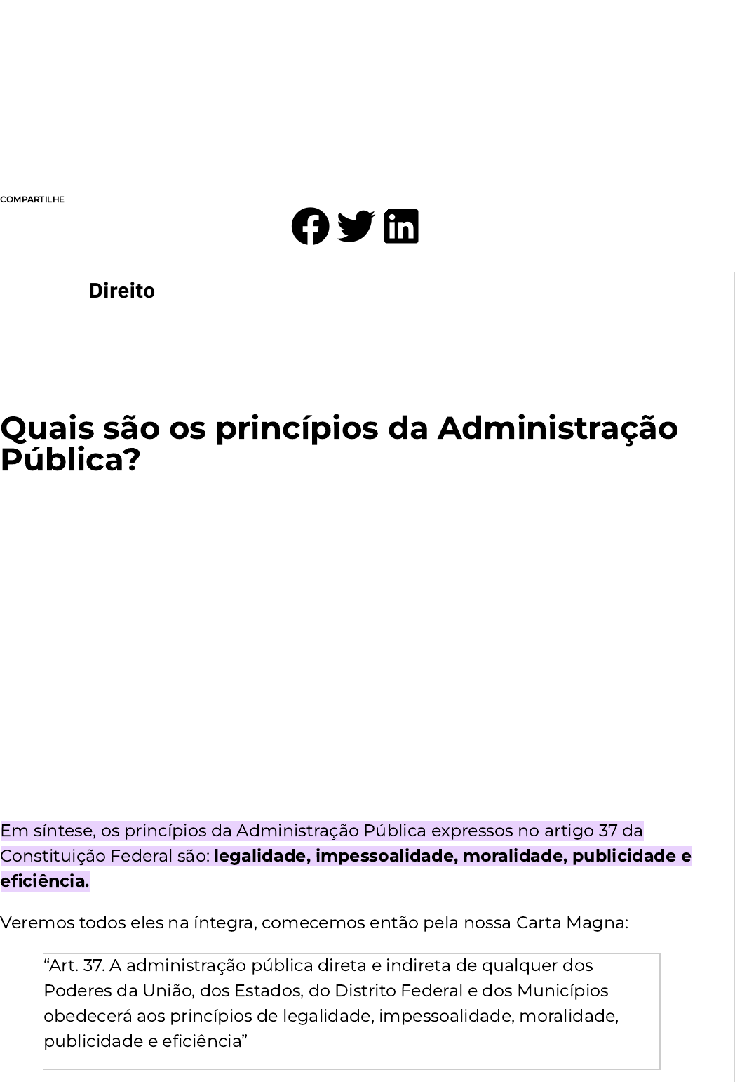 15/10/2023, 11:05 Quais são os princípios da Administração Pública? - Blog do Direito IDP https://direito.idp.edu.br/idp-learning/direito-administrativo/principios-da-administracao-publica/#:~:text=Em síntese%2C os princípios da,%2C m… 1/10 (https://direito.idp.edu.br/idp-learning) COMPARTILHE Direito Administrativo (https://direito.idp.edu.br/idp- learning/categoria/direito-administrativo/) 27/01/2021(https://direito.idp.edu.br/idp-learning/2021/01/27/) 5 minutos Quais são os princípios da Administração Pública? Em síntese, os princípios da Administração Pública expressos no artigo 37 da Constituição Federal são: legalidade, impessoalidade, moralidade, publicidade e e�ciência. Veremos todos eles na íntegra, comecemos então pela nossa Carta Magna: “Art. 37. A administração pública direta e indireta de qualquer dos Poderes da União, dos Estados, do Distrito Federal e dos Municípios obedecerá aos princípios de legalidade, impessoalidade, moralidade, publicidade e e�ciência” https://direito.idp.edu.br/idp-learning https://direito.idp.edu.br/idp-learning/categoria/direito-administrativo/ https://direito.idp.edu.br/idp-learning/categoria/direito-administrativo/ https://direito.idp.edu.br/idp-learning/categoria/direito-administrativo/ https://direito.idp.edu.br/idp-learning/2021/01/27/ 15/10/2023, 11:05 Quais são os princípios da Administração Pública? - Blog do Direito IDP https://direito.idp.edu.br/idp-learning/direito-administrativo/principios-da-administracao-publica/#:~:text=Em síntese%2C os princípios da,%2C m… 2/10 Ademais, a Lei nº 9.784/99 (http://www.planalto.gov.br/ccivil_03/leis/l9784.htm), faz referência aos princípios da legalidade, �nalidade, motivação, razoabilidade, proporcionalidade, moralidade, ampla defesa, contraditório, segurança jurídica, interesse público e e�ciência. Analogamente, outras leis fazem também referência a princípios da Administração Pública, como a Lei nº 8.666/93 (http://www.planalto.gov.br/ccivil_03/leis/l8666cons.htm) (licitação e contrato) e a Lei nº 8.987/95 (http://www.planalto.gov.br/ccivil_03/leis/L8987compilada.htm) (concessão e permissão de serviço público). Acima de tudo, ressalta-se que os princípios do Direito Administrativo buscam estabelecer o equilíbrio entre os direitos dos administrados e as garantias da Administração Pública. Conforme ilustre doutrinadora Di Pietro: “Os dois princípios fundamentais e que decorrem da assinalada bipolaridade do Direito Administrativo – liberdade do indivíduo e autoridade da Administração – são os princípios da legalidade e da supremacia do interesse público sobre o particular, que não são especí�cos do Direito Administrativo porque informam todos os ramos do direito público; no entanto, são essenciais, porque, a partir deles, constroem-se todos os demais.” Então, desvendar tais princípios da Administração Pública é entender as proposições básicas, alicerces, que estruturam o próprio ente público. Certamente é conhecimento estratégico para o pro�ssional que pretende advogar no Direito Administrativo ou estudar para concurso público. Con�ra também o artigo sobre “Advogar ou concurso público: qual vale a pena? (https://online.idp.edu.br/curso/direito-administrativo/? utm_source=blog&utm_medium=artigo&utm_term=link- interno&utm_content=principios-administracao-publica&utm_campaign=PGDA)”. Agora, abordaremos de maneira detalhada os princípios da Administração Pública expressos na Constituição Federal de 1988. Princípio da legalidade Conforme o princípio da legalidade e como o próprio nome induz, a Administração Pública pode somente fazer o que é permitido por lei. http://www.planalto.gov.br/ccivil_03/leis/l9784.htm http://www.planalto.gov.br/ccivil_03/leis/l9784.htm http://www.planalto.gov.br/ccivil_03/leis/l8666cons.htm http://www.planalto.gov.br/ccivil_03/leis/l8666cons.htm http://www.planalto.gov.br/ccivil_03/leis/L8987compilada.htm http://www.planalto.gov.br/ccivil_03/leis/L8987compilada.htm https://online.idp.edu.br/curso/direito-administrativo/?utm_source=blog&utm_medium=artigo&utm_term=link-interno&utm_content=principios-administracao-publica&utm_campaign=PGDA https://online.idp.edu.br/curso/direito-administrativo/?utm_source=blog&utm_medium=artigo&utm_term=link-interno&utm_content=principios-administracao-publica&utm_campaign=PGDA https://online.idp.edu.br/curso/direito-administrativo/?utm_source=blog&utm_medium=artigo&utm_term=link-interno&utm_content=principios-administracao-publica&utm_campaign=PGDA https://online.idp.edu.br/curso/direito-administrativo/?utm_source=blog&utm_medium=artigo&utm_term=link-interno&utm_content=principios-administracao-publica&utm_campaign=PGDA 15/10/2023, 11:05 Quais são os princípios da Administração Pública? - Blog do Direito IDP https://direito.idp.edu.br/idp-learning/direito-administrativo/principios-da-administracao-publica/#:~:text=Em síntese%2C os princípios da,%2C m… 3/10 De certo, este princípio é uma das principais garantias para o respeito aos direitos individuais. Isso porque ele estipula os limites das ações administrativas. A consequência disso, inegavelmente, é restringir o exercício sobressaltado de prerrogativas do Estado. Segundo Di Pietro: “Este princípio, juntamente com o de controle da Administração pelo Poder Judiciário, nasceu com o Estado de Direito e constitui uma das principais garantias de respeito aos direitos individuais. Isto porque a lei, ao mesmo tempo em que os de�ne, estabelece também os limites da atuação administrativa que tenha por objeto a restrição ao exercício de tais direitos em benefício da coletividade”. Enquanto que para o indivíduo rege a máxima que “ninguém será obrigado a fazer ou deixar de fazer alguma coisa senão em virtude de lei” (artigo 5º, inciso II, da Constituição Federal), para a Administração incide decerto o oposto: somente é per