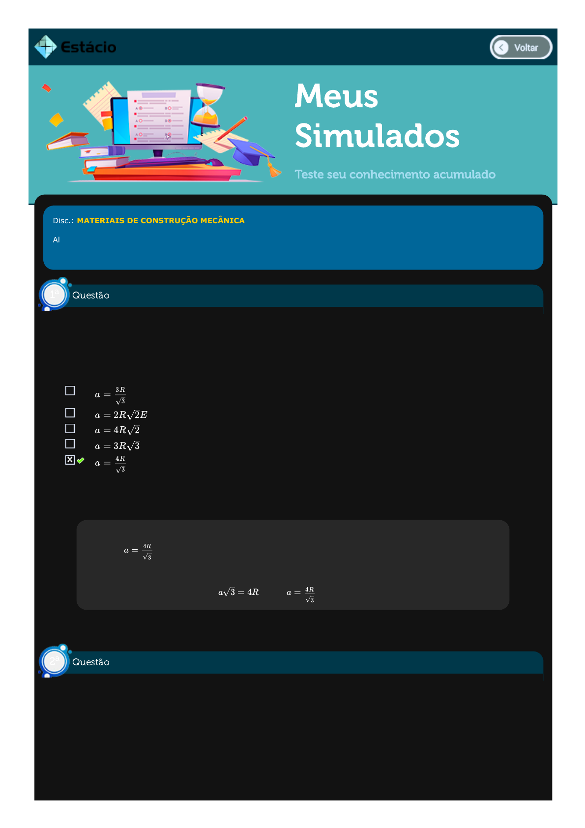 13/11/2022 12:29 Estácio: Alunos https://simulado.estacio.br/alunos/ 1/6 Meus Simulados Teste seu conhecimento acumulado Disc.: MATERIAIS DE CONSTRUÇÃO MECÂNICA Aluno(a): TIAGO BARBOSA SILVA 202008192951 Acertos: 10,0 de 10,0 13/11/2022 Acerto: 1,0 / 1,0 (UFGD / 2019) Os metais são considerados materiais cristalinos, isto é, apresentam um arranjo periódico ou repetitivo no posicionamento de seus átomos. Basicamente, na maioria dos metais mais comuns, existem três tipos de estruturas cristalinas: cúbica de faces centradas (CFC), cúbica de corpo centrado (CCC) e hexagonal compacta (HC). A subdivisão da estrutura cristalina é chamada de célula unitária. A célula unitária da estrutura cristalina CCC apresenta o formato cúbico. Sendo assim, qual é a relação entre o raio atômico (R) e o comprimento da aresta do cubo (a) da estrutura cristalina CCC? Respondido em 13/11/2022 12:07:52 Explicação: Gabarito: Solução: A estrutura cristalina cúbica de corpo centrado apresenta um átomo em cada vértice do cubo e um átomo central. Utilizando a representação de esferas de mesmo raio R, o átomo central é tangente aos demais. Da geometria, a diagonal do cubo é . Logo, . Acerto: 1,0 / 1,0 (PC - ES / 2019) Informações sobre o controle da microestrutura ou estrutura de fase de um sistema em particular é convenientemente e concisamente exposto em um diagrama de fases. A seguinte figura apresenta o diagrama de fases de uma liga Ni-Cu. Sobre os pontos A e B, é correto afirmar que a = 3R √3 a = 2R√2E a = 4R√2 a = 3R√3 a = 4R √3 a = 4R √3 a√3 = 4R a = 4R √3 Questão1 a Questão2 a https://simulado.estacio.br/alunos/inicio.asp javascript:voltar(); 13/11/2022 12:29 Estácio: Alunos https://simulado.estacio.br/alunos/ 2/6 no ponto A, apenas a fase α está presente e, no ponto B, a composição da fase líquida é de 32% de Ni e 68% de Cu. no ponto A, apenas a fase α está presente e, no ponto B, a composição da fase líquida é de 68% de Ni e 32% de Cu. no ponto A, a composição da fase líquida é de 32% de Ni e 68% e, no ponto B, apenas a fase α está presente. no ponto A, apenas a fase α está presente e, no ponto B, apenas a fase líquida. no ponto A, a composição da fase líquida é de 68% de Ni e 32% e, no ponto B, apenas a fase α está presente. Respondido em 13/11/2022 12:06:05 Explicação: Gabarito: no ponto A, apenas a fase α está presente e, no ponto B, a composição da fase líquida é de 32% de Ni e 68% de Cu. Solução: O diagrama de fases é binário isomorfo para aliga Ni-Cu. Perceba que existem três regiões distintas, sendo duas monofásicas (apenas a fase a /apenas a fase líquida) e uma bifásica (coexistem as fases a e líquida). O ponto A está abaixo da linha Solidus, logo encontra-se na fase a. Já o ponto B, encontra-se na região bifásica. Tomando-se a linha de amarração, passando pelo ponto B, ela intercepta a linha Liquidus numa composição aproximada de 32%p de Ni, logo 68%p de Cu. Acerto: 1,0 / 1,0 (IGP - SC / 2017 - adaptada) A figura a seguir mostra um diagrama de fase binário Bi-Sb (bismuto- antimônio). Neste diagrama é indicado um ponto "A" que corresponde a uma liga Bi-Sb com 60%Sb a 500 ºC. Considere todas as condições quando o equilíbrio de fases é alcançado e escolha a opção correta. Na condição indicada pelo ponto "A" a fase "L" possui maior quantidade de Bi que de Sb. A composição do ponto A é de uma liga eutética. Questão3 a 13/11/2022 12:29 Estácio: Alunos https://simulado.estacio.br/alunos/ 3/6 Na condição indicada pelo ponto "A" as fases "α" e "L" possuem 40%Bi. Na condição indicada pelo ponto "A" a fase "α" terá 60% de Sb. Na condição indicada pelo ponto "A" a fase "α" possui maior quantidade de Bi que de Sb. Respondido em 13/11/2022 12:09:47 Explicação: Gabarito: Na condição indicada pelo ponto "A" a fase "L" possui maior quantidade de Bi que de Sb. Solução: A partir do diagrama de fases apresentado na questão, o ponto A encontra-se numa região bifásica (líquido e a). A liga em questão apresenta, no ponto A, 60%p de antimônio (Sb) e 40%p de bismuto (Bi). Traçando-se uma linha de amarração pelo ponto A, essa encontra a linha Liquidus em que a composição do Sb é de 40%. Logo, a composição do Bi é de 60%. O diagrama é isomorfo e não eutético. O diagrama de fases da liga metálica binária Ag-Cu apresenta a composição eutética, aproximadamente 72%p Ag - 28%p Cu Acerto: 1,0 / 1,0 (FGV / 2013) Com relação aos metais e suas ligas, analise as afirmativas a seguir. I. O cobre é o melhor condutor de calor e de eletricidade e apresenta ainda excelente deformabilidade e boa resistência à corrosão. II. O alumínio apresenta boa condutibilidade térmica, relativamente alta condutibilidade elétrica e baixo peso específico. III. O alumínio e suas ligas podem ser utilizados em vários setores industriais como, por exemplo, aeronáutica, automobilística e naval. Assinale: Se somente as afirmativas I e III estiverem corretas. Se somente a afirmativa II estiver correta. Se somente a afirmativa III estiver correta. Se somente as afirmativas II e III estiverem corretas. Se somente a afirmativa I estiver correta. Respondido em 13/11/2022 12:12:29 Explicação: Gabarito: Se somente as afirmativas II e III estiverem corretas. Solução: A prata apresenta propriedades elétricas superiores as das ligas de cobre. O alumínio apresenta condutibilidades térmica e elétricas boas e peso específico quase 3 vezes menor que o do aço. O alumínio e suas ligas têm uma grande faixa de aplicabilidade na Engenharia. Podem ser utilizados como peças estruturais de aeronaves, como caixas de transmissão de automóveis e como cascos de navios. Acerto: 1,0 / 1,0 (IBFC / 2020 - adaptada) Aços com baixo teor de carbono e com alto teor de carbono têm aplicações distintas na engenharia. A respeito deste tema são feitas as afirmativas. I - Aços com baixo teor de carbono 