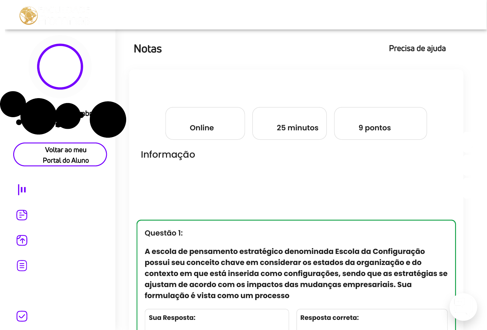 16/10/2023, 22:20 Rever Avaliação Notas Precisa de ajuda Rever Avaliação Gestão Estratégica das Organizações Tipo de avaliação Online Tempo utilizado 25 minutos Sua nota de avaliação 9 pontos Informação A contestação da questão poderá ser feita em até 7 dias após a realização da avaliação, clicando em "contestar questão", após este prazo não será mais permitido realizar a contestação. Descreva o porquê não concorda com o gabarito de cada questão baseando-se no material didático fornecido. Questão 1: A escola de pensamento estratégico denominada Escola da Configuração possui seu conceito chave em considerar os estados da organização e do contexto em que está inserida como configurações, sendo que as estratégias se ajustam de acordo com os impactos das mudanças empresariais. Sua formulação é vista como um processo Sua Resposta: Resposta correta: Voltar ao meu Portal do Aluno André Luís de Coimbra RA: 227207 Início Carteirinha Estudantil Disciplinas Avaliações Minhas Notas Agenda Educacional Extensão CursoGESTÃO ESTRATÉGICA DAS ORGANIZAÇÕES Carga Horária 60 horas Sair https://alunos.institutoprominas.com.br/meus-cursos https://ava.institutoprominas.com.br/dashboard https://ava.institutoprominas.com.br/carteirinha-estudante https://ava.institutoprominas.com.br/disciplines https://ava.institutoprominas.com.br/atividades https://ava.institutoprominas.com.br/notas https://ava.institutoprominas.com.br/agenda-educacional https://alunos.institutoprominas.com.br/ https://alunos.institutoprominas.com.br/ https://alunos.institutoprominas.com.br/ https://ava.institutoprominas.com.br/ 16/10/2023, 22:20 Rever Avaliação De transformação. De transformação. Questão 2: São diversos instrumentos que auxiliam a gestão estratégica na organização. Dentre estes, há a matriz SWOT. Referente a esta ferramenta: Sua Resposta: A análise SWOT fornece informações a respeito de desenvolvimento, manutenção, crescimento e sobrevivência organizacional. Resposta correta: A análise SWOT fornece informações a respeito de desenvolvimento, manutenção, crescimento e sobrevivência organizacional. Questão 3: Kaplan e Norton apontam cinco princípios básicos em torno da estratégia, por meio dos quais se faz possível alinhar e focar toda a organização quanto ao seu alcance e para que sejam atingidos resultados além do comum. Dentre estes: Sua Resposta: Traduzir a estratégia em termos operacionais. Resposta correta: Traduzir a estratégia em termos operacionais. Curso Preparatório Simulados Biblioteca https://ava.institutoprominas.com.br/preparatorio https://ava.institutoprominas.com.br/simulados javascript:; 16/10/2023, 22:20 Rever Avaliação Questão 4: Em uma organização administrada estrategicamente pode-se encontrar cinco níveis de planejamento: Sua Resposta: De produto ou mercado, de unidade empresarial, recursos e interesses comuns e em nível corporativo. Resposta correta: De produto ou mercado, de unidade empresarial, recursos e interesses comuns e em nível corporativo. Questão 5: Associe as duas colunas, relacionando as avaliações dos níveis organizacionais internos e externos às medidas que deverão ser adotadas: Avaliações: (1) Sem necessidade de mudança. (2) Mudanças no nível externo. (3) Alterações no nível interno. (4) Mudanças em ambos os níveis. Medidas: ( ) Alterar as metas e/ou intervir internamente. 16/10/2023, 22:20 Rever Avaliação ( ) Manter o curso de ação. ( ) Intervir internamente e alterar as metas. ( ) Alterar as metas. A sequência correta desta classificação é: Sua Resposta: 2,1,3,4 Resposta correta: 2,1,3,4 Questão 6: Avaliação e controle são funções que devem ser aplicadas periodicamente ao processo de gestão estratégica. Mediante este argumento: Sua Resposta: As tomadas de decisão podem advir de avaliações conjuntas, dependendo do nível de controle exercido na organização. Resposta correta: As tomadas de decisão podem advir de avaliações conjuntas, dependendo do nível de controle exercido na organização. Questão 7: Pode-se enumerar três níveis de estratégia organizacional que indicam onde competir, como competir e que influencia o nível tático operacional respectivamente. Elas são denominadas 16/10/2023, 22:20 Rever Avaliação Sua Resposta: Corporativas, Competitivas ou de Negócios e Funcionais. Resposta correta: Corporativas, Competitivas ou de Negócios e Funcionais. Questão 8: Quanto aos elementos que abordam os aspectos organizacionais e de planejamento mais significativos, e que são inerentes à função planejamento, estabelecendo uma ponte entre presente e futuro, respectivamente, é possível determinar que formam a arquitetura estratégica e são Sua Resposta: Os 7S e 7C. Resposta correta: Os 7S e 7C. Questão 9: Quanto aos níveis do Planejamento Estratégico, julgue as seguintes informações: Nível estratégico: planejamento estratégico relacionados a objetivos de longo prazo e as ações para realizá-los. A organização é abordada em alguns segmentos. Executado por todos os níveis organizacionais. Nível tático: aborda objetivos de médio prazo, visa otimização de determinada área e é desenvolvido por gerentes. Nível operacional: implementa ações desenvolvidas pelo nível tático, a partir do comando de um supervisor. Abrange ações de curto prazo. Contestar questão 16/10/2023, 22:20 Rever Avaliação As alternativas são verdadeiras em: Sua Resposta: I, II e III. Resposta correta: II e III somente. Questão 10: Além dos registros de desempenho passado, o Balanced Scorecard possibilita visualizar o futuro. Porque: É uma contribuição inovadora que abrange os objetivos empresariais e sua mensuração. Sobre essas duas afirmativas, é correto afirmar que: Sua Resposta: As duas são verdadeiras, e a segunda é uma justificativa correta da primeira. Resposta correta: As duas são verdadeiras, e a segunda é uma justificativa c