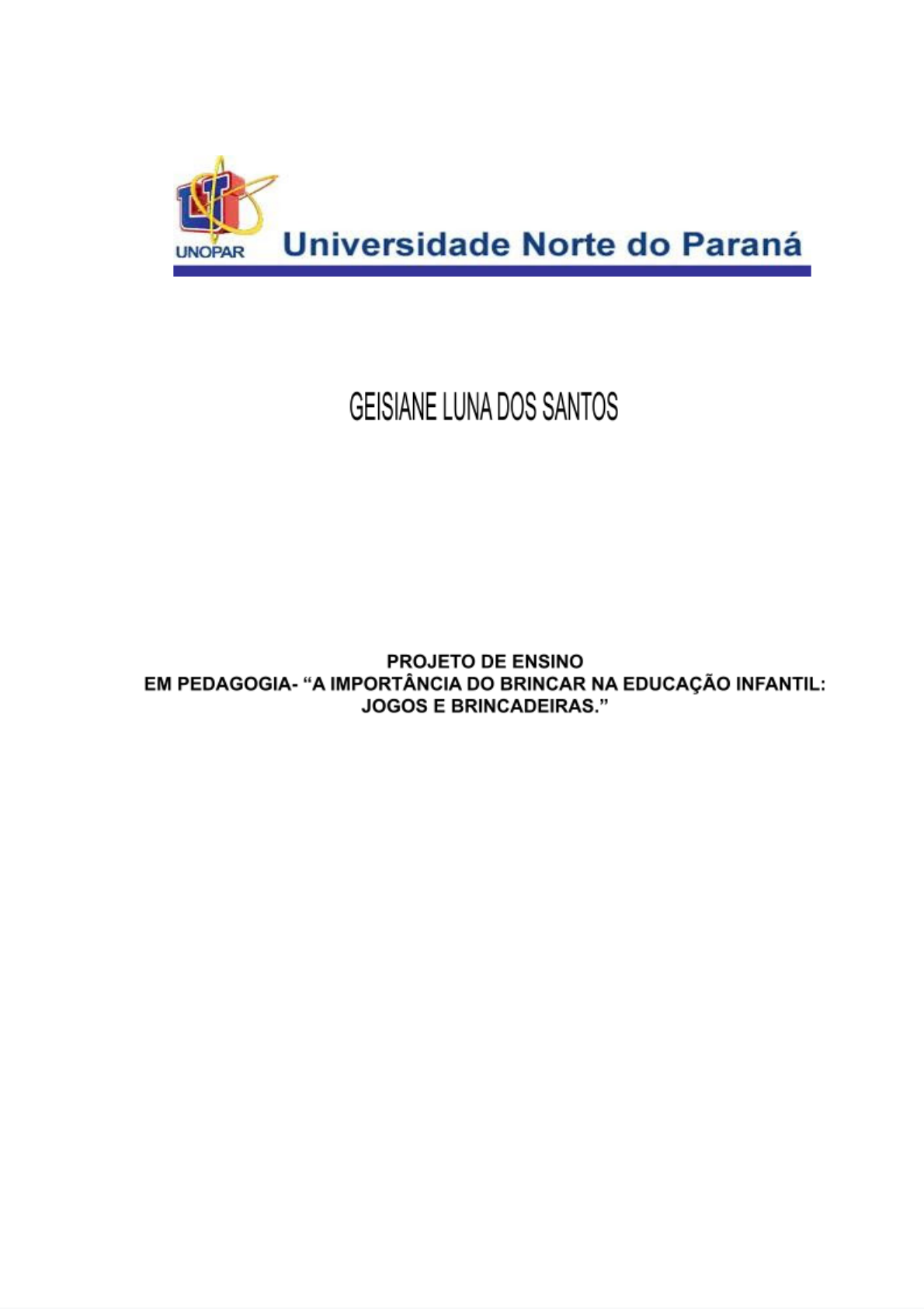 S ISTEMA DE E NSINO A DISTÂNCIA PEDAGOGIA MACEIÓ- AL 2021 Cidade Ano SUMÁRIO INTRODUÇÃO 3 1 TEMA 5 2 JUSTIFICATIVA 6 3 PARTICIPANTES 8 4 OBJETIVOS 9 5 PROBLEMATIZAÇÃO 10 6 REFERENCIAL TEÓRICO 12 7 METODOLOGIA 18 8 CRONOGRAMA 19 9 RECURSOS 20 10 AVALIAÇÃO 21 CONSIDERAÇÕES FINAIS 22 REFERÊNCIAS 24 3 INTRODUÇÃO O presente trabalho tem como objeto de Estudo da Importância do Lúdico através dos jogos e brincadeiras na Educação Infantil para aprendizagem dos alunos. Para tal foi realizada uma pesquisa bibliográfica do tema através de livros, revistas, artigos, internet entre outros. Assim foi realizado uma pesquisa teórica objetivando a compreensão do conceito lúdico dos jogos e brincadeiras procurando diagnosticar como os mesmos podem auxiliar na aprendizagem das crianças da educação infantil. Nesta perspectiva a problemática trabalhada foi o lúdico na educação infantil e a importância dos jogos e brincadeiras para a aprendizagem do aluno. O lúdico promove na educação infantil uma prática educacional de conhecimento de mundo, oralidade, pensamento e sentido. Fantacholi ([s/d], p. 5), explica que por meio da ludicidade a criança começa a expressar-se com maior facilidade, ouvir, respeitar e discordar de opiniões, exercendo sua liderança, e sendo liderados e compartilhando sua alegria de brincar. O lúdico é um recurso metodológico de suma importância para auxiliar a aprendizagem das crianças da educação infantil. Os jogos ensinam os conteúdos através de regras, pois possibilita a exploração do ambiente a sua volta, os jogos proporcionam aprendizagem de maneira prazerosa e significativa assim agrega conhecimentos. Segundo Carvalho (1992, p.14), os jogos na vida da criança são de fundamental importância, pois quando brinca, explora e manuseia tudo aquilo que está à sua volta, através de esforços físicos se mentais e sem se sentir coagida pelo adulto, começa a ter sentimentos de liberdade. O jogo é um instrumento pedagógico muito significativo. No contexto cultural e biológico é uma atividade livre, alegre que engloba uma significação. É de grande valor social, oferecendo inúmeras possibilidades educacionais, pois favorece o desenvolvimento corporal, estimula a vida psíquica e a inteligência, contribui para a adaptação ao grupo, preparando a criança para viver em sociedade, participando e questionando os pressupostos das relações sociais tais como estão postos. 4 (KISHIMOTO, 1996 p. 26). Assim como os jogos, as brincadeiras são de suma importância para o desenvolvimento da criança na educação infantil, pois através da mesma a criança aprende a respeitar regras e favorece a autonomia da criança. Os jogos e as brincadeiras são fontes inesgotáveis de interação lúdica e afetiva. Para uma aprendizagem eficaz é preciso que o aluno construa o conhecimento, assimile os conteúdos. E o jogo é um excelente recurso para facilitar a aprendizagem (FANTACHOLI [s/d p.6). Segundo Violada (2011, p. 1), as brincadeiras e os jogos são sem dúvida a forma mais natural de despertar na criança a atenção para uma atividade. Os jogos devem ser apresentados gradativamente: por meio do simples brincar, aprimorar a observação, comparação, imaginação e reflexão. Tanto os jogos como as brincadeiras ensinam regras, despertam a atenção, desenvolvem as características pessoais, sociais e culturais da criança e também colaboram para a saúde mental facilitando a socialização, comunicação e expressão das crianças. Porém para que os jogos e brincadeiras tenham sucesso na sua aplicação é necessária a mediação do professor que precisa planejar suas atividades com objetivos pré-estabelecidos a serem alcançados. Ao utilizar jogos e brincadeiras o professor introduz o lúdico no ensino aprendizagem para o aluno da educação infantil, isto contribui para conhecimento da criança. A partir da problemática levantada o objetivo geral foi refletir sobre a importância dos jogos e das brincadeiras, numa perspectiva lúdica, no processo de ensino aprendizagem do aluno da educação infantil. Para tanto, os objetivos específicos foram: Realizar um estudo bibliográfico sobre a importância dos jogos e brincadeiras numa perspectiva lúdica, para a educação infantil; Identificar os benefícios das atividades lúdicas na educação infantil. Assim, se o lúdico através dos jogos e as brincadeiras forem mediados pelo professor, são ferramentas que proporcionam a aprendizagem para os alunos da educação infantil. 5 1 TEMA O que me motivou a escolher este tema foi presenciar situações em que professores cansados e desmotivados não fazem certas rotinas, que parecem bobas, mas que para as crianças é de grande importância, por ser uma maneira agradável de lidar com crianças, portanto, buscamos com este tema mostrar a importância que os jogos e brincadeiras têm no cotidiano das crianças, também porque acreditamos que a Educação Infantil é base para todas as etapas do processo educacional, formando assim, cidadãos críticos, reflexivos, capazes de agir e resolver situações problemas durante todo processo de ensino. “A compreensão das brincadeiras e recuperação do sentido lúdico de cada povo depende do modo de vida de cada agrupamento humano, em seu tempo e seu espaço” (KISHIMOTO, 2004, p. 63). O interesse pelo tema “A importância dos jogos e brincadeiras na Educação Infantil”, partiu da prática educacional com crianças na faixa etária de 3 a 5 anos. Na prática, observamos que as crianças aprendiam com mais facilidade através dos jogos e brincadeiras. Por esse motivo, o trabalho com jogos e brincadeiras tornou-se de grande relevância na medida em que toda dinâmica e estrutura estão presentes nos períodos de desenvolvimento e socialização da criança. Considera-se que os jogos e brincadeiras são tidos como fundamentação social e cultural, bem como a forma de atividade, o sujeito e